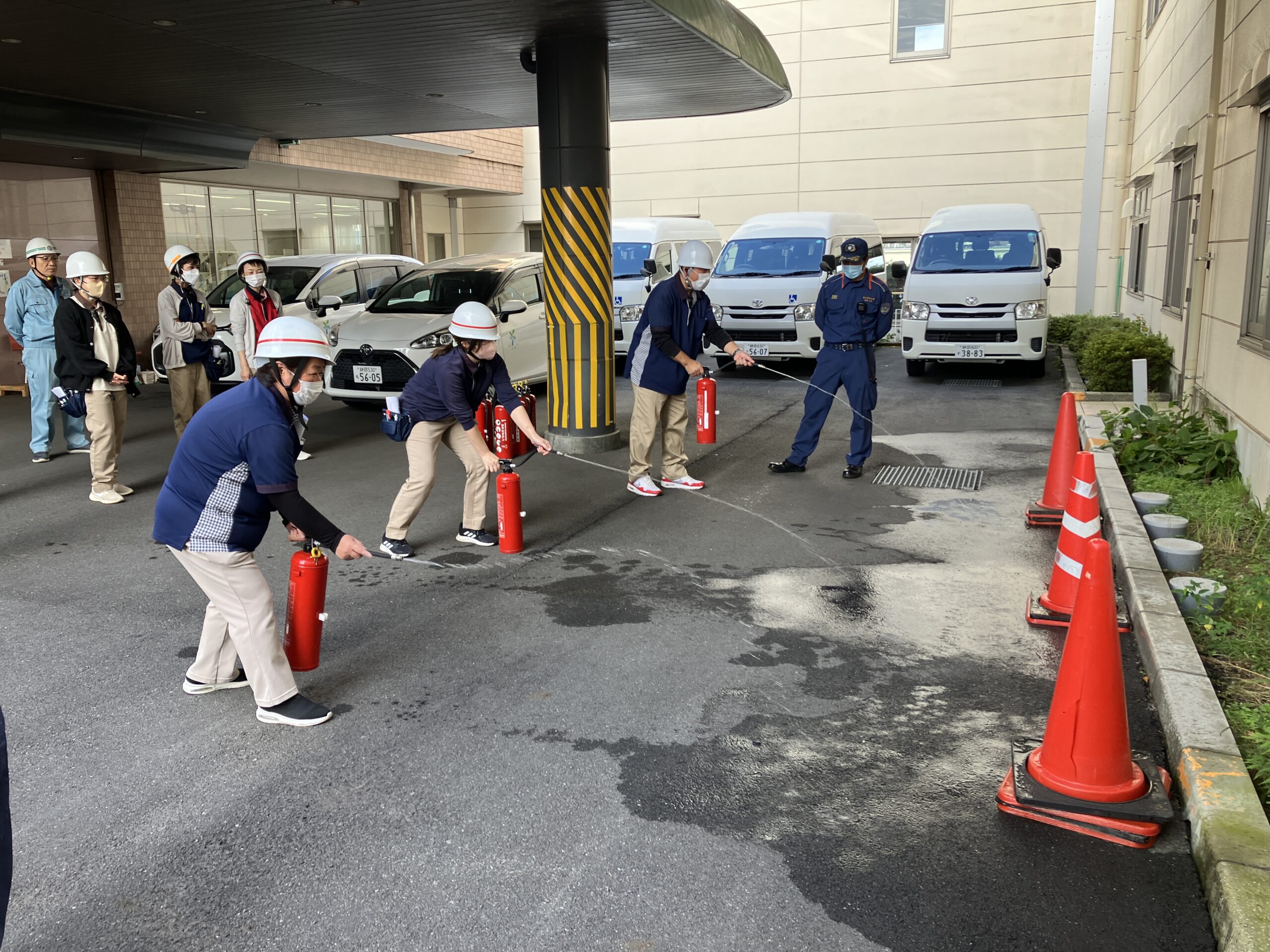万が一の火災に備え、避難経路・順序確認、搬送法、消火訓練を行いました。