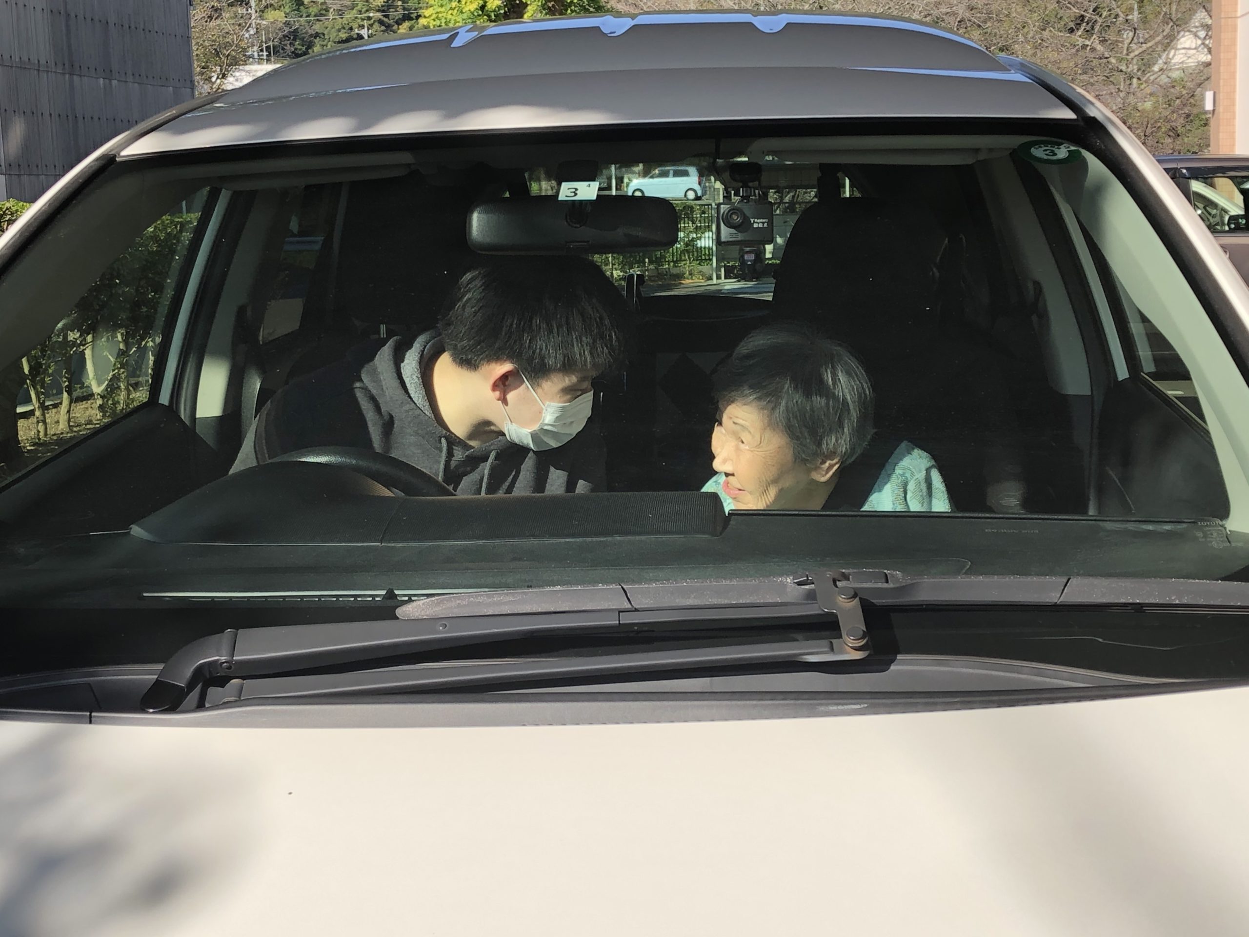 車に乗り込む時も、後ろで軽く支えれば殆どご自分で行えます。車に乗って、職員と目を合わせ、にっこり。