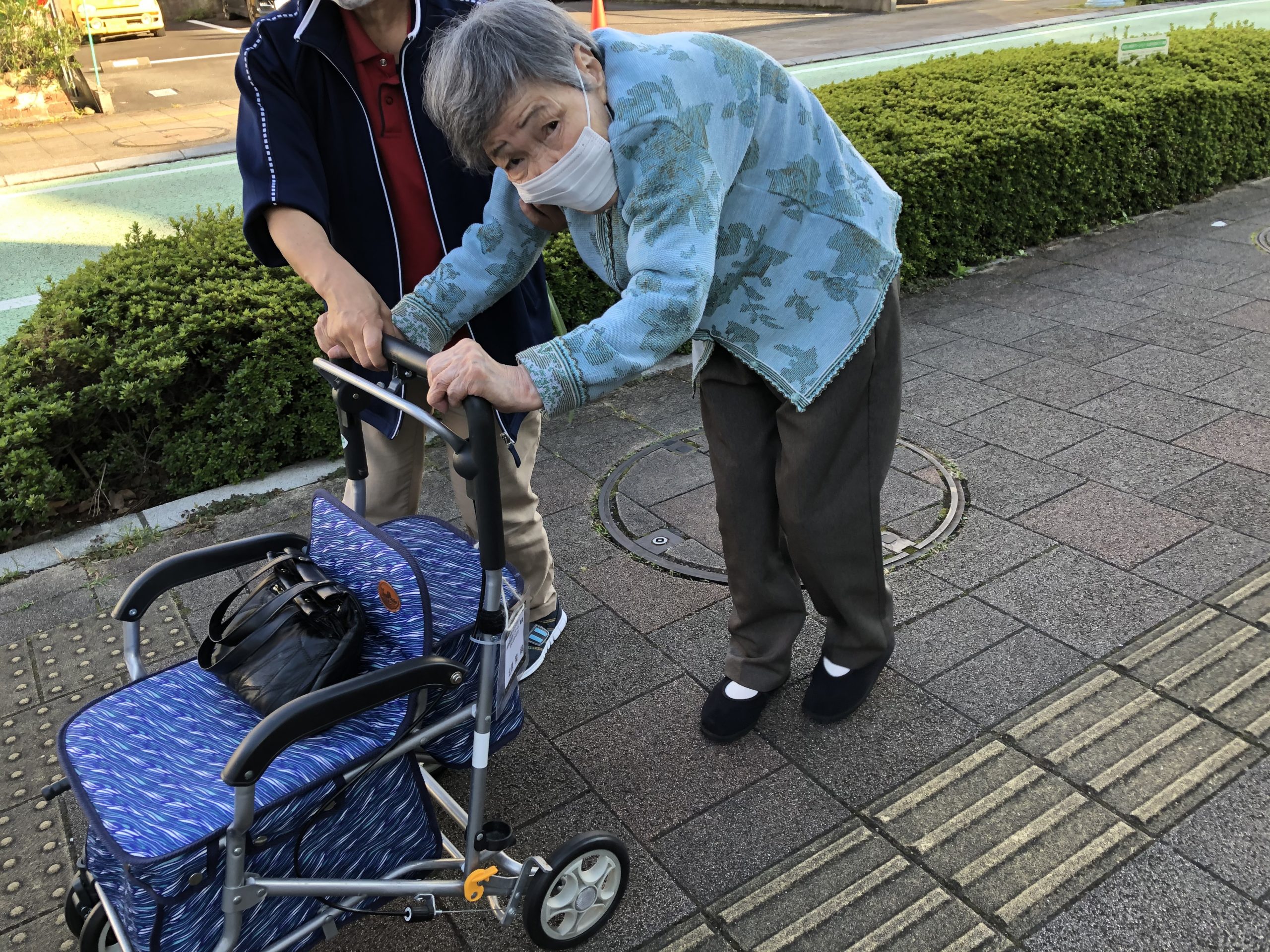 一生懸命、歩く練習をしたK様。外の道路は、斜面や溝等ありますが、ご自分でゆっくり歩けています。