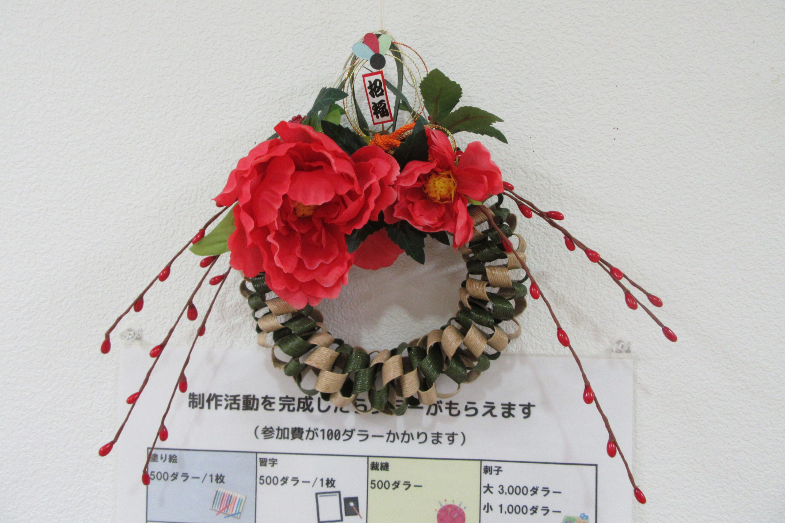 こちらのリースはかご作りの時に使う紐を使って作ったリースです。職員Tさんの力作です。来年はコロナもおさまり、安心した世の中になりますようにと願いを込めて作ってくれました。
