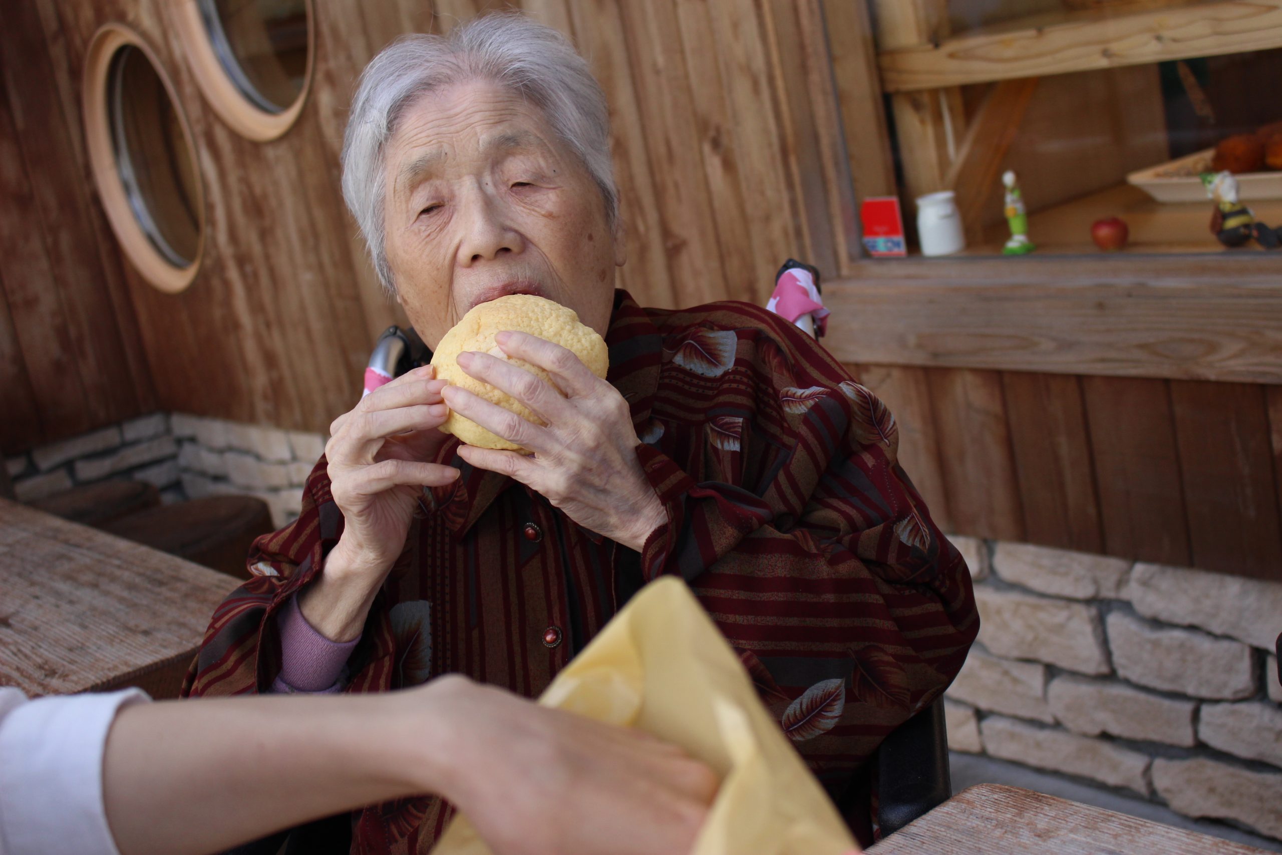 試食を食べ各々ご自分の好きなパンを吟味し、外のベンチでパクリ。美味しいパンに皆さま顔がほころんでおりました。