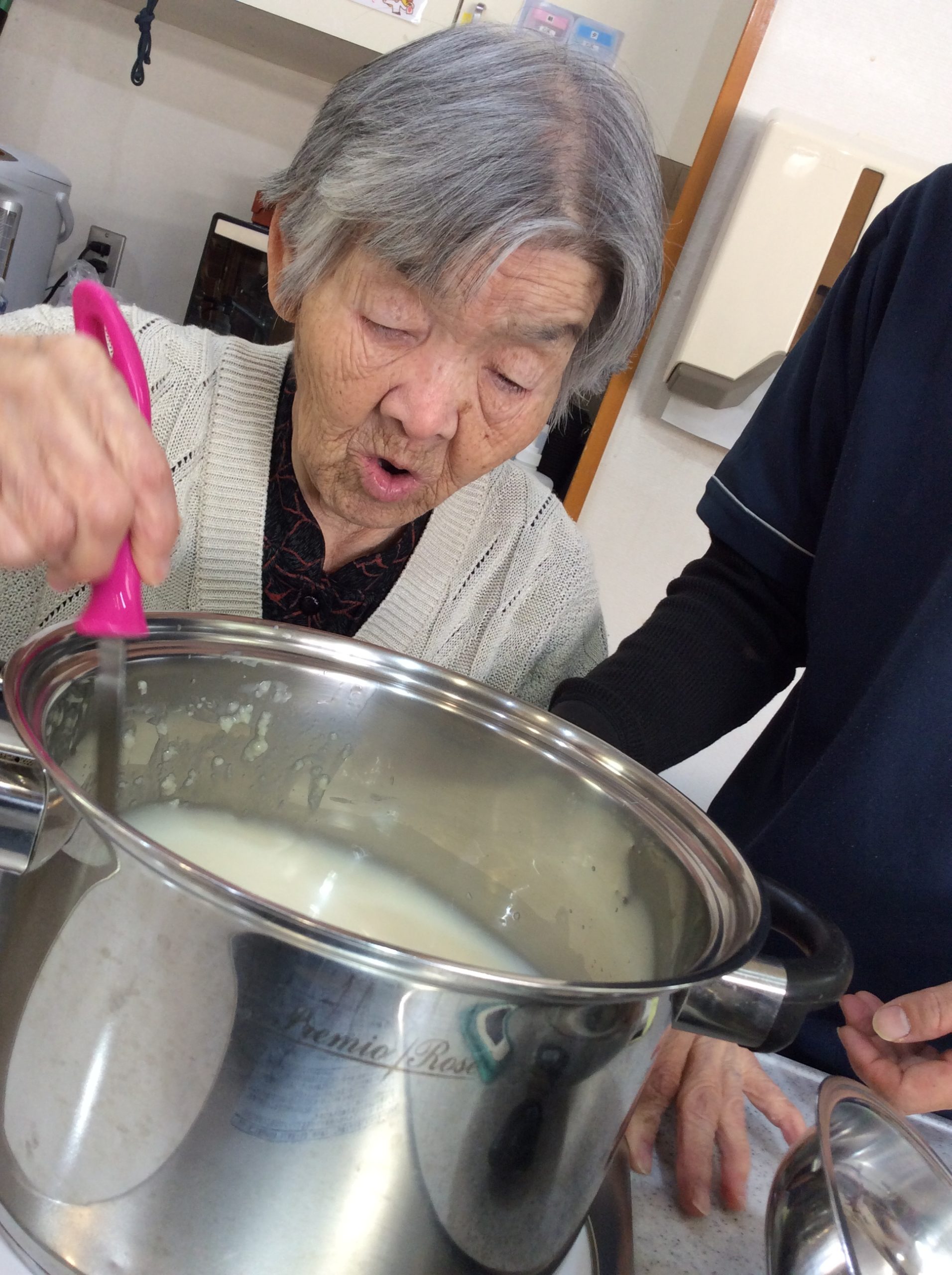 お正月ということで甘酒作りをしました。お鍋に甘酒を入れるお手伝いを進んで行ってくれました。