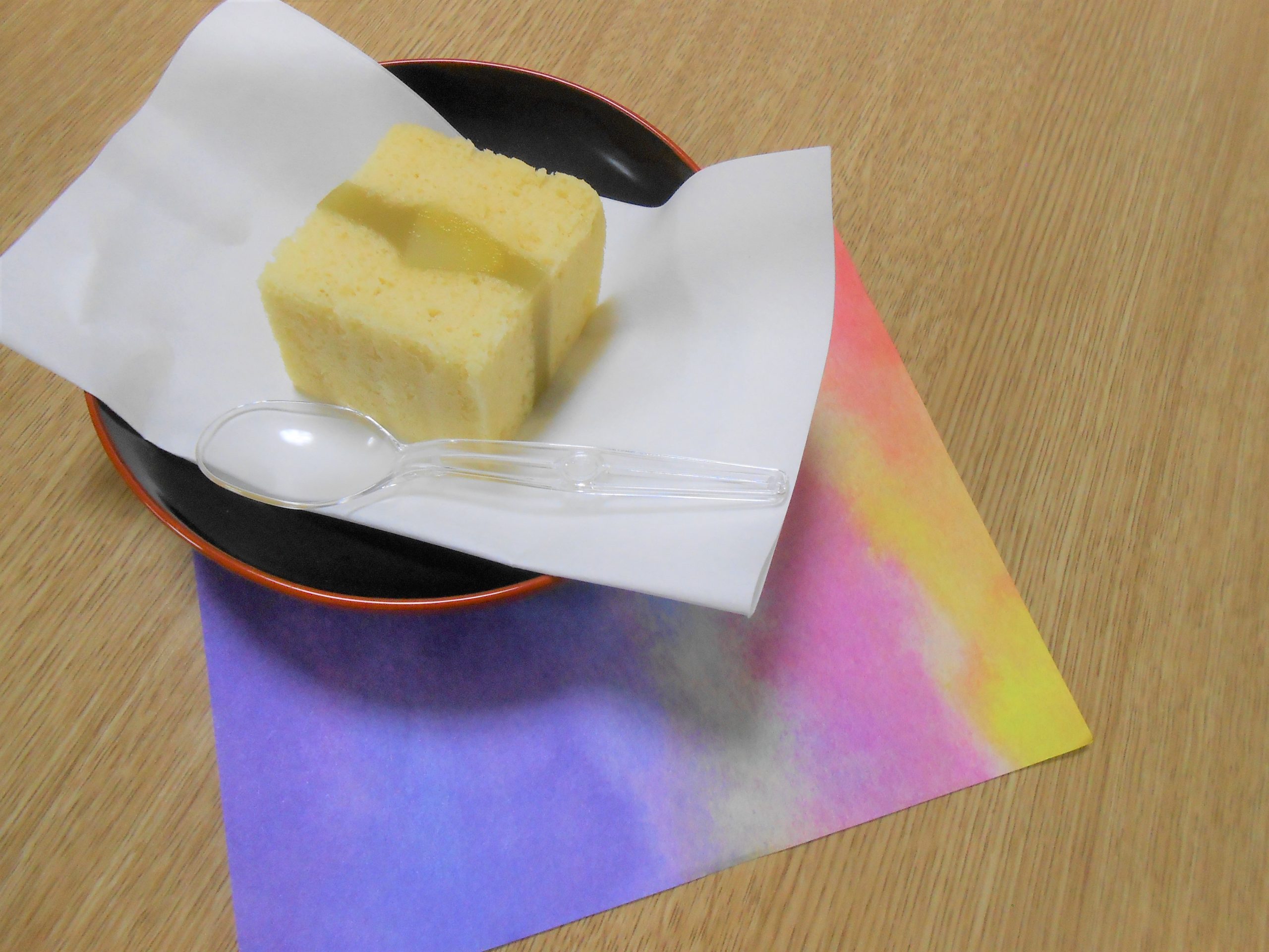 お茶菓子は、藤枝産の新栗を使ったきんとんを挟んだカステラサンドで