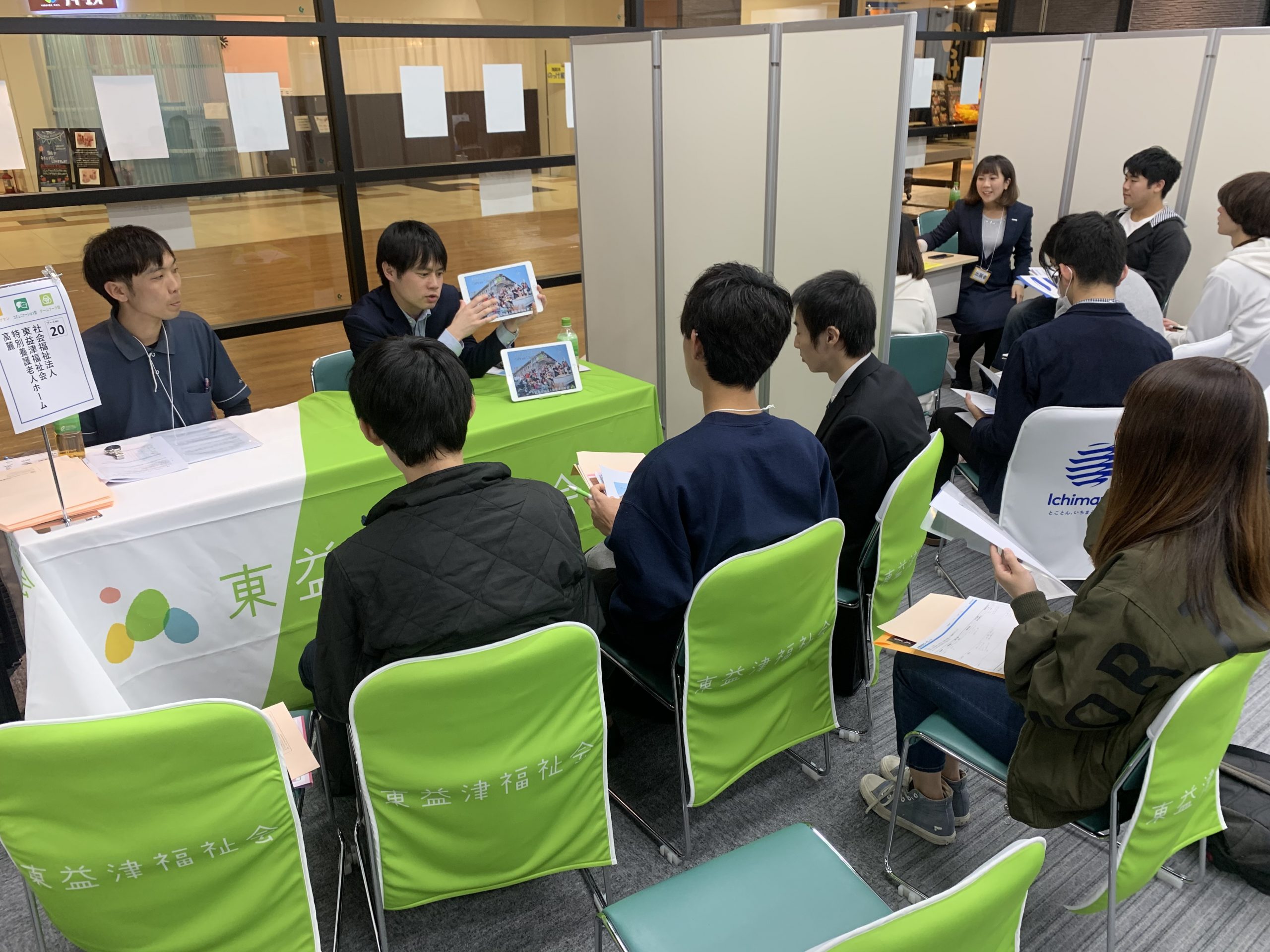 くの学生の皆様が寄ってお話を聞いて下さり、介護サービスに興味を持って頂きました。