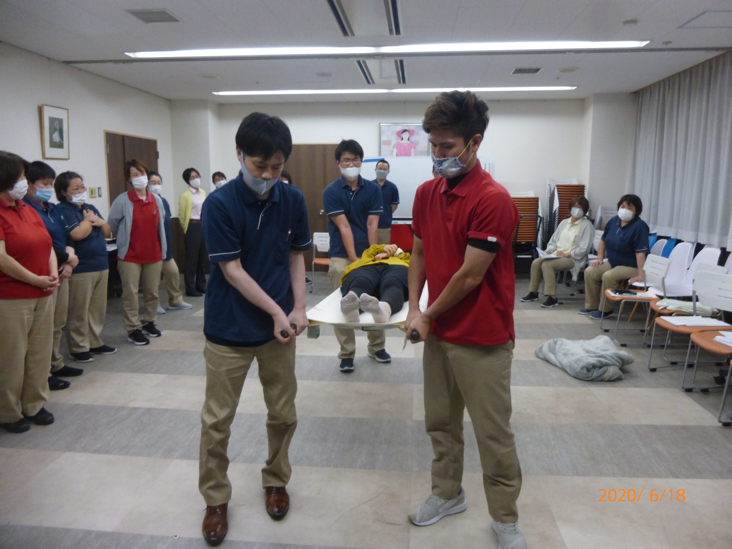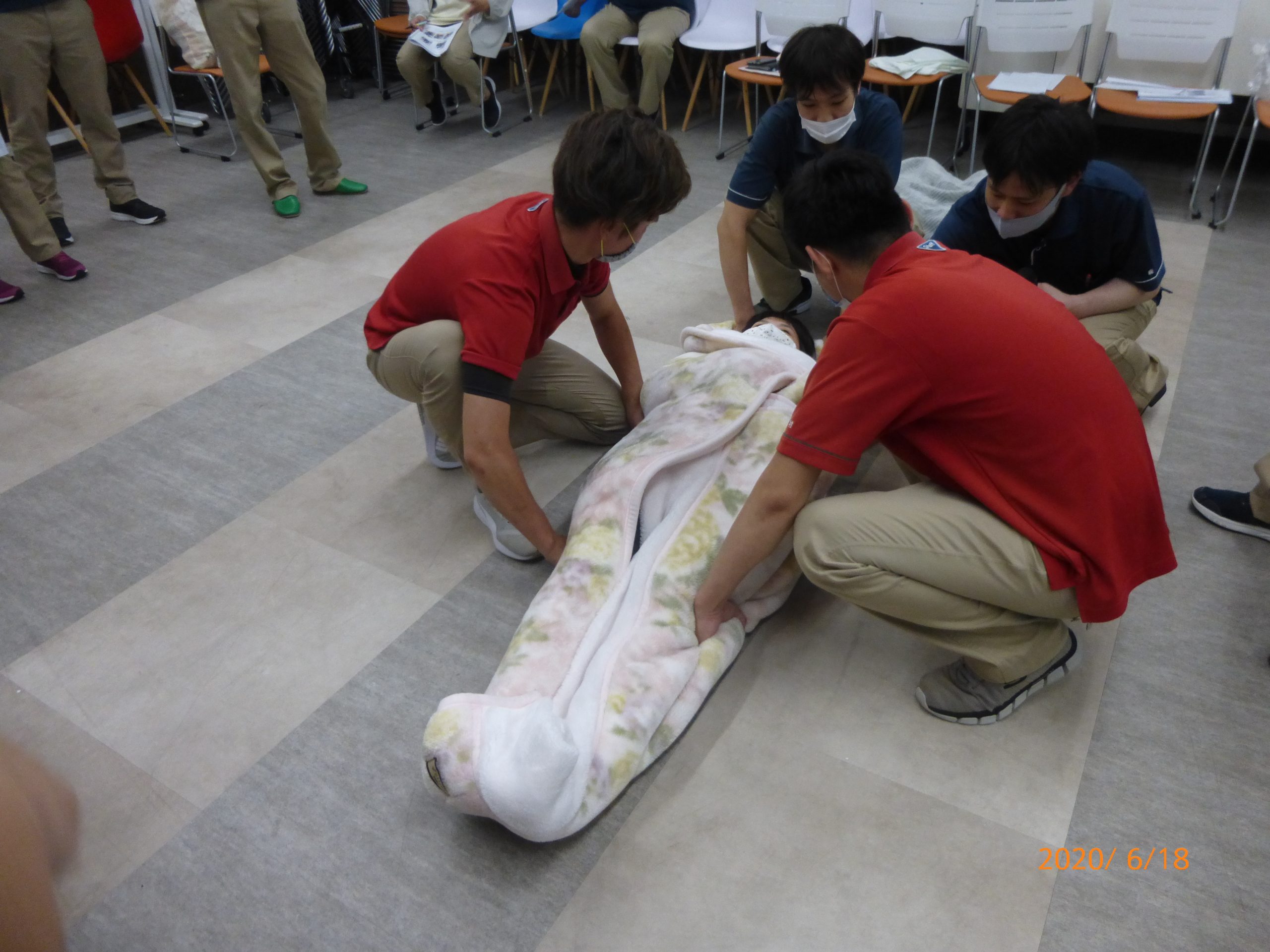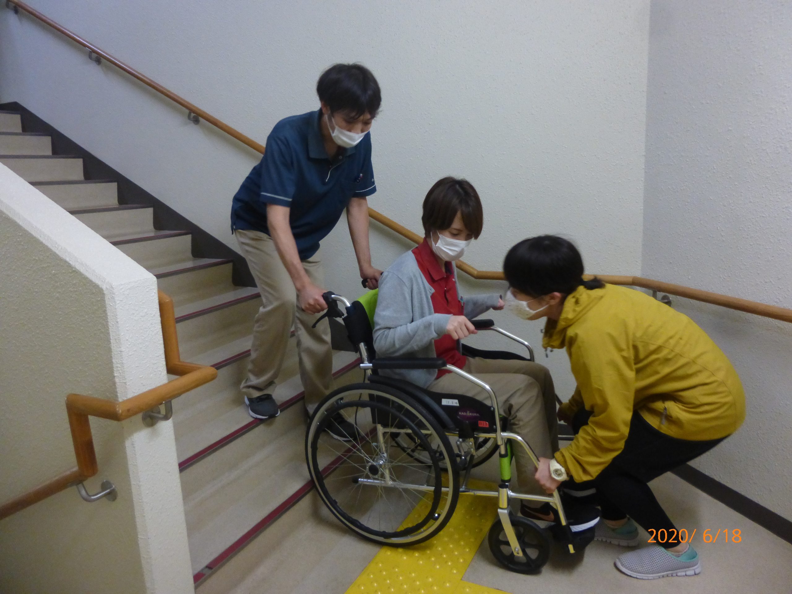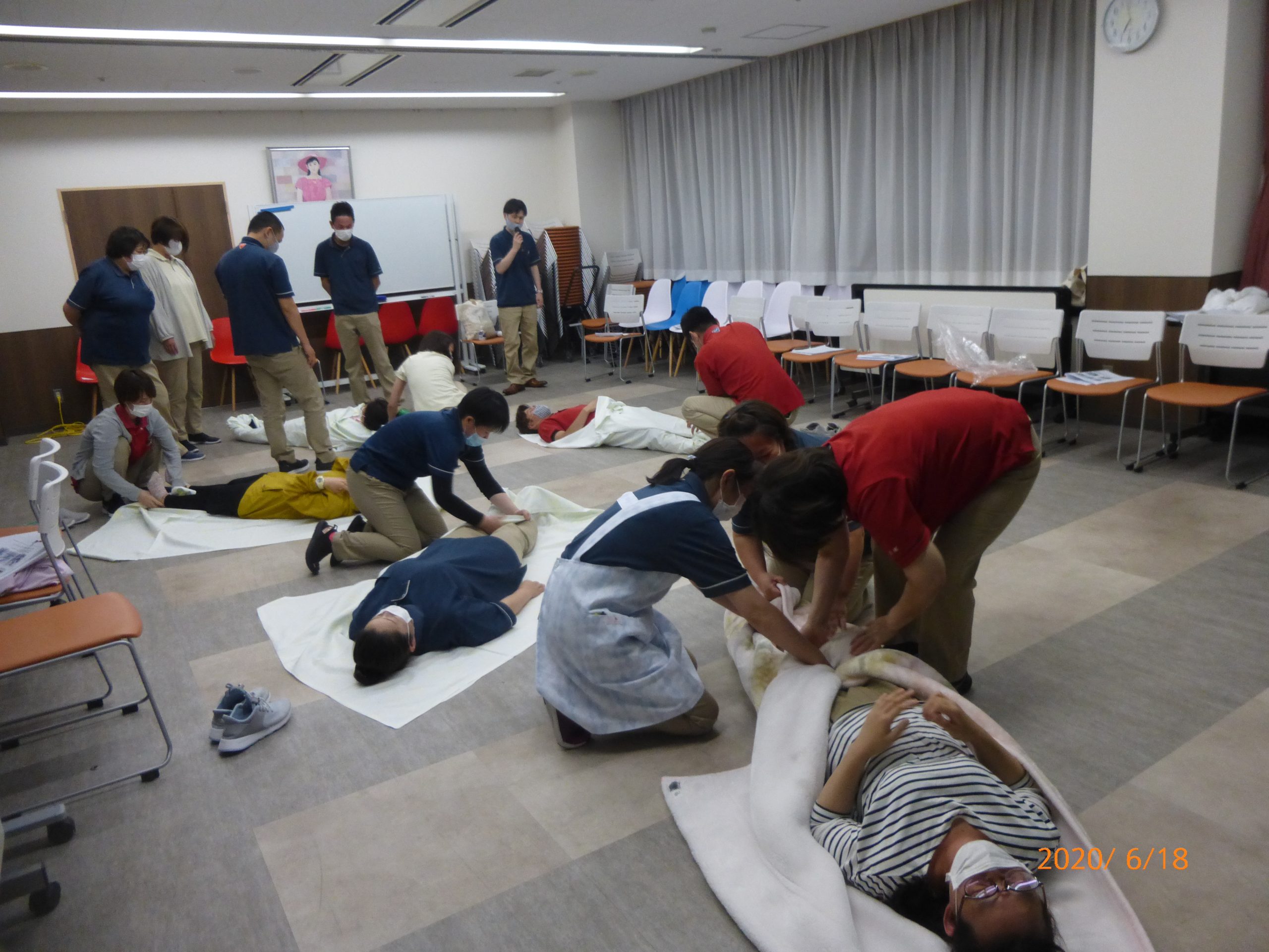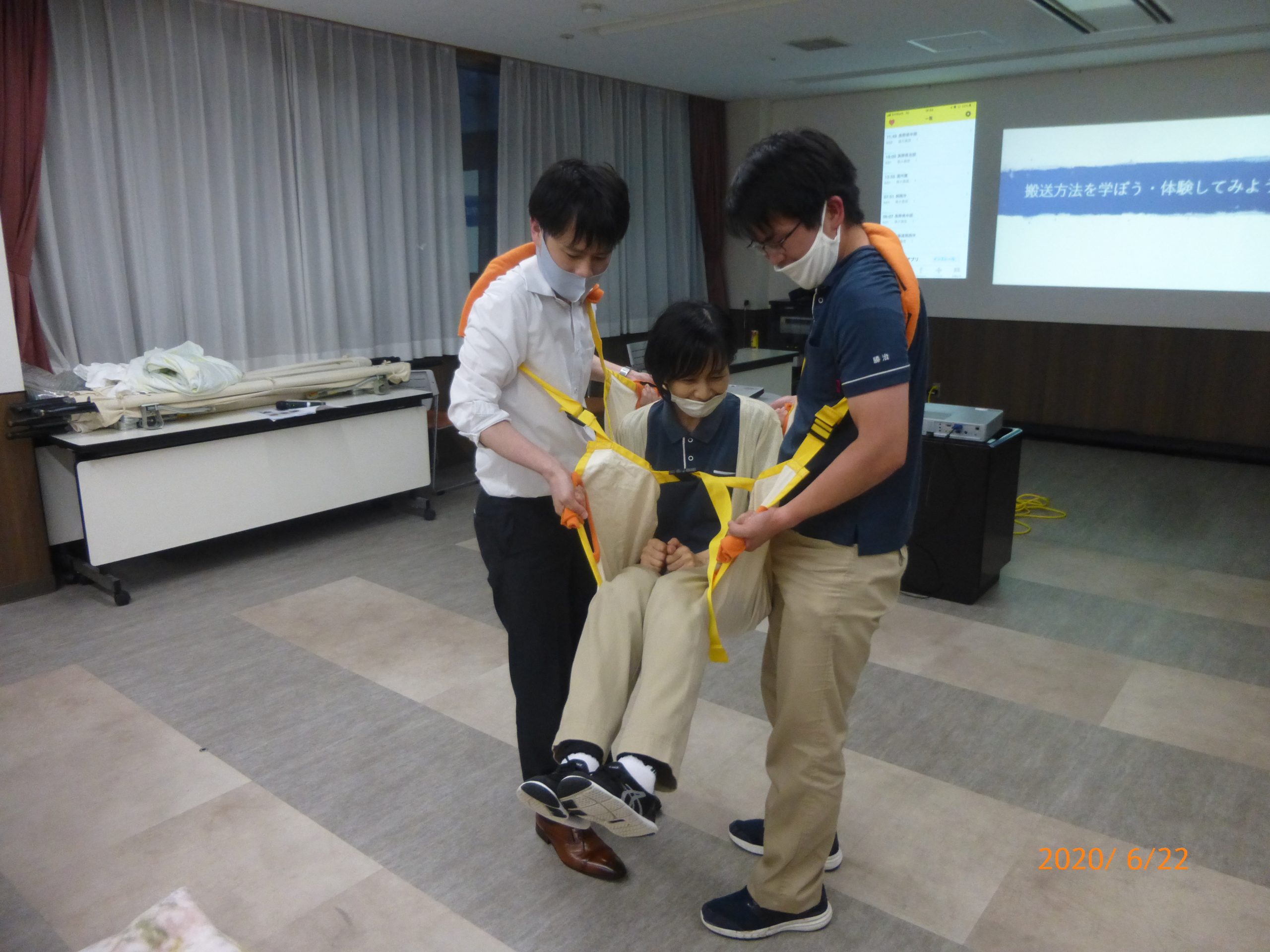 参加した職員からの感想… 「軽い女性の方でも搬送するのは大変だった。」 「車椅子に乗ったまま階段を昇降する体験ができて良かった。」 「災害時に備え、普段から環境整備や物品の把握をしていきたい。」