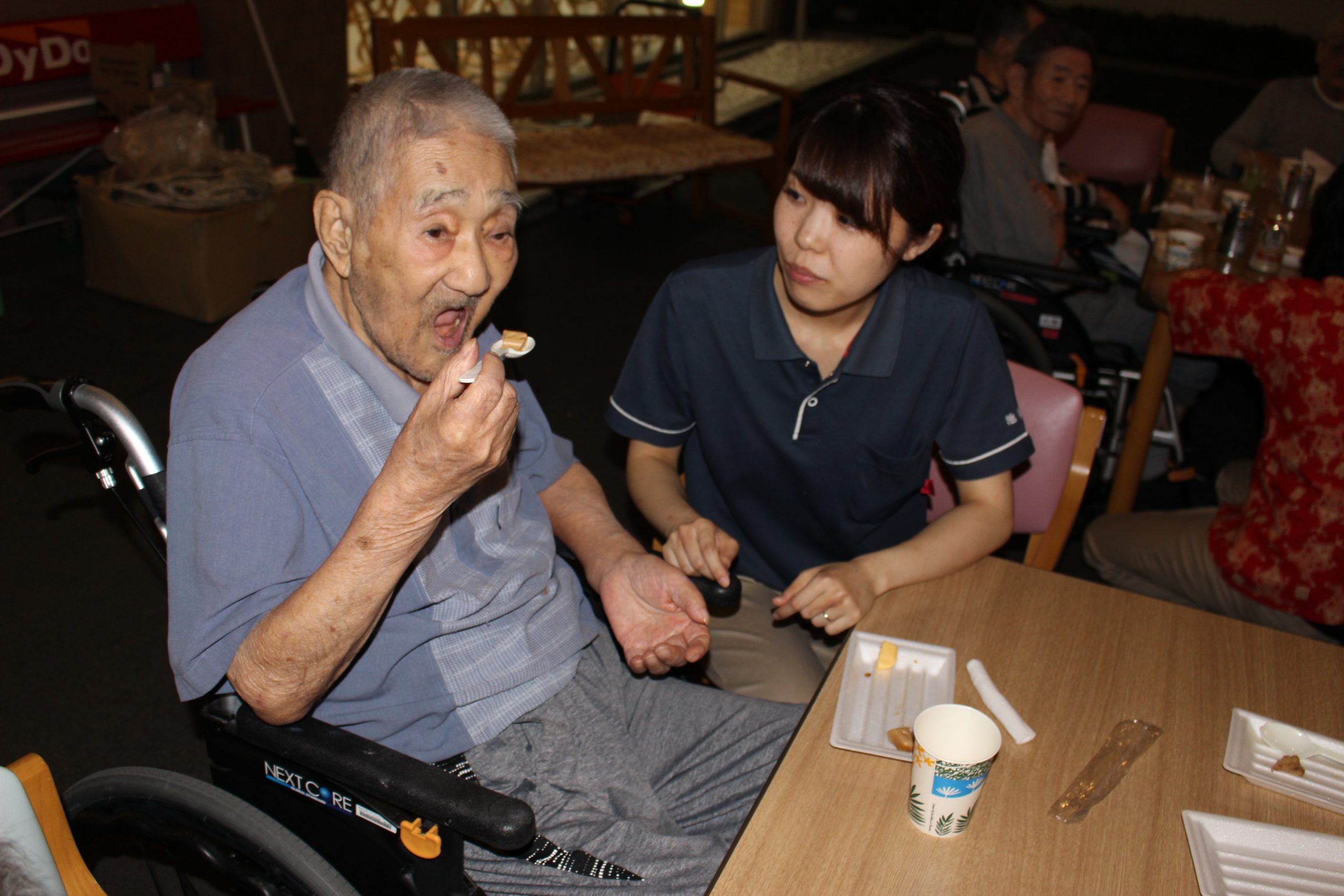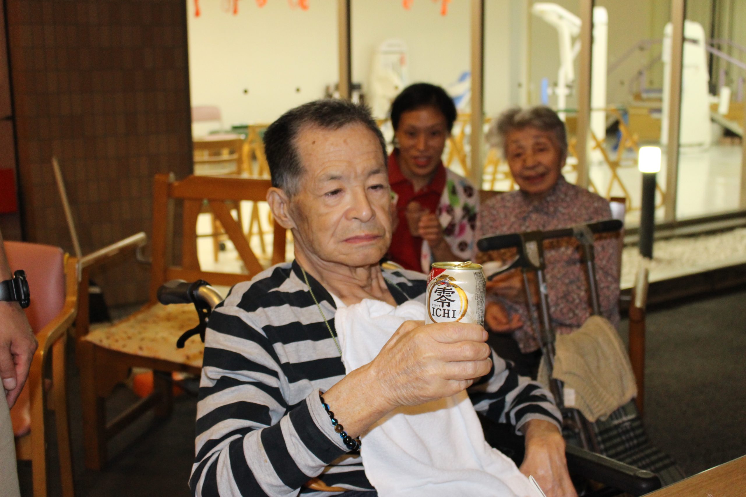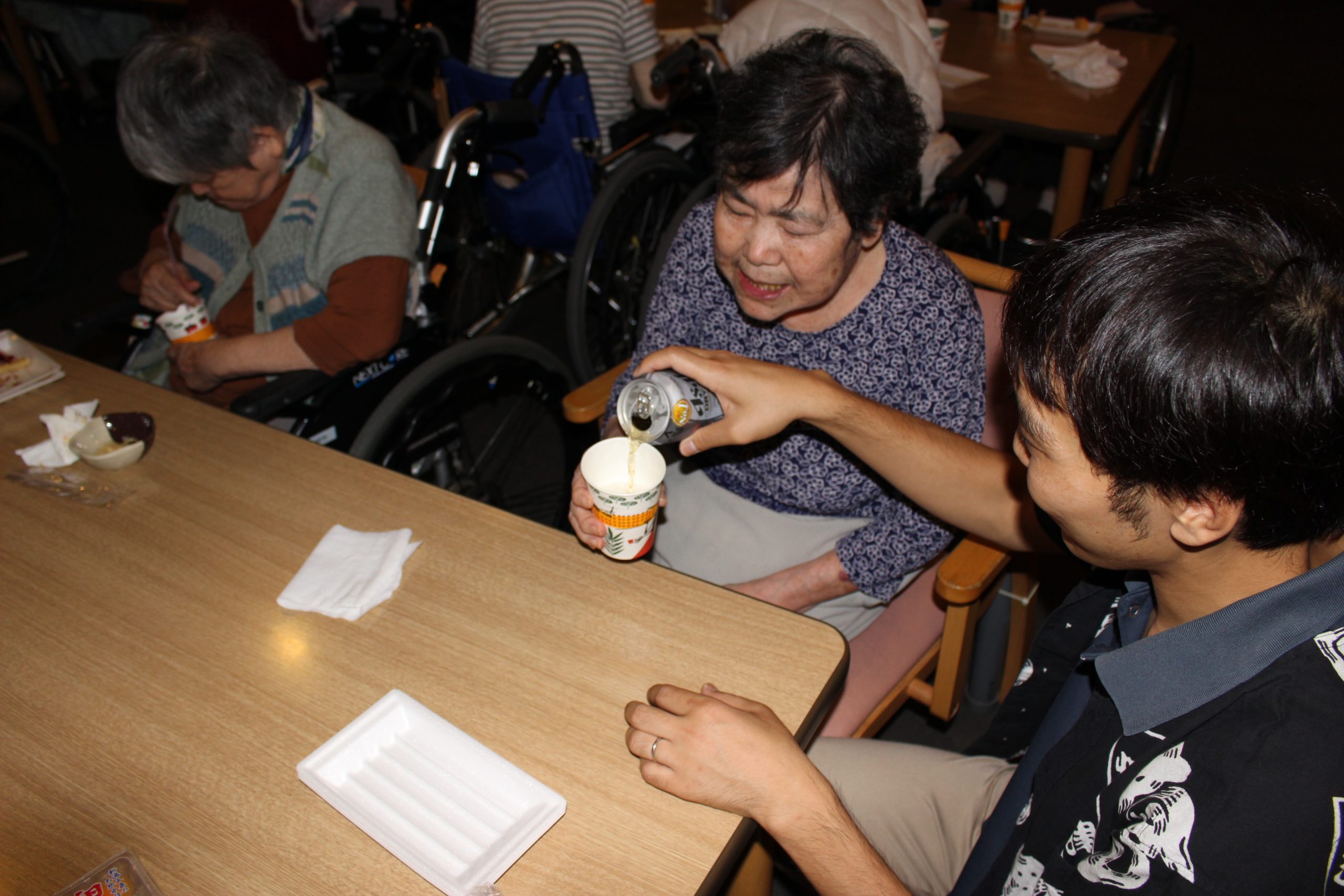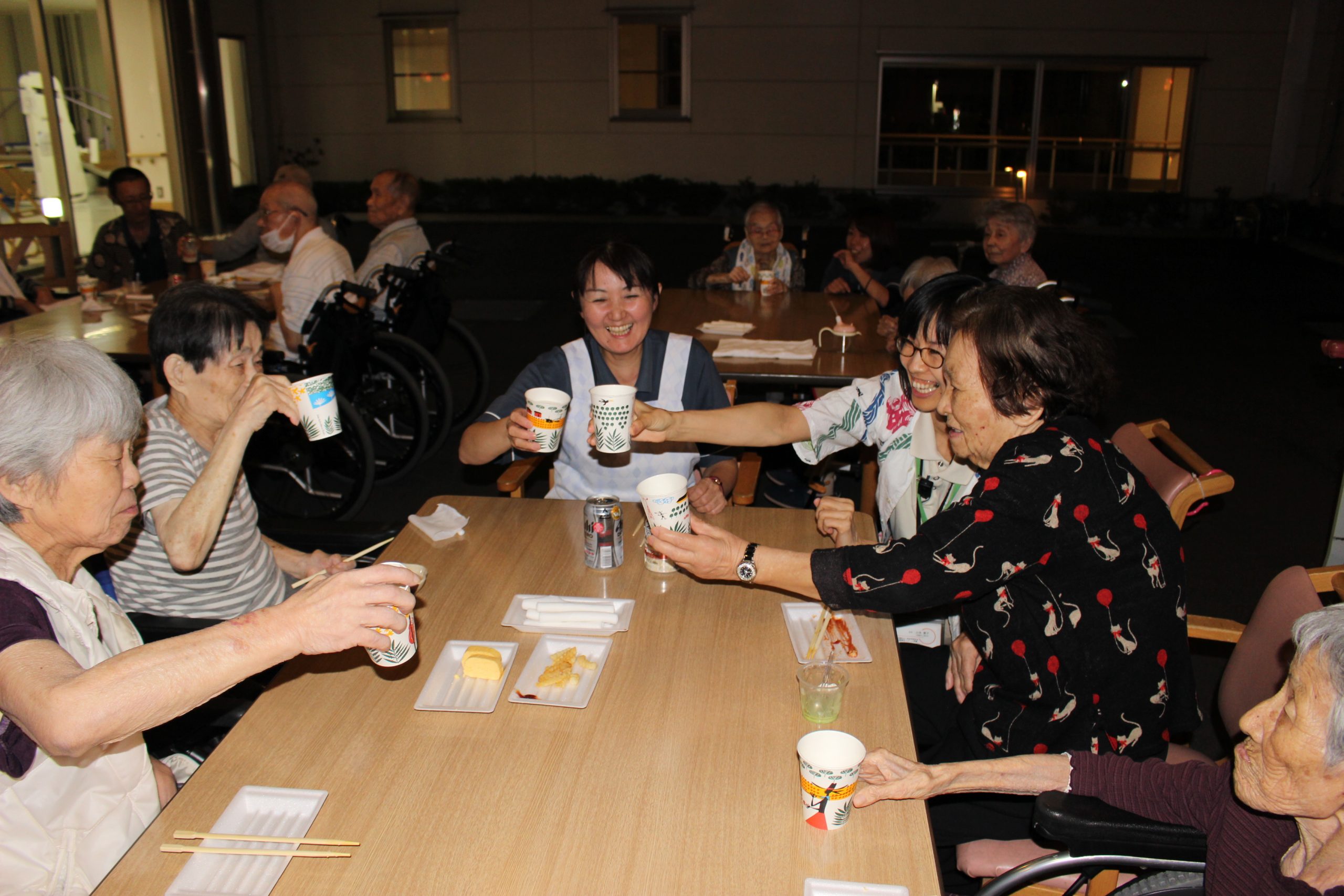 美味しい食事、美味しい飲み物があるとやはり会話も弾むようで、職員と一緒に乾杯をしたり楽しい話にたくさんの笑顔が見られました。