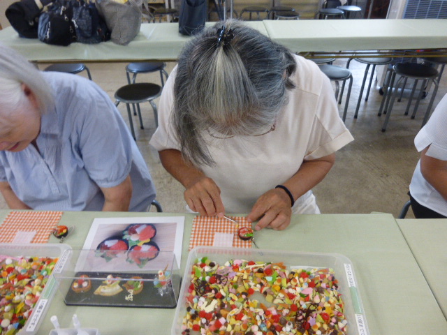 細かいパーツをピンセットを使って貼ったり、天ぷら作りでは昔ながらの方法、ロウを使って天ぷらの衣をつけます。