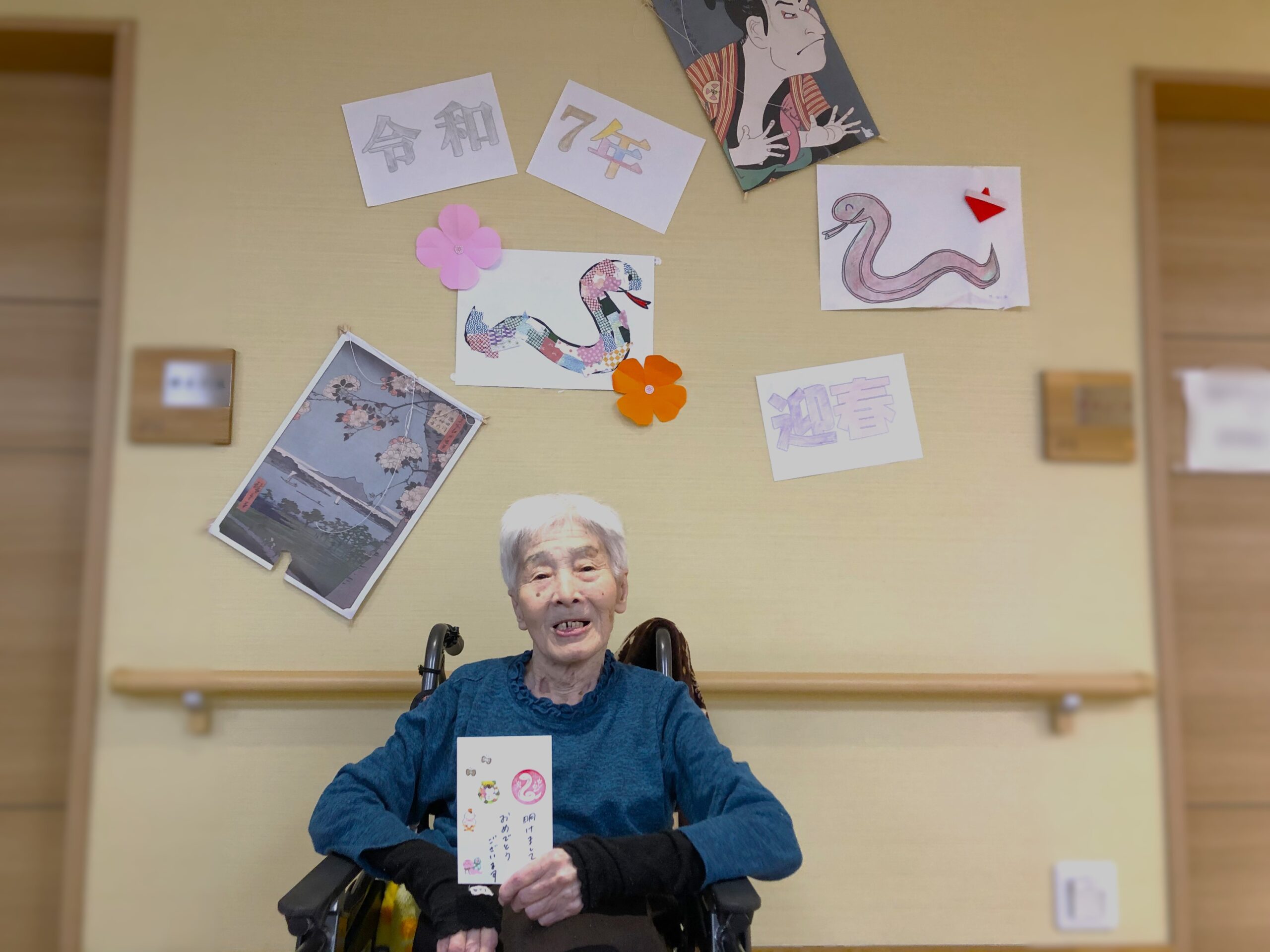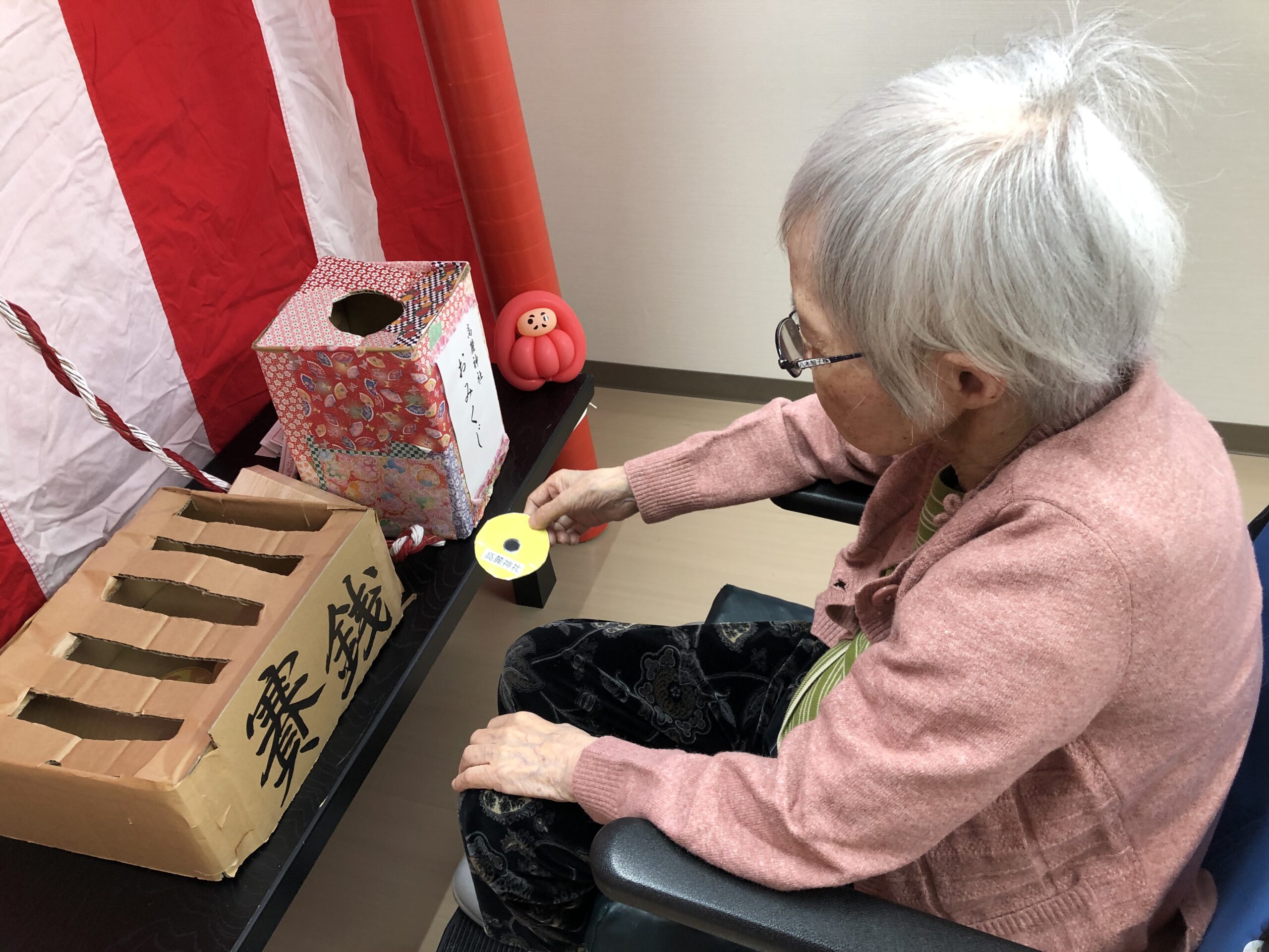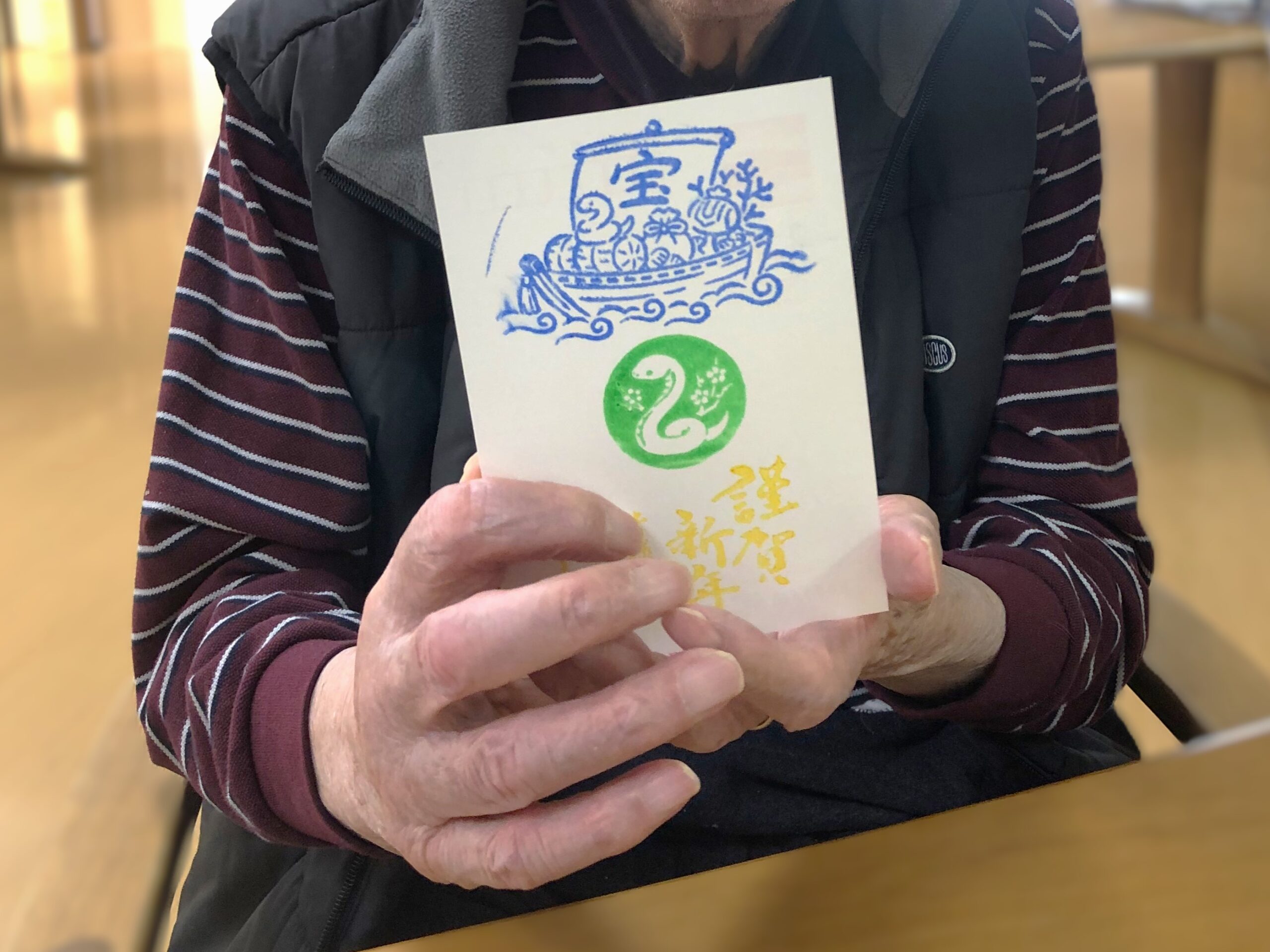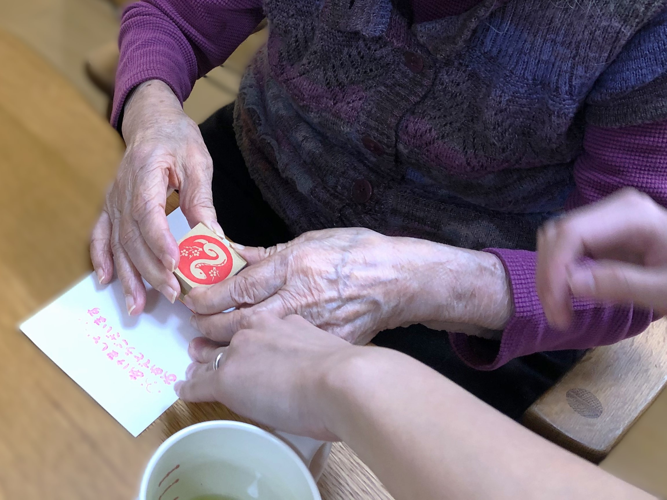 ユニット2階ではお正月の三が日を、昨年ご家族様からもご好評いただいた年賀状作りや、高麓神社へ参拝をして過ごされました。