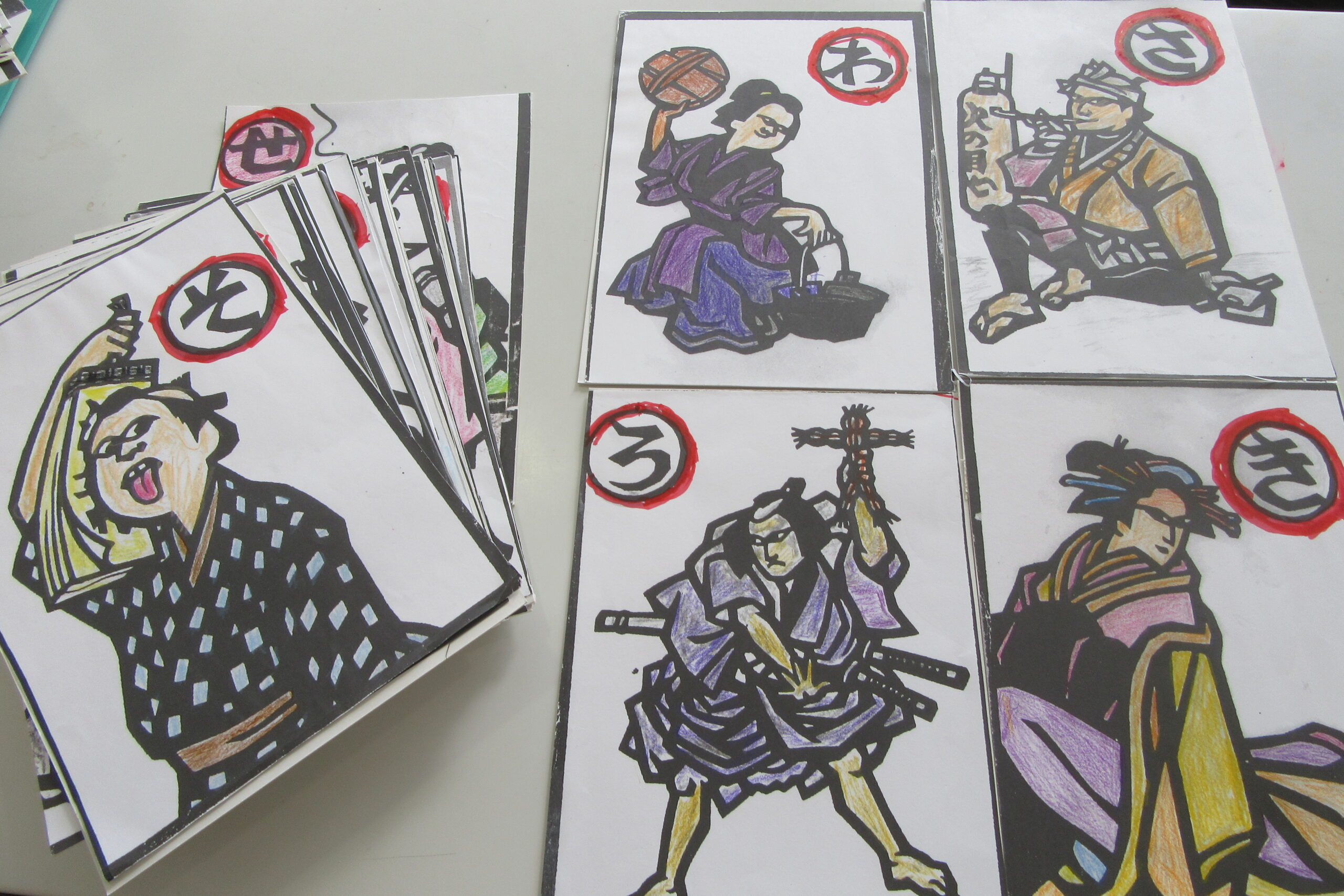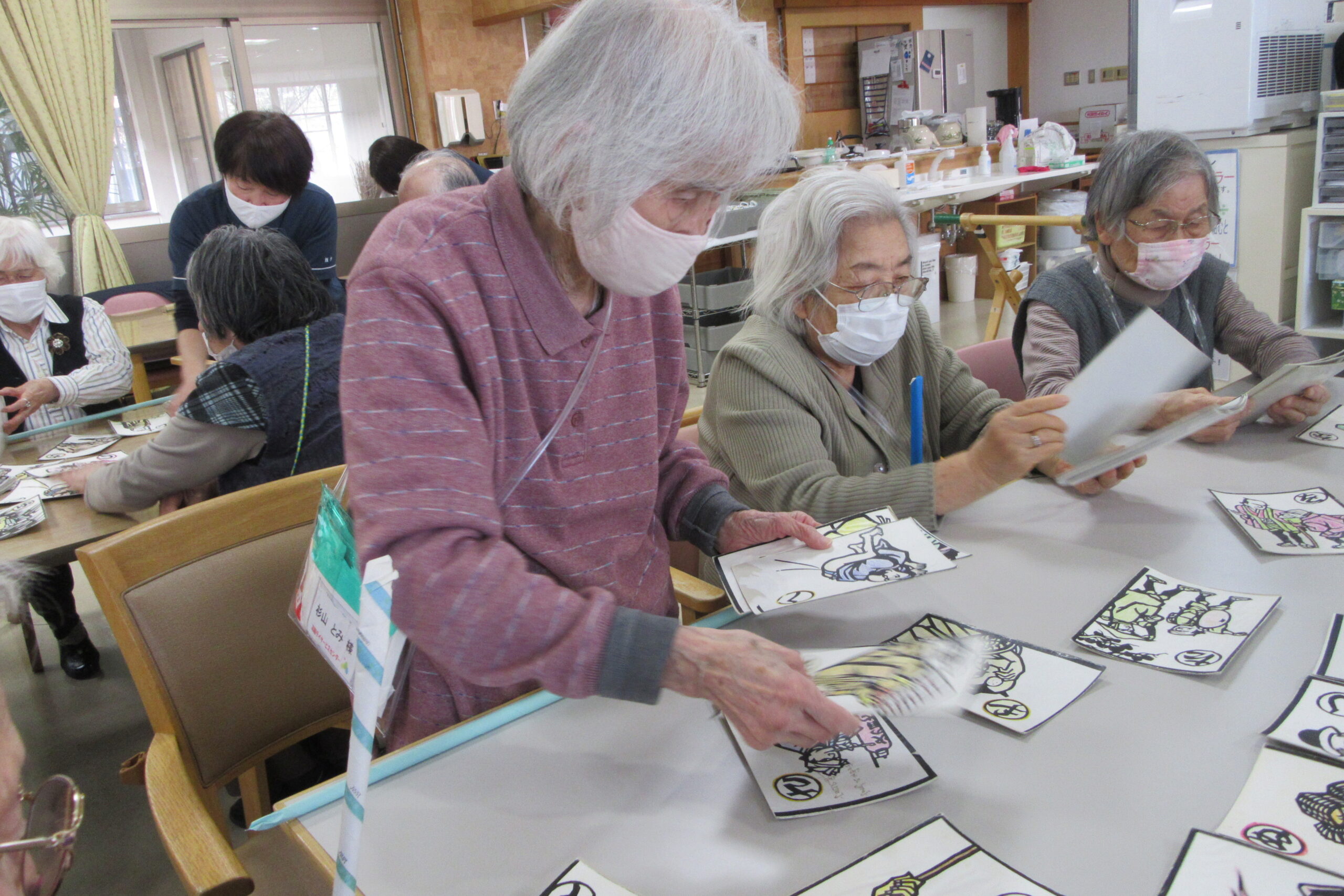 以前に行った時、とても好評だったため、人数を増やし、テーブルを三つ用意し、より多くの方に参加して頂けるようにしました。今回使用した「いろはかるた」はもともと白黒だったものをお客様が一つ一つ丁寧に塗って下さいました。とても鮮やかな色使いで参加者の方々も「きれいだね。」とか好評でした。