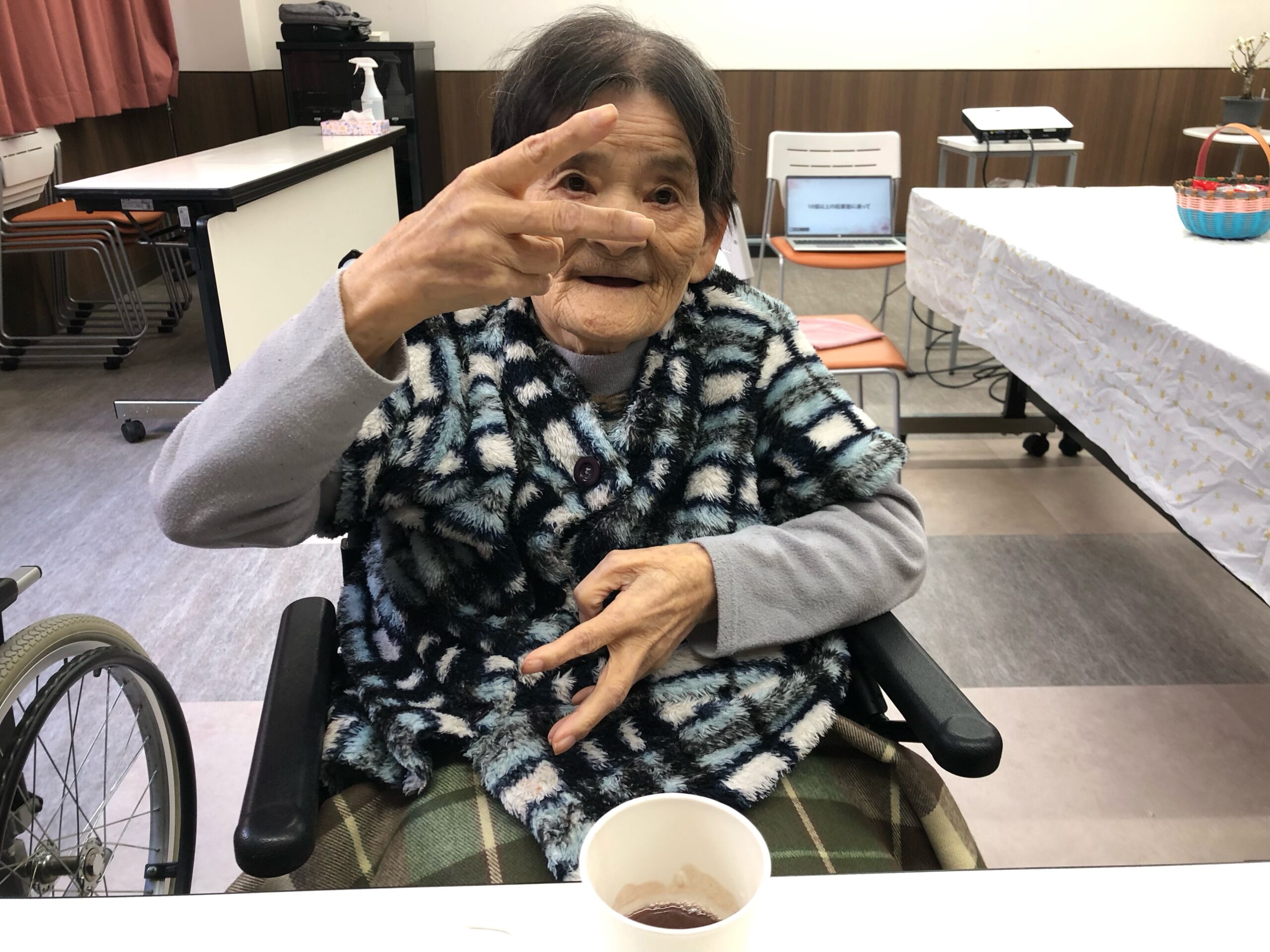 フロアに戻って温かいお汁粉を召し上がっていただきました。