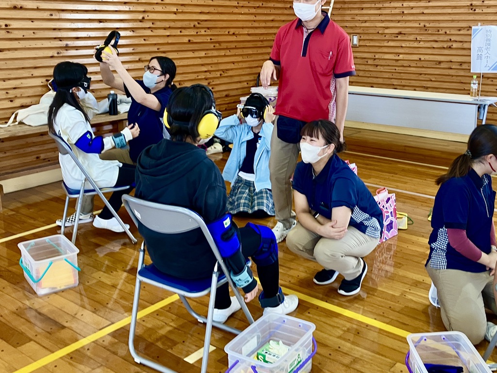 (社会福祉協議会から借りた体験グッズを身につけ体の動かしづらさ、見えづらさ等を体感)