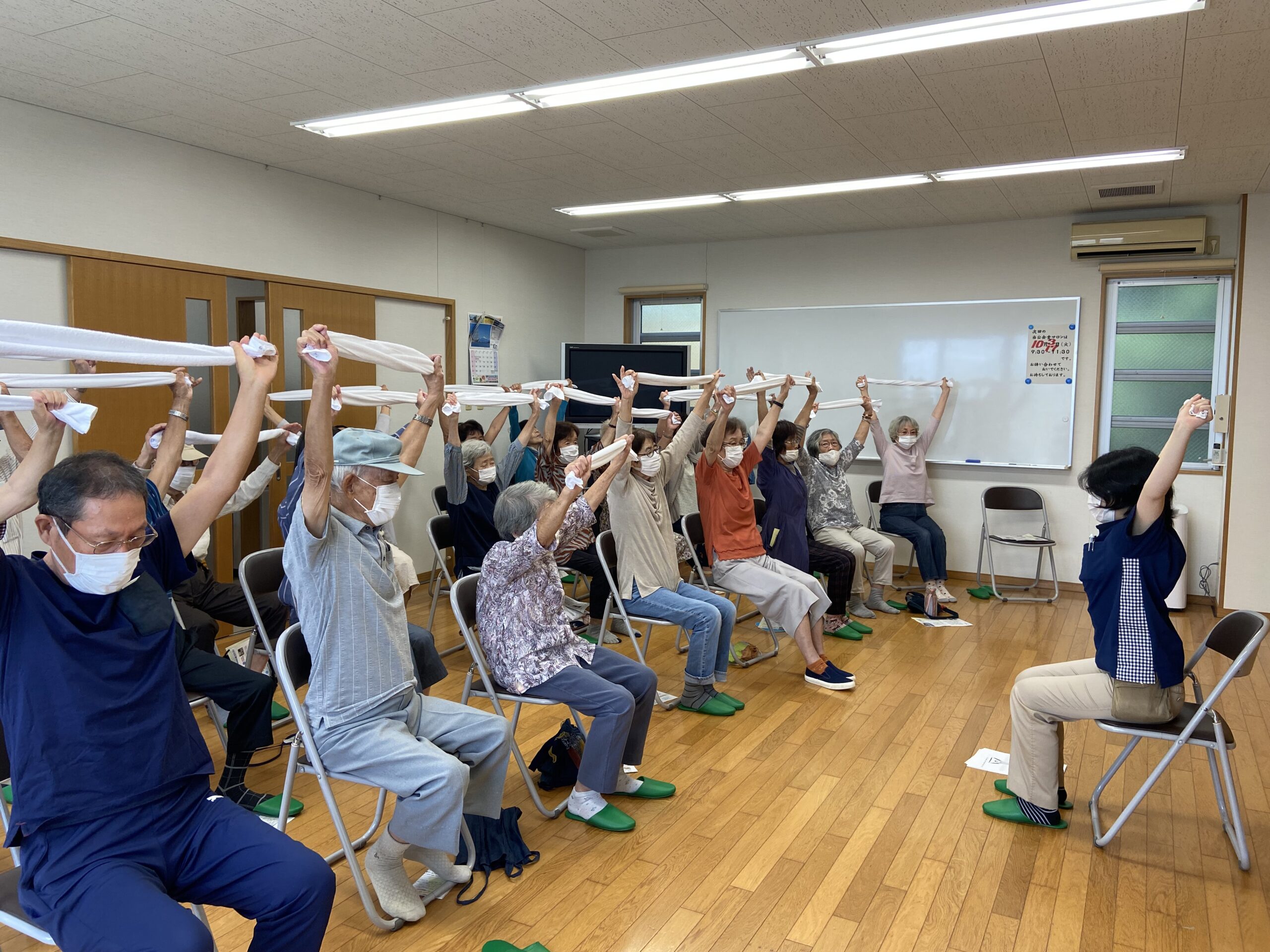 身体がほぐれたところで、続いて『タオル体操』を実施。