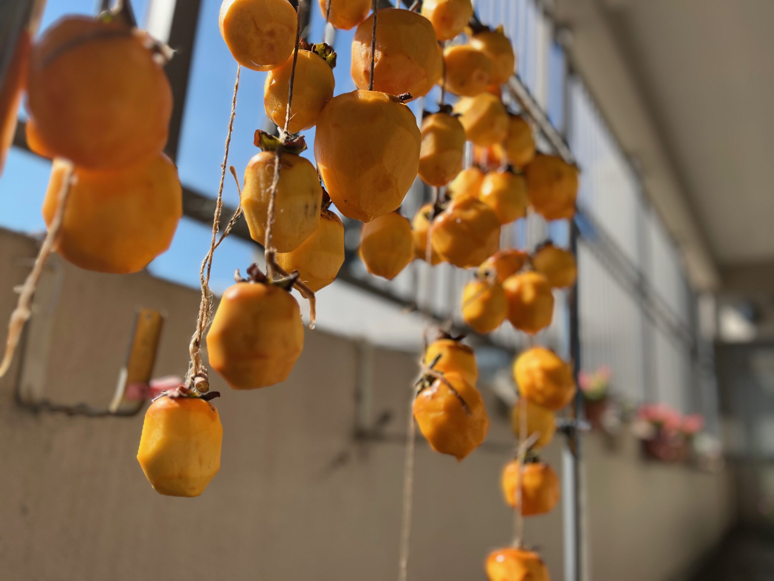 柿を吊るし、ポカポカ陽に当てて、乾燥させます。