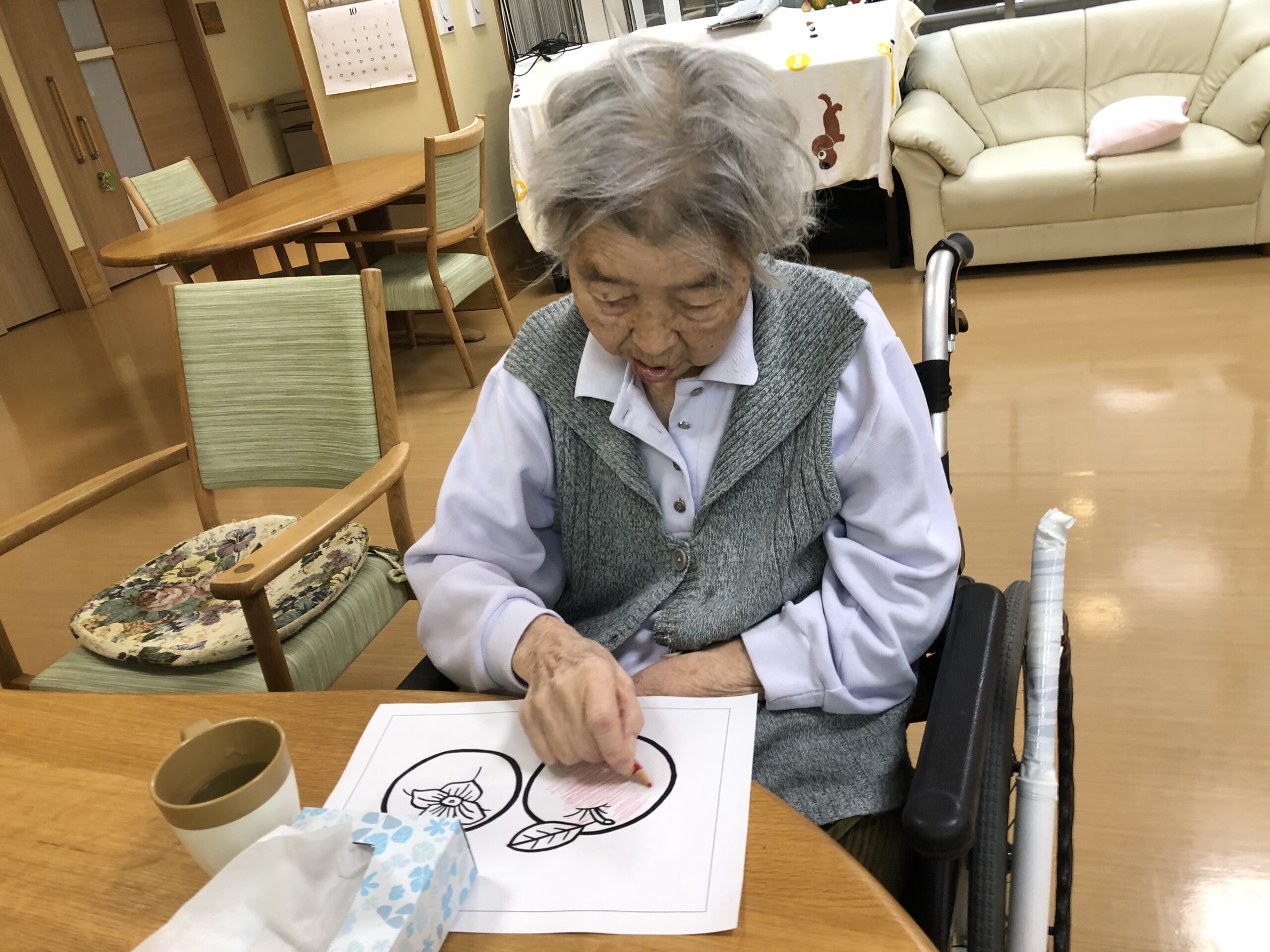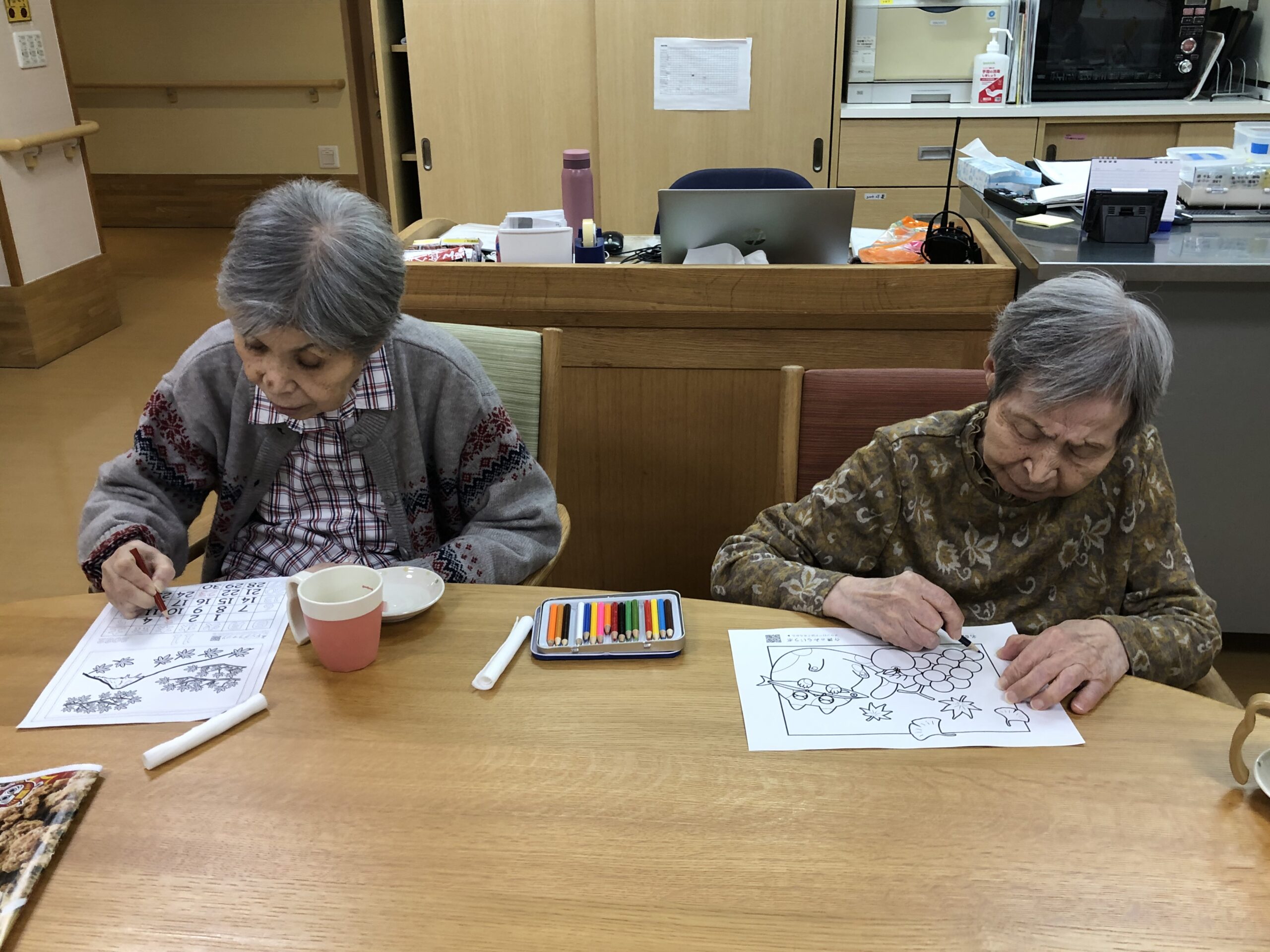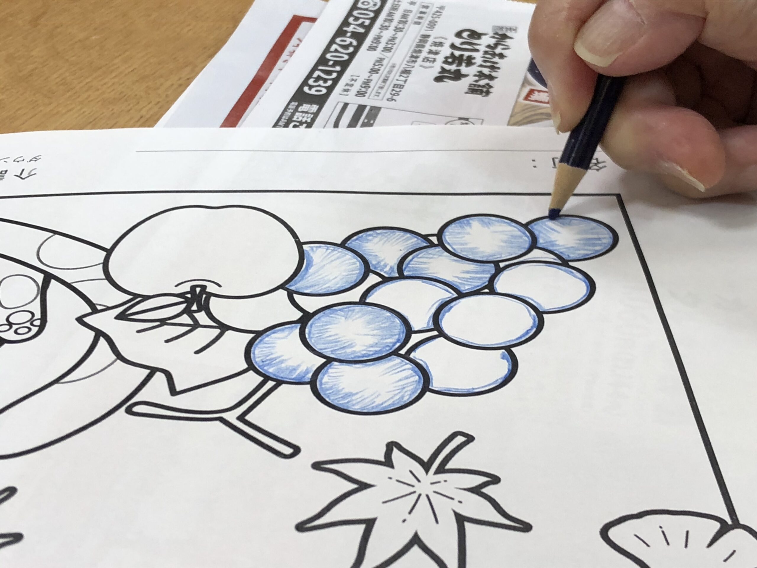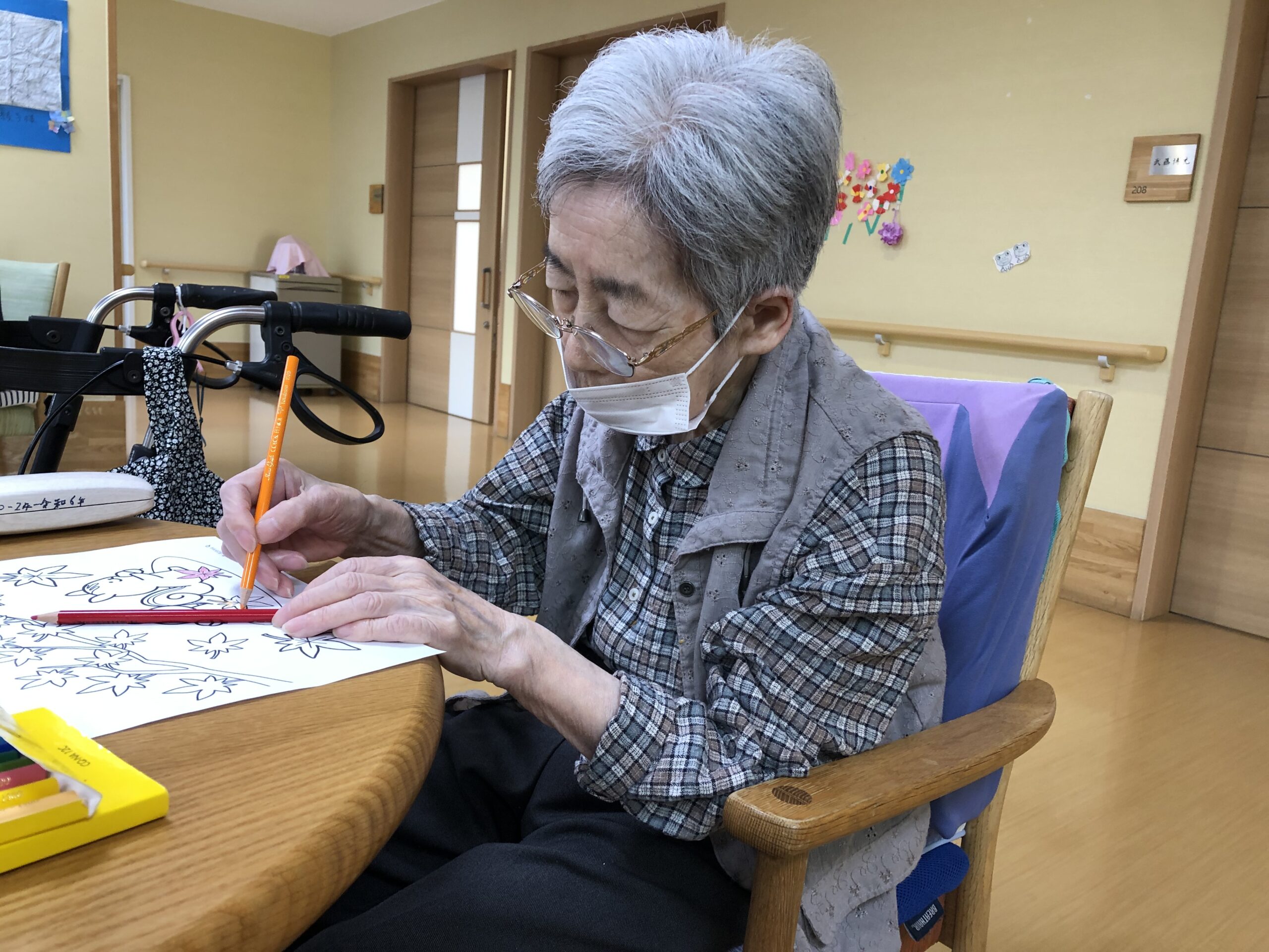 塗り絵一1枚でも「自分らしい」個性があり、「その色味いいね」と作成中の作品をお互い見せ合い楽しまれる様子も見られました。