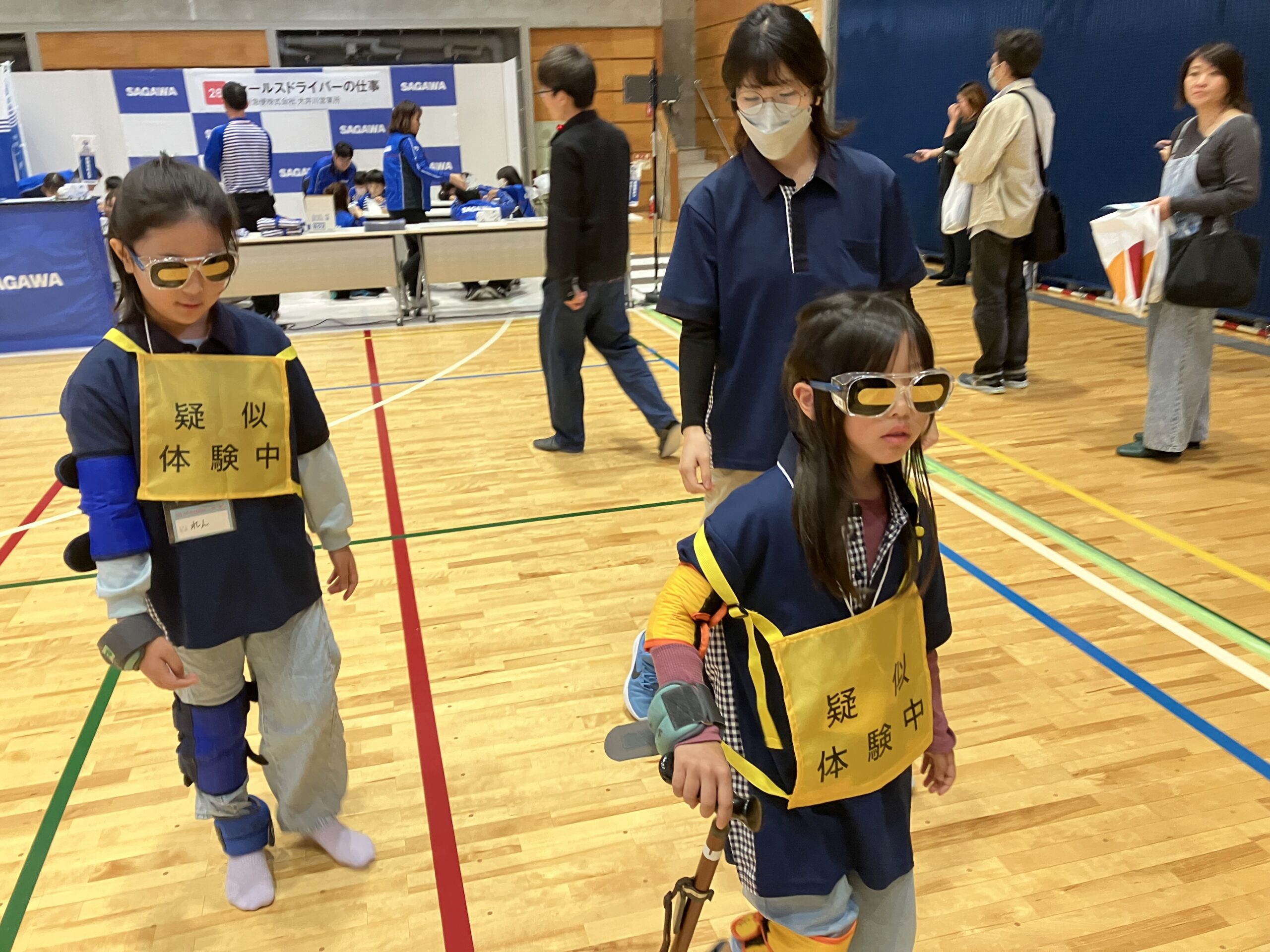 続いて実際に80歳くらいの高齢者がどのような気持ち、身体状態なのかを疑似体験グッズを装着して体験してもらいました。