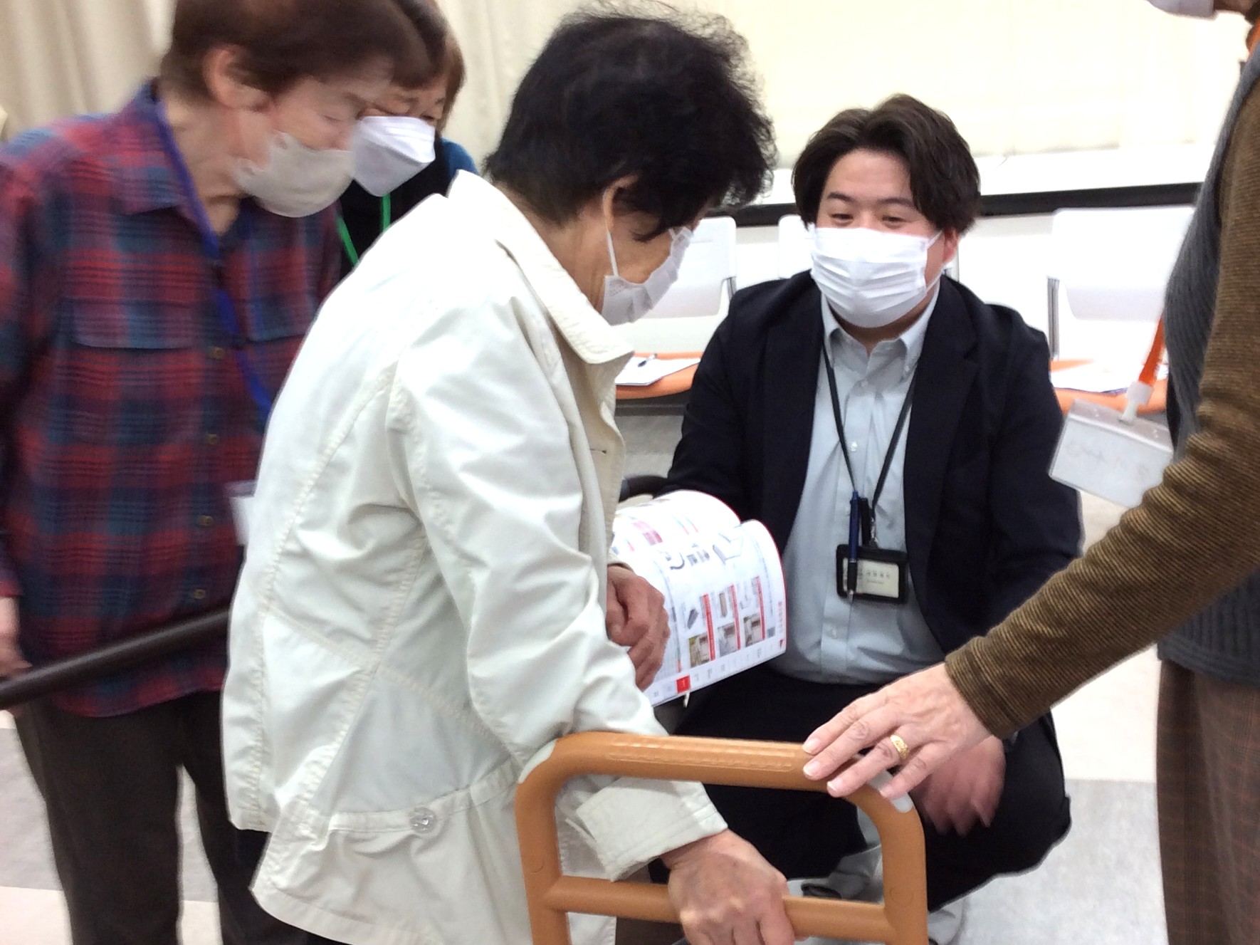 福祉用具メーカーさんを講師に、歩行器や杖、手すり等今まで見聞きするくらいであった福祉用具を実際に手を取って体験してみました。