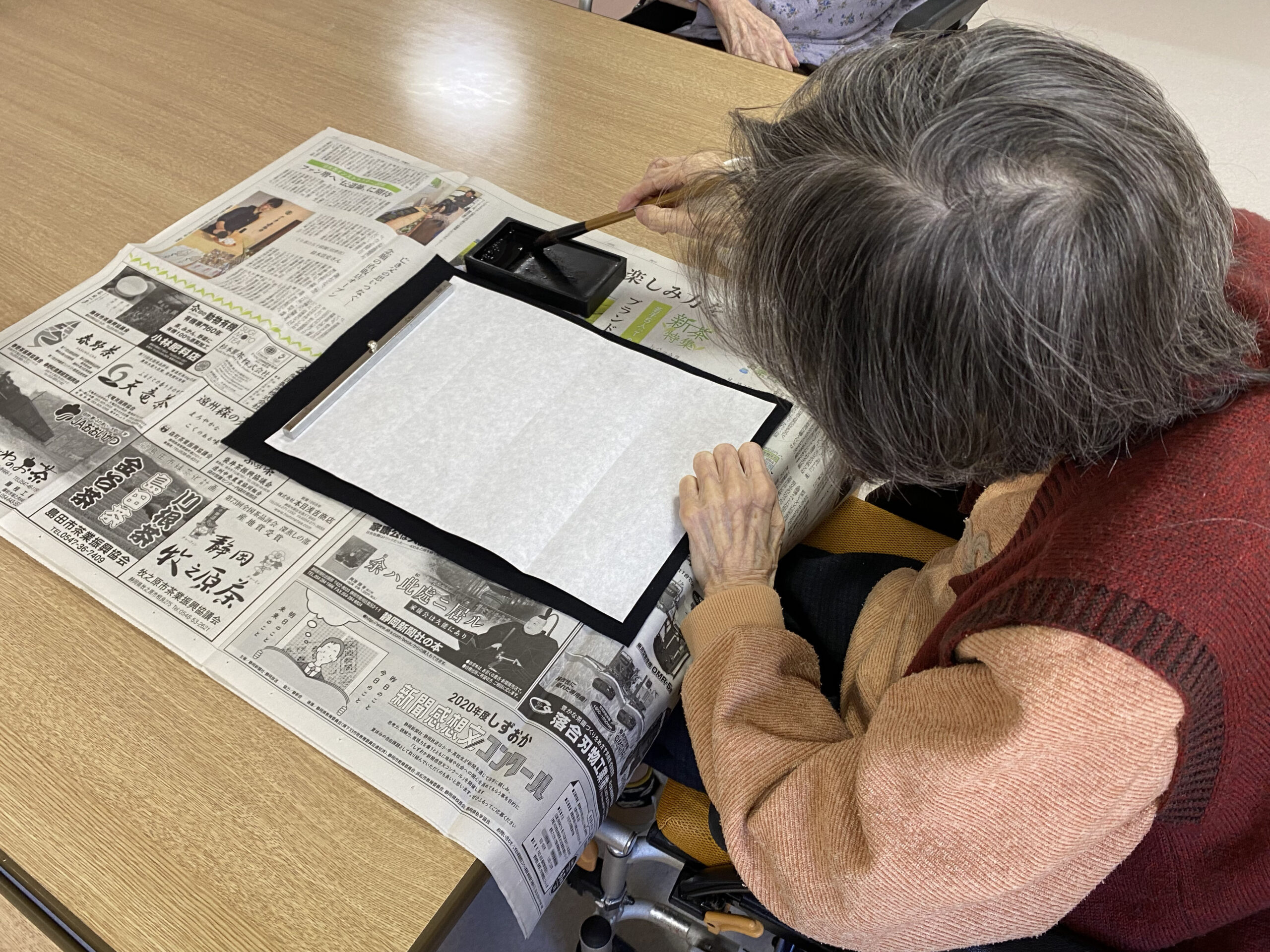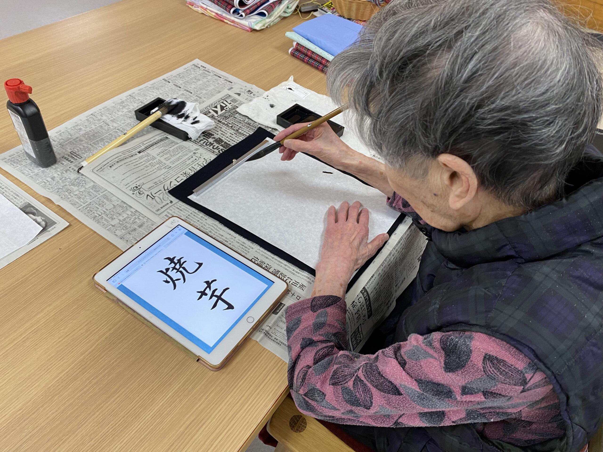 習字で「や」「き」「い」「も」の字を一人一文字。
