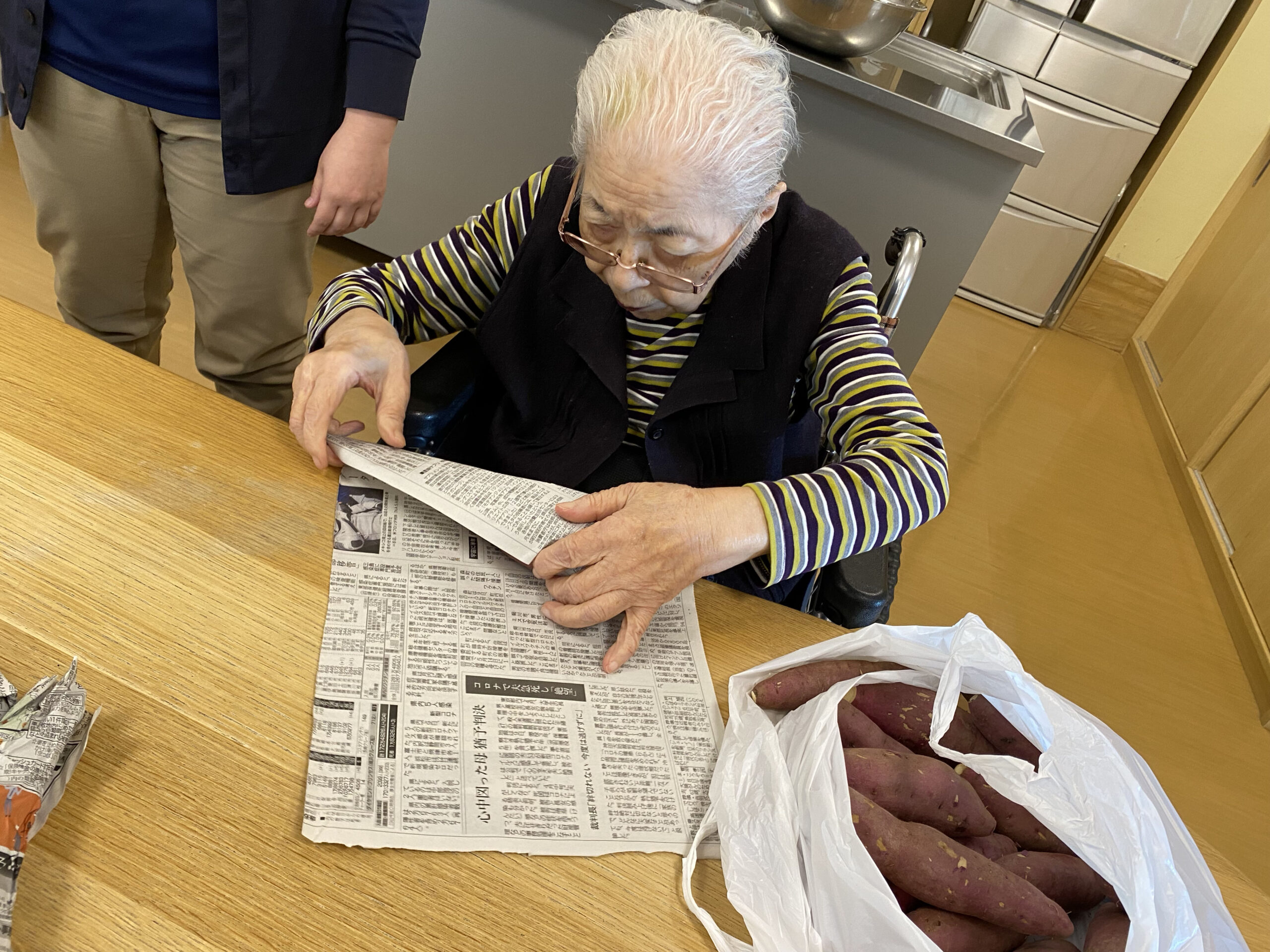 サツマイモを洗い、新聞紙で包んで水で濡らしてからアルミホイルで包みます。