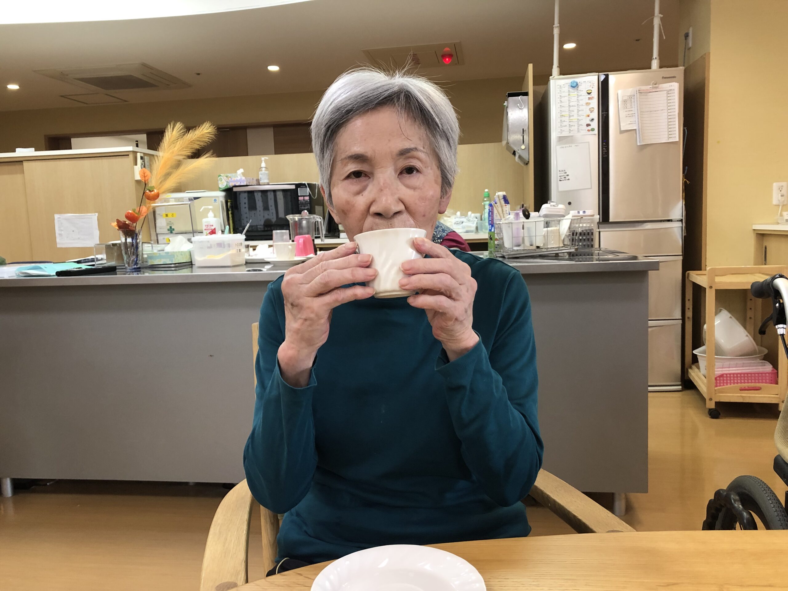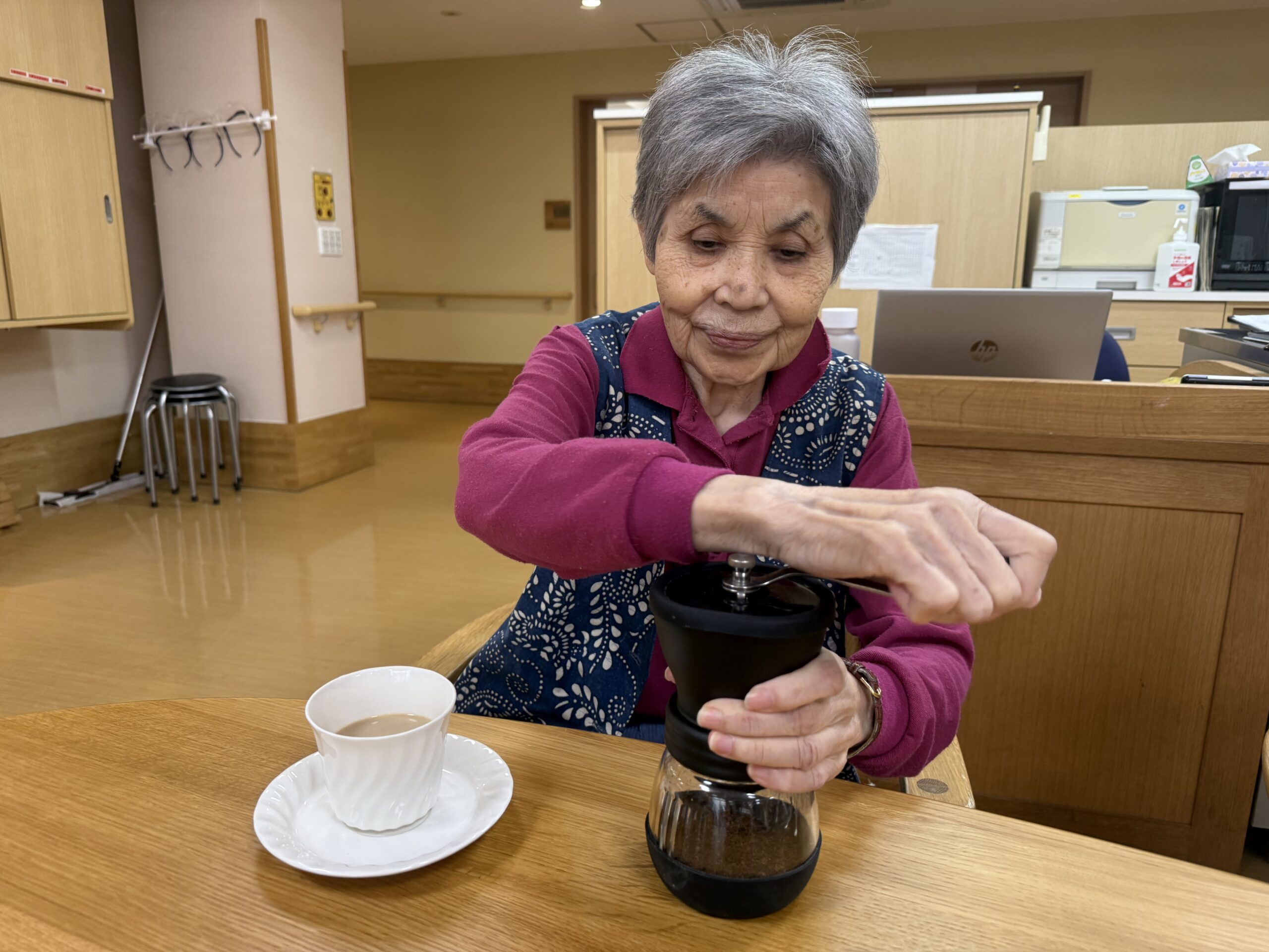 いつもはインスタントのコーヒーを召し上がっていただくことが多いのですが、今回はミルで豆を挽き、ドリップした挽きたて本格コーヒーを味わっていただきました。