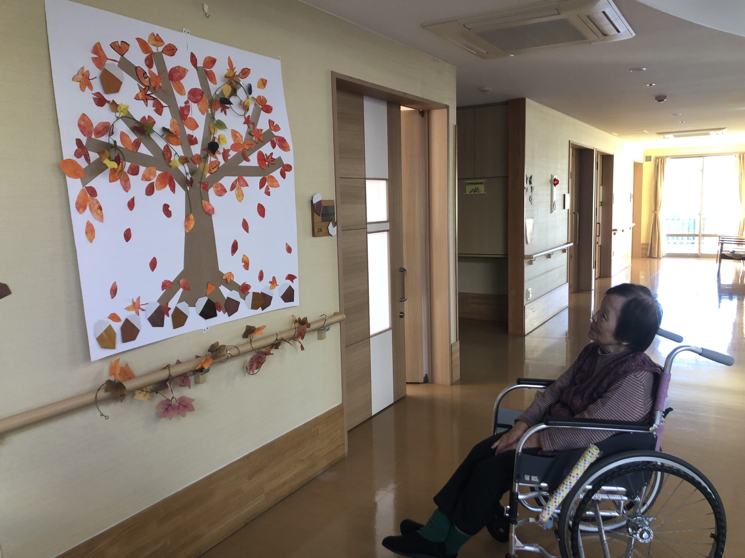 まして、施設生活の中では季節を感じにくいため、高麓では壁画やフロアレイアウトでも季節を感じ取っていただく工夫を介護士が中心になって行っています。