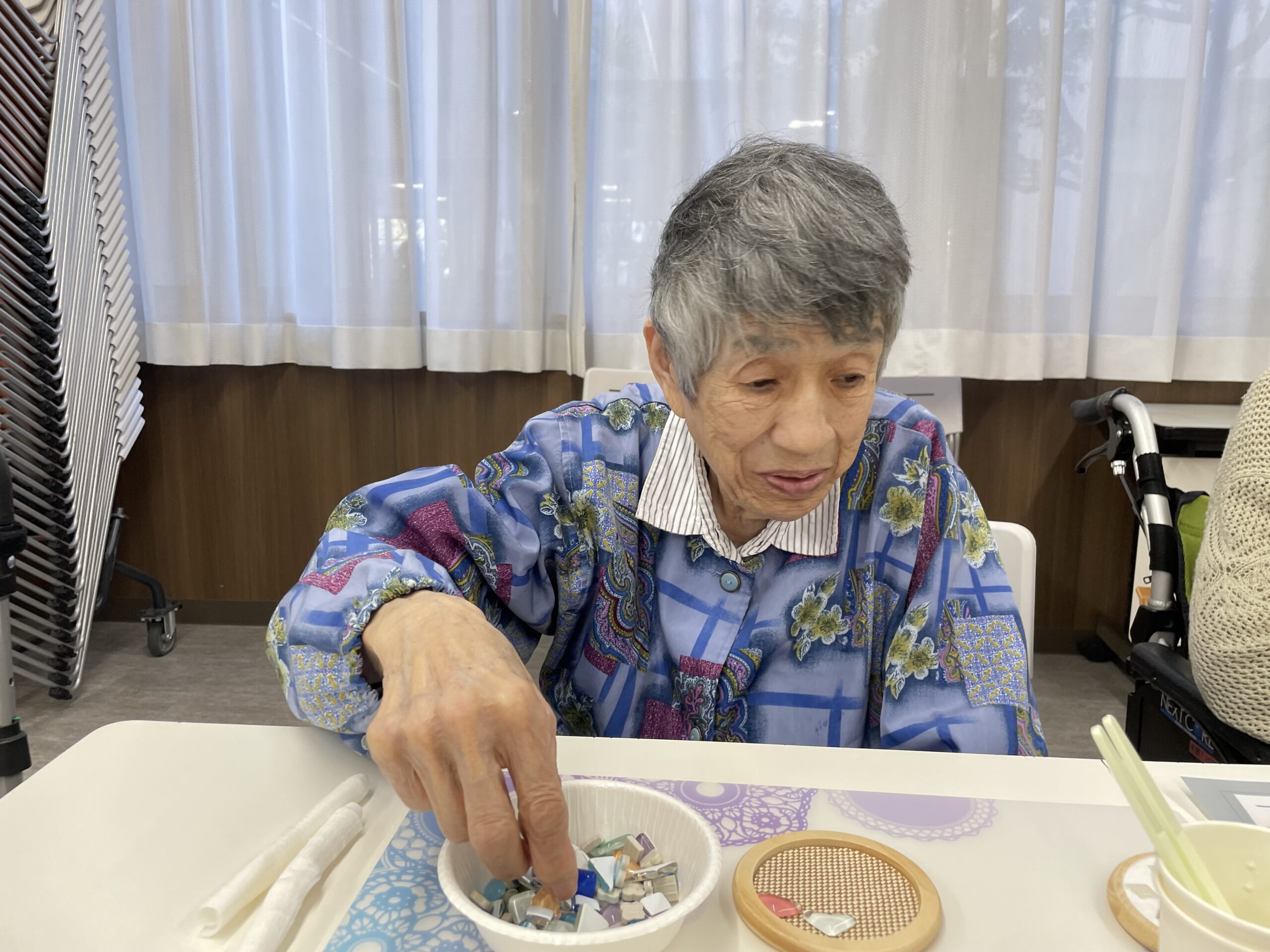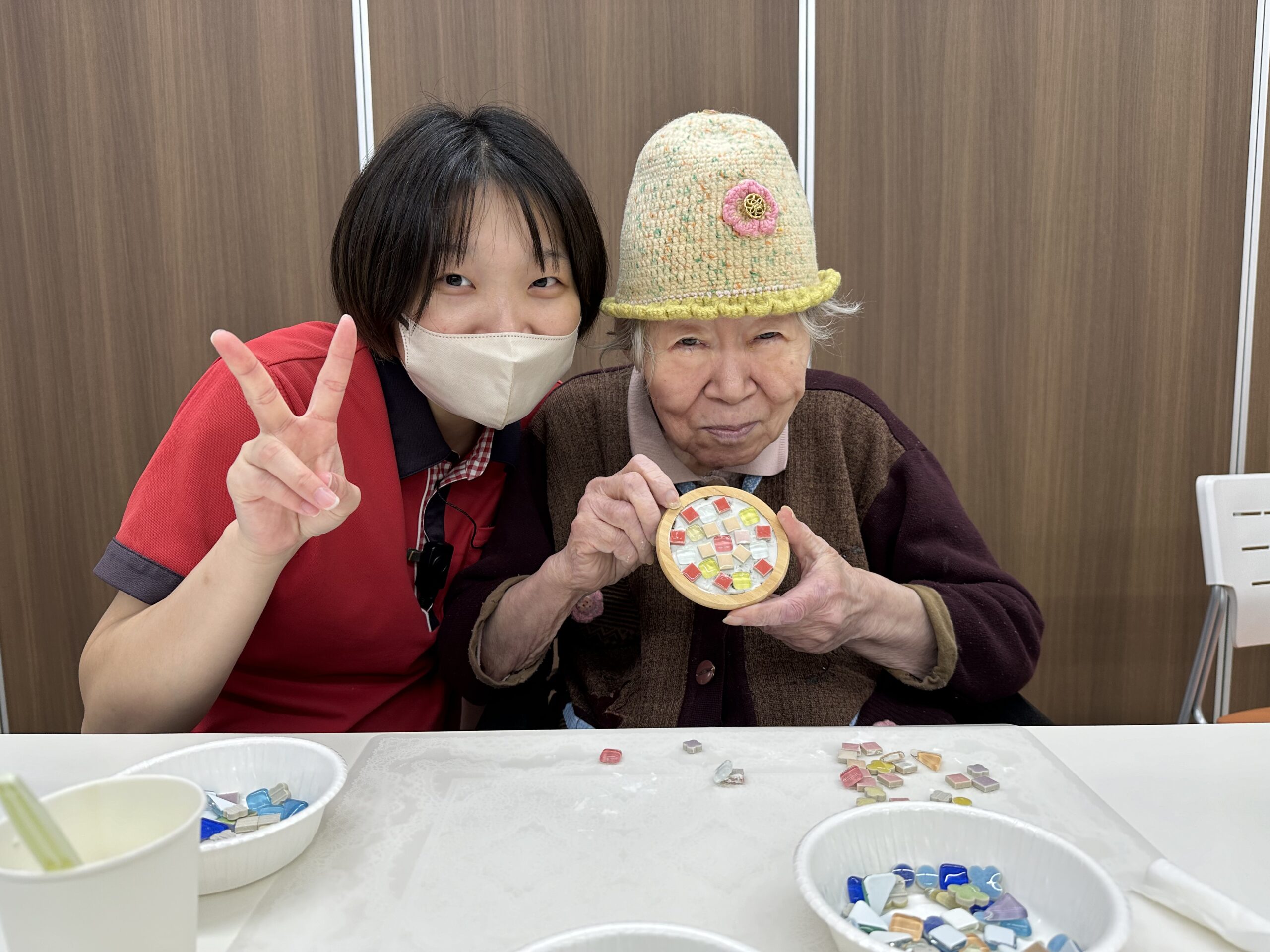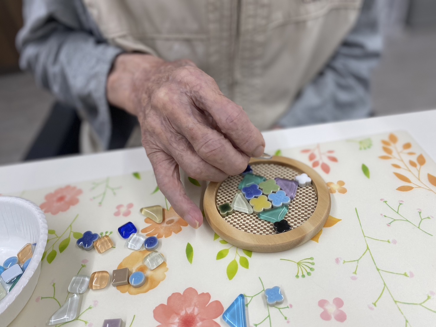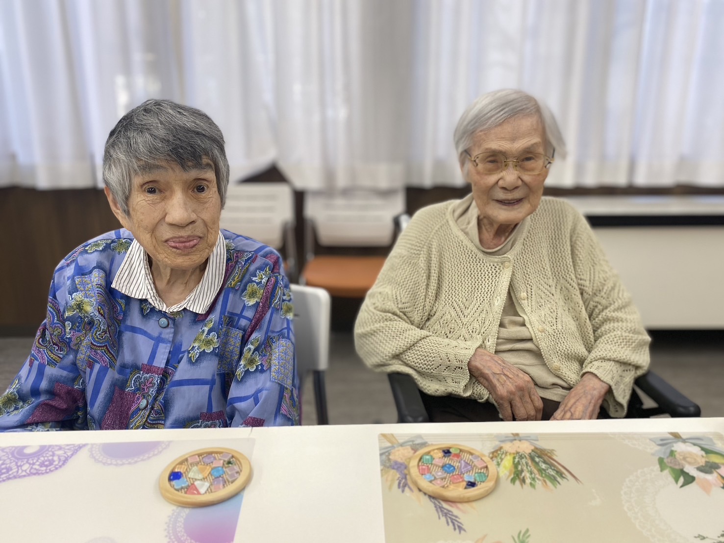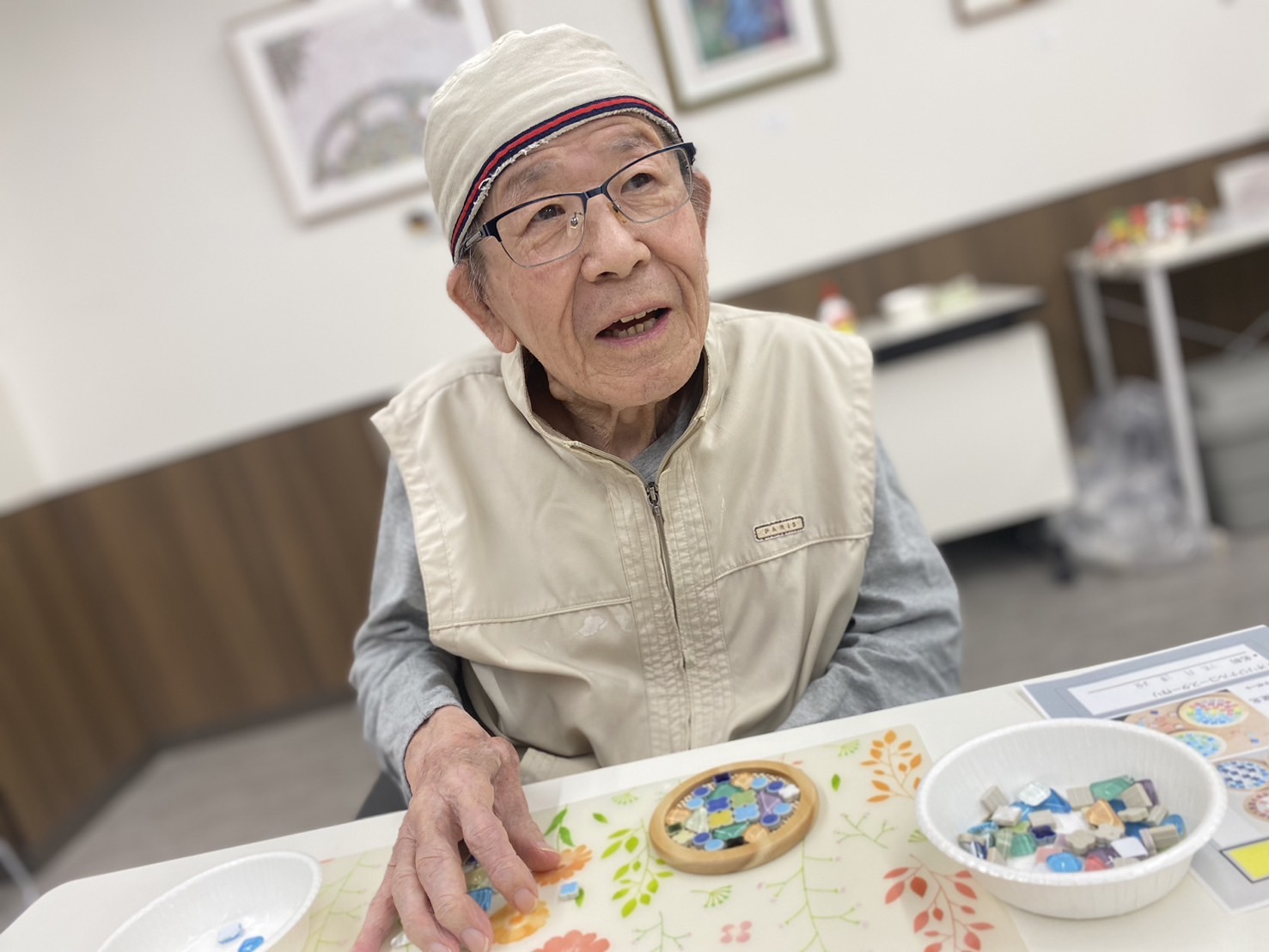 今回は会場を地域交流室に構え、いつも過ごされるフロアとはまた異なる雰囲気の中、「オリジナルコースター」を作りました。