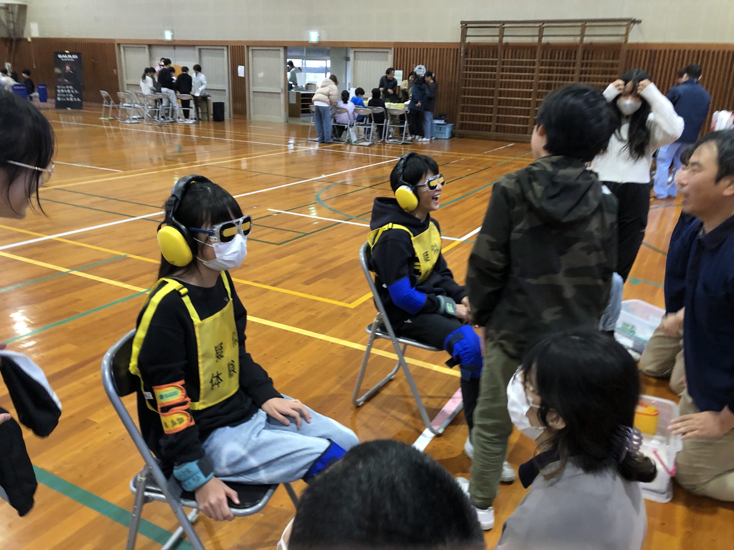 まずは、高齢者疑似体験グッズを着用し、80歳くらいになったときの見えづらい世界、聞こえづらい世界を体験。