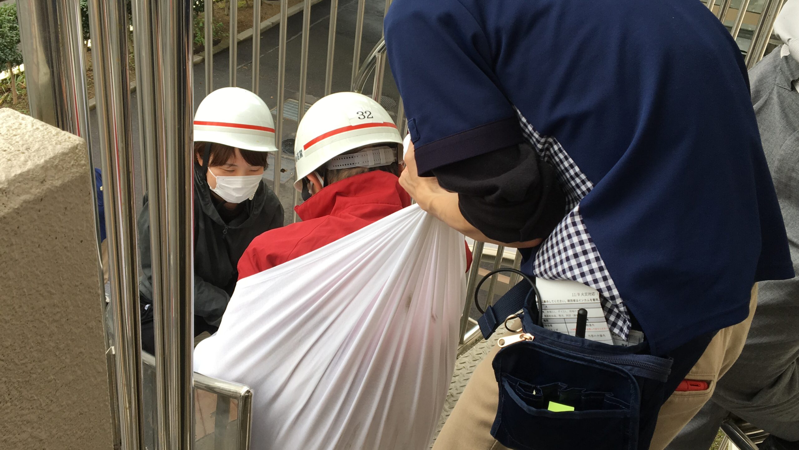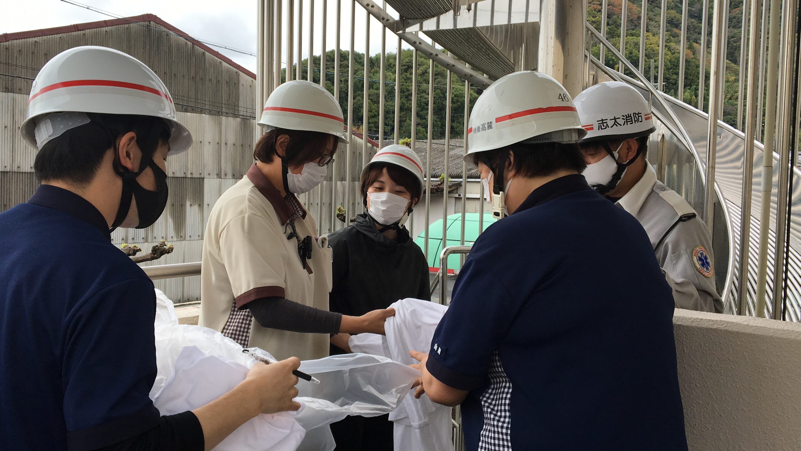 ユニットと本館のベランダにそれぞれ設置されている滑り台をベットシーツなどを用いて、お客様の避難をいかに安全に行うか様々な方法を検証をしました。