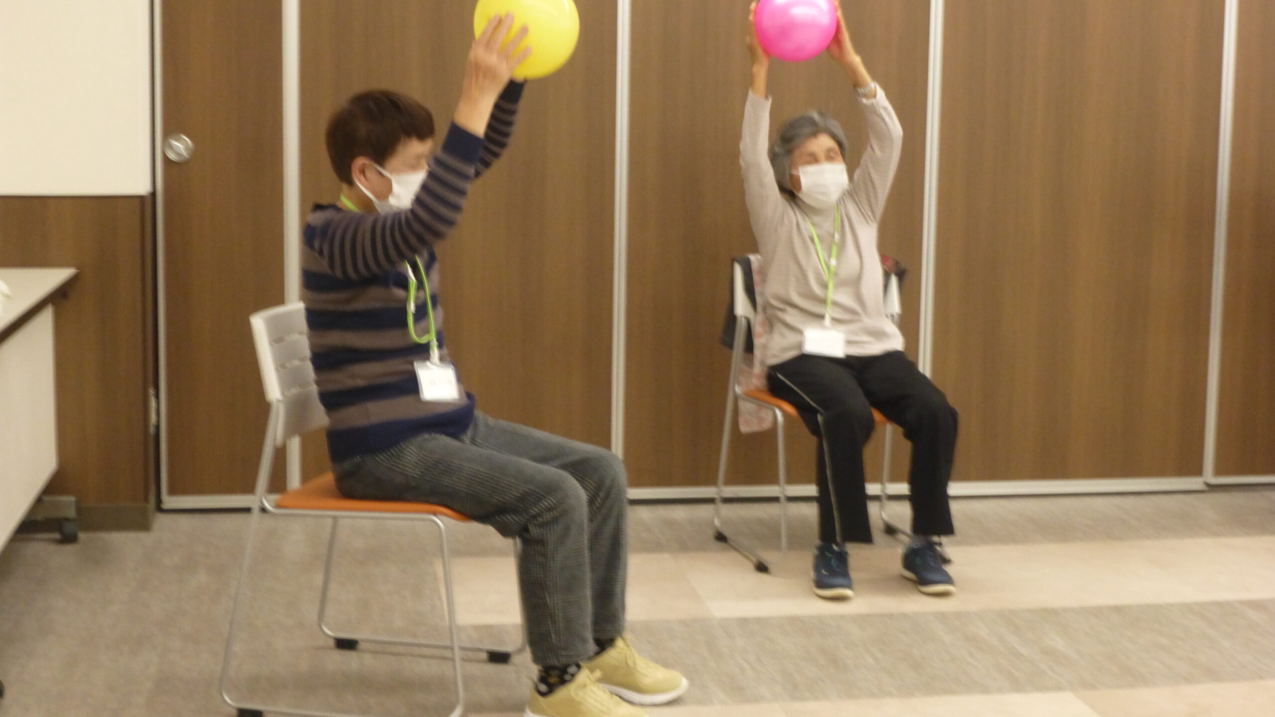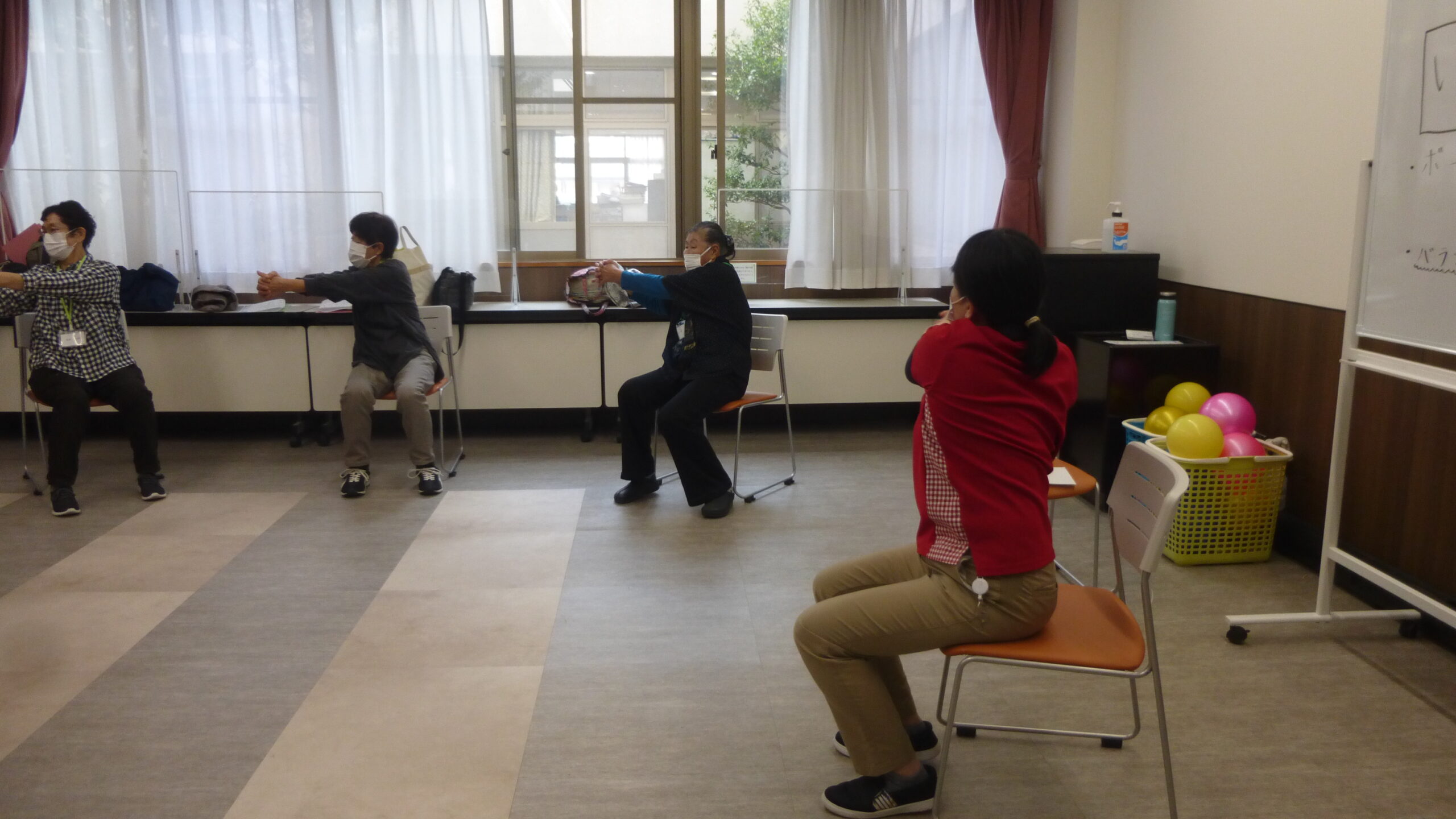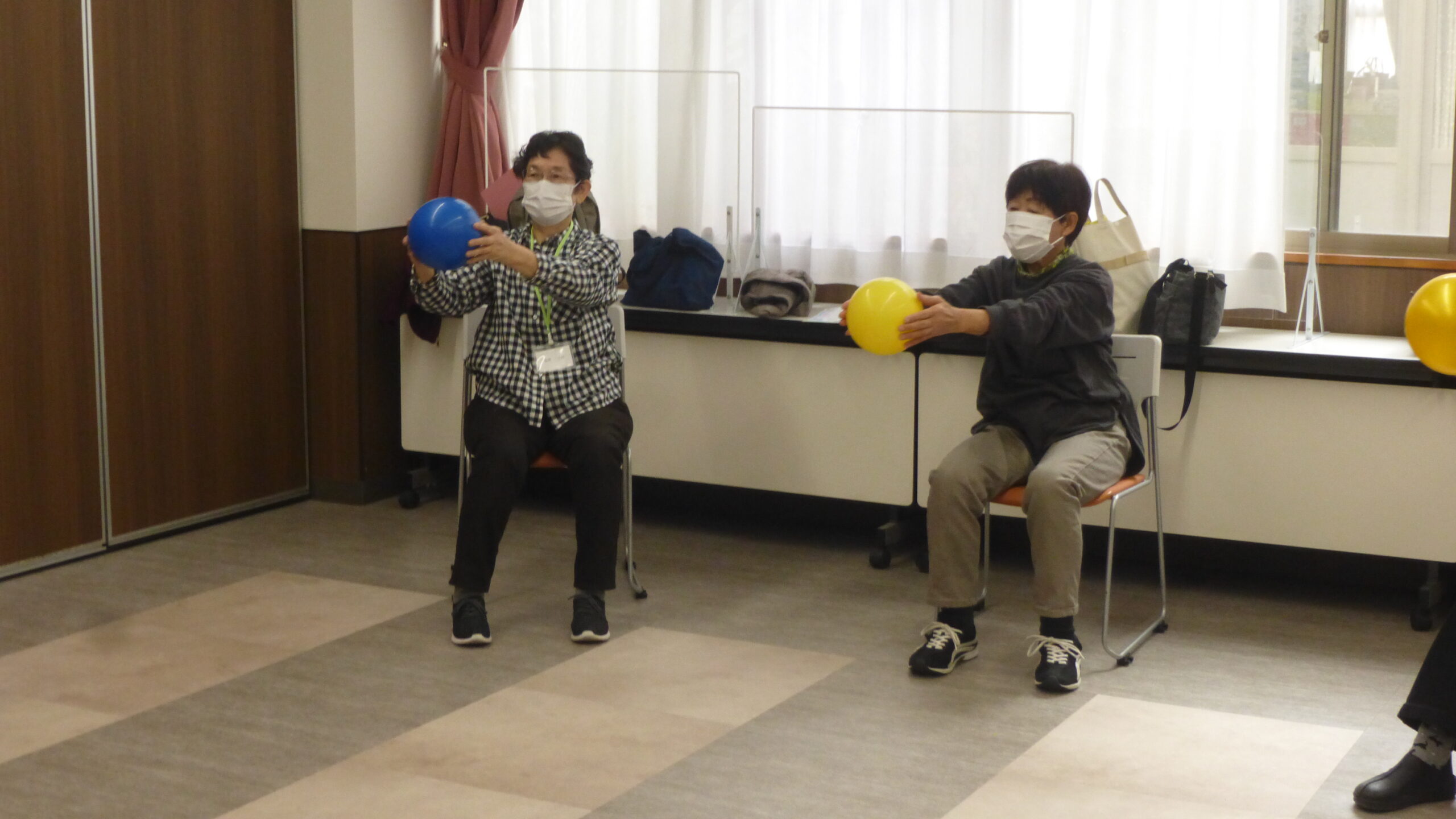 そのため、家でもできるようなボールや椅子に座ったまま行う簡単なストレッチを紹介し、ご自宅での自主トレで体力維持を図るものです。