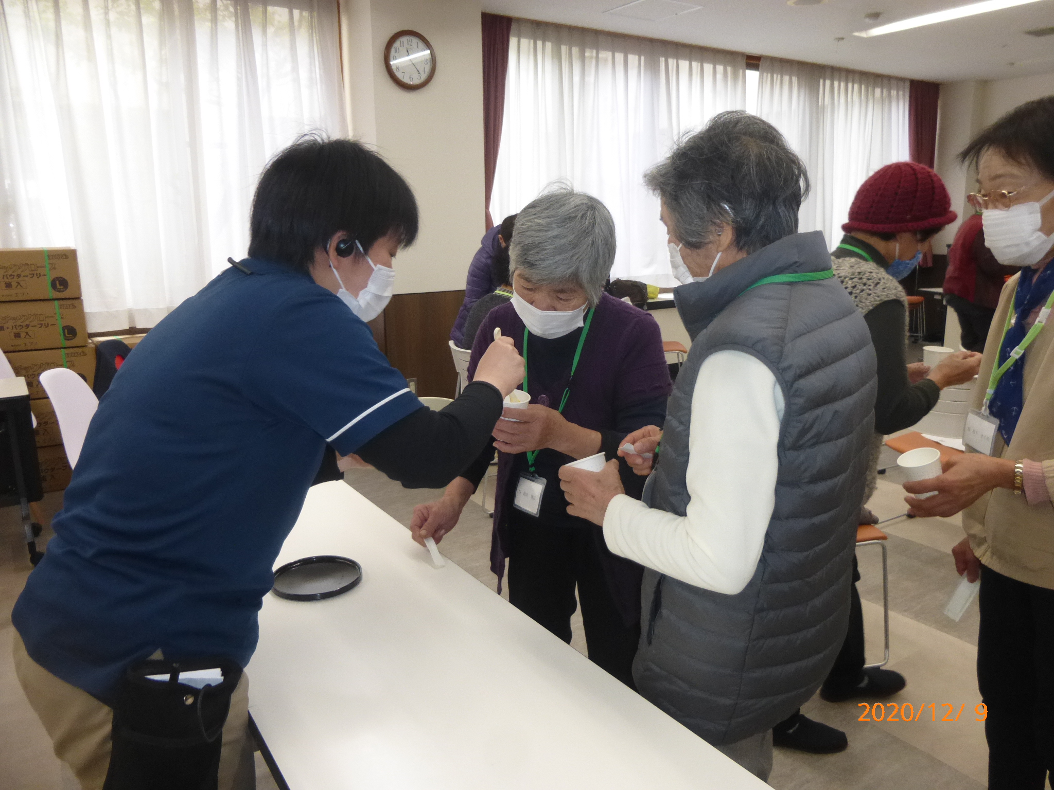 こうろくの食事体験~介護食を食べて見ましょう~を行い、コロナウイルス、インフルエンザ、ノロウイルスから身を守る為、家でも出来る感染症予防を紹介しました。