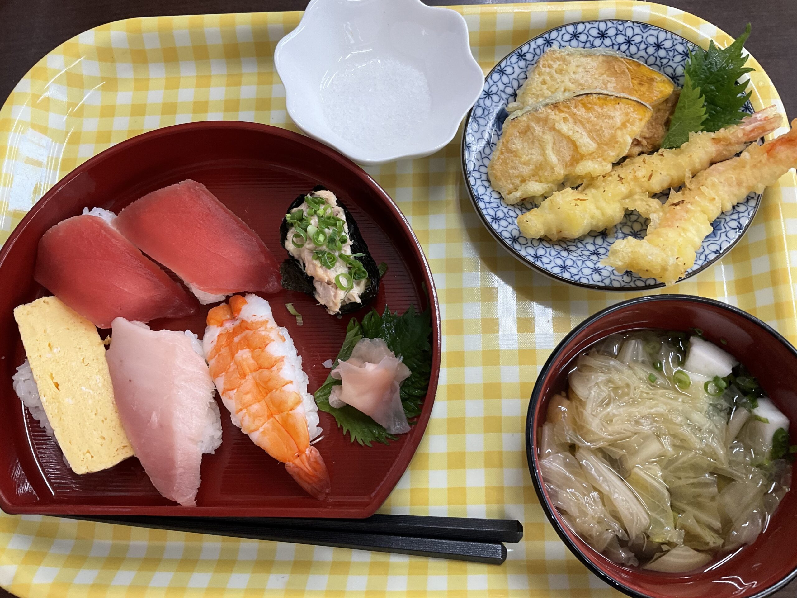 お昼は調理の職員がお寿司を握り、天ぷらを揚げてくれました。