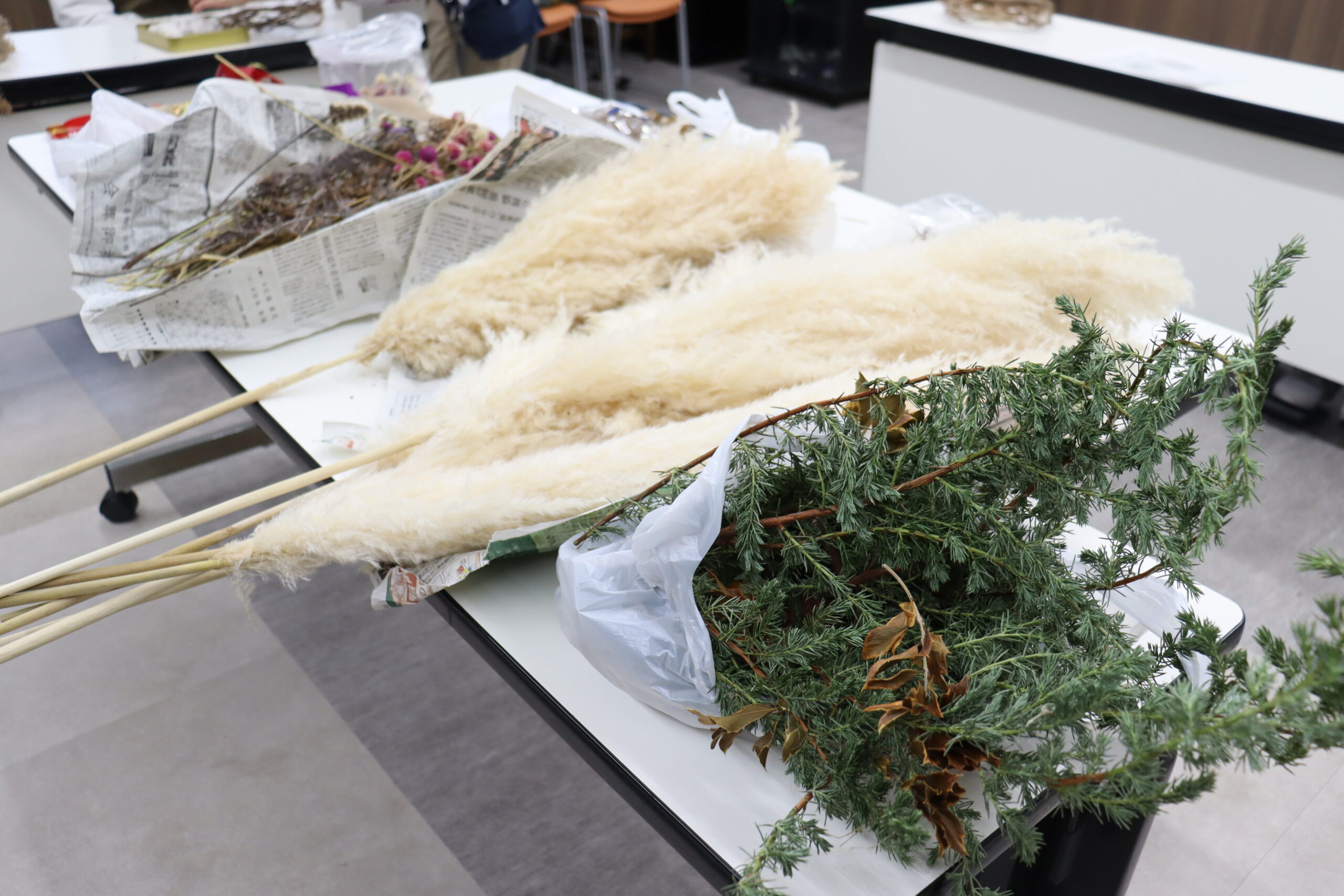 パンパスグラス、シソの実、モミの木、本物の綿花、どんぐり、ツバキの実、ケイトウや千日紅・ミモザのドライフラワーなど。