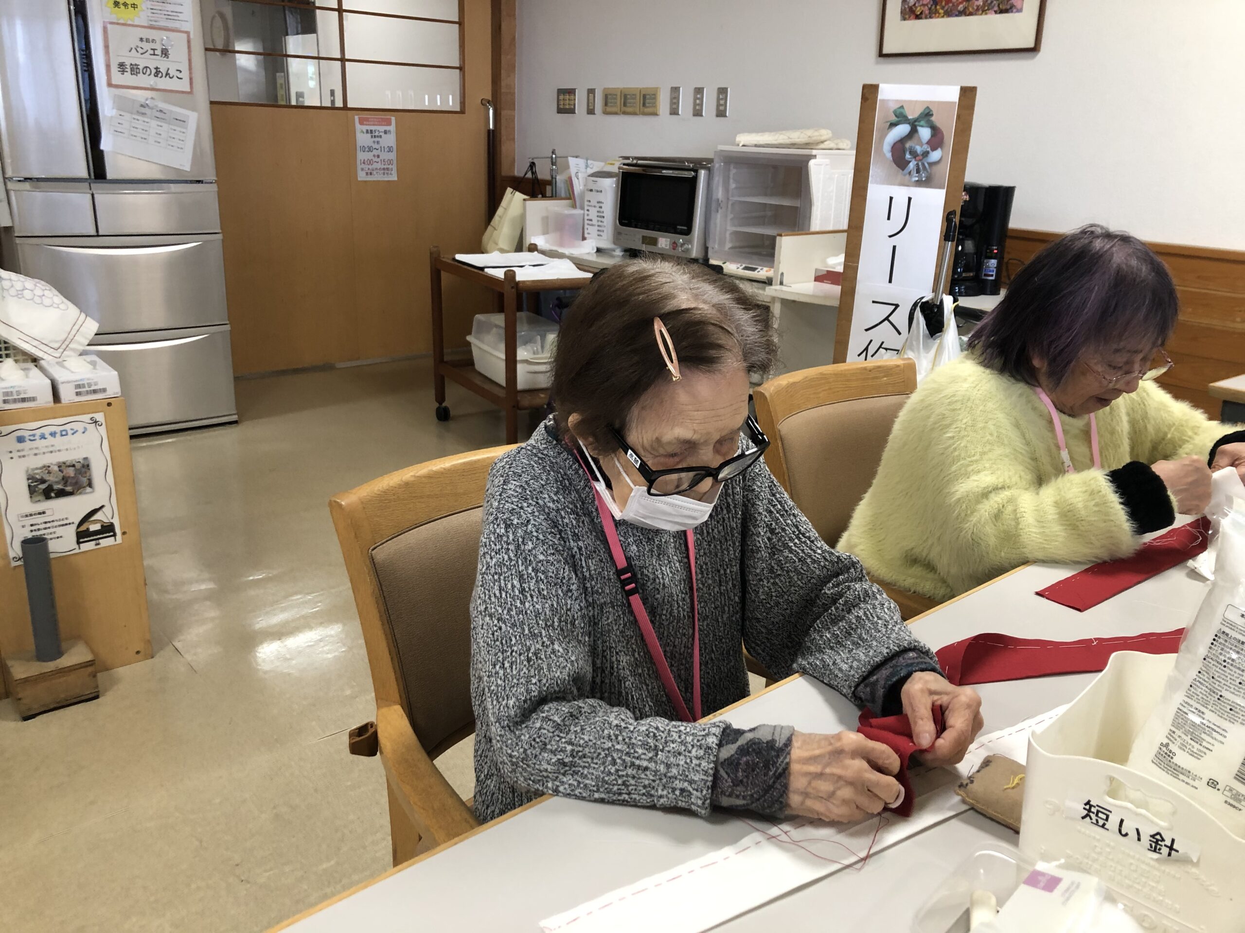 季節を感じながら、残存機能を生かして制作活動を行う手芸クラブでこの季節にぴったりなクリスマス&お正月リース作りを実施しました。