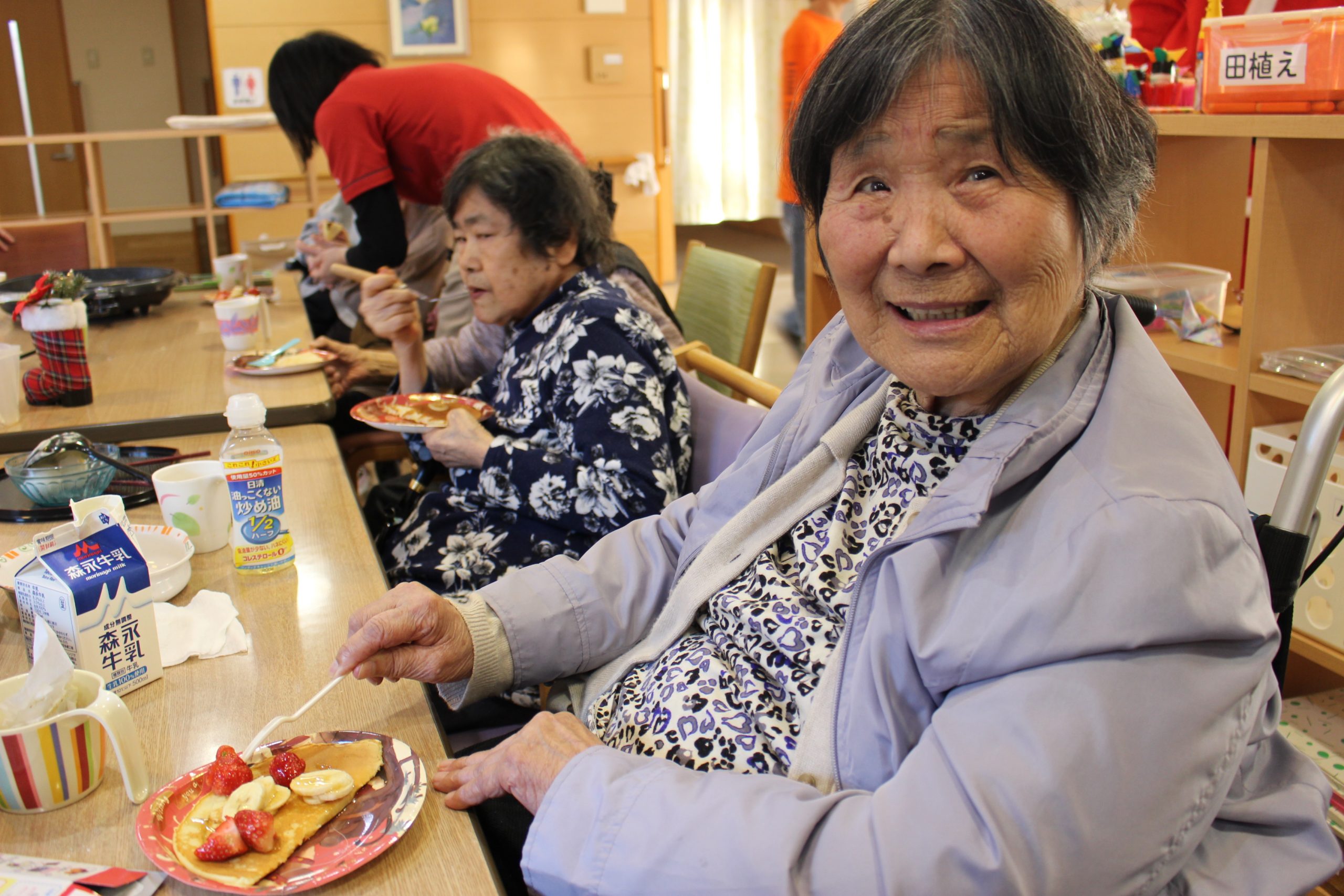 職員とお客様でホットプレートを囲んでホットケーキを作りました。