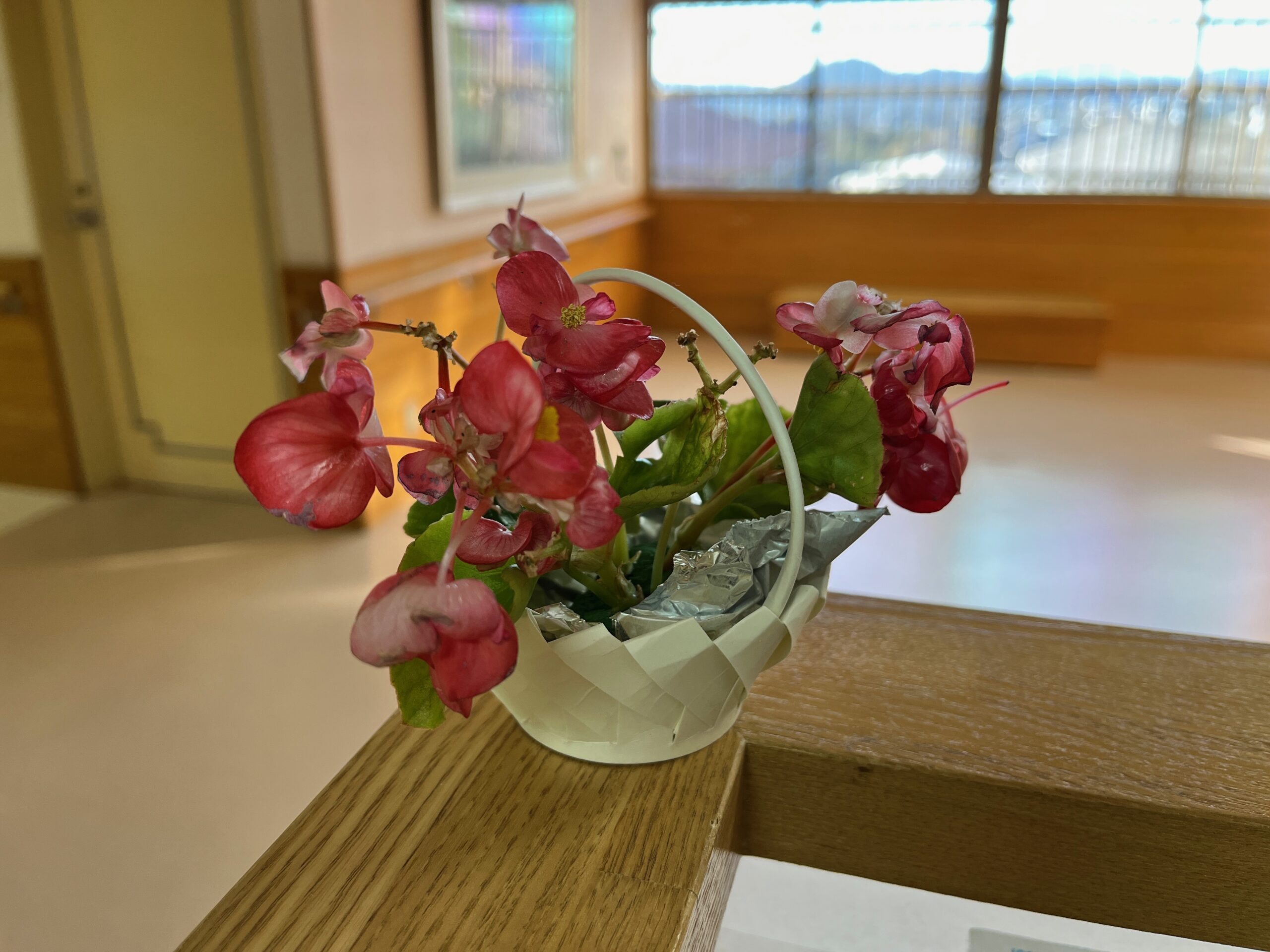 職員手作りのカゴを作って、お花を飾りました。