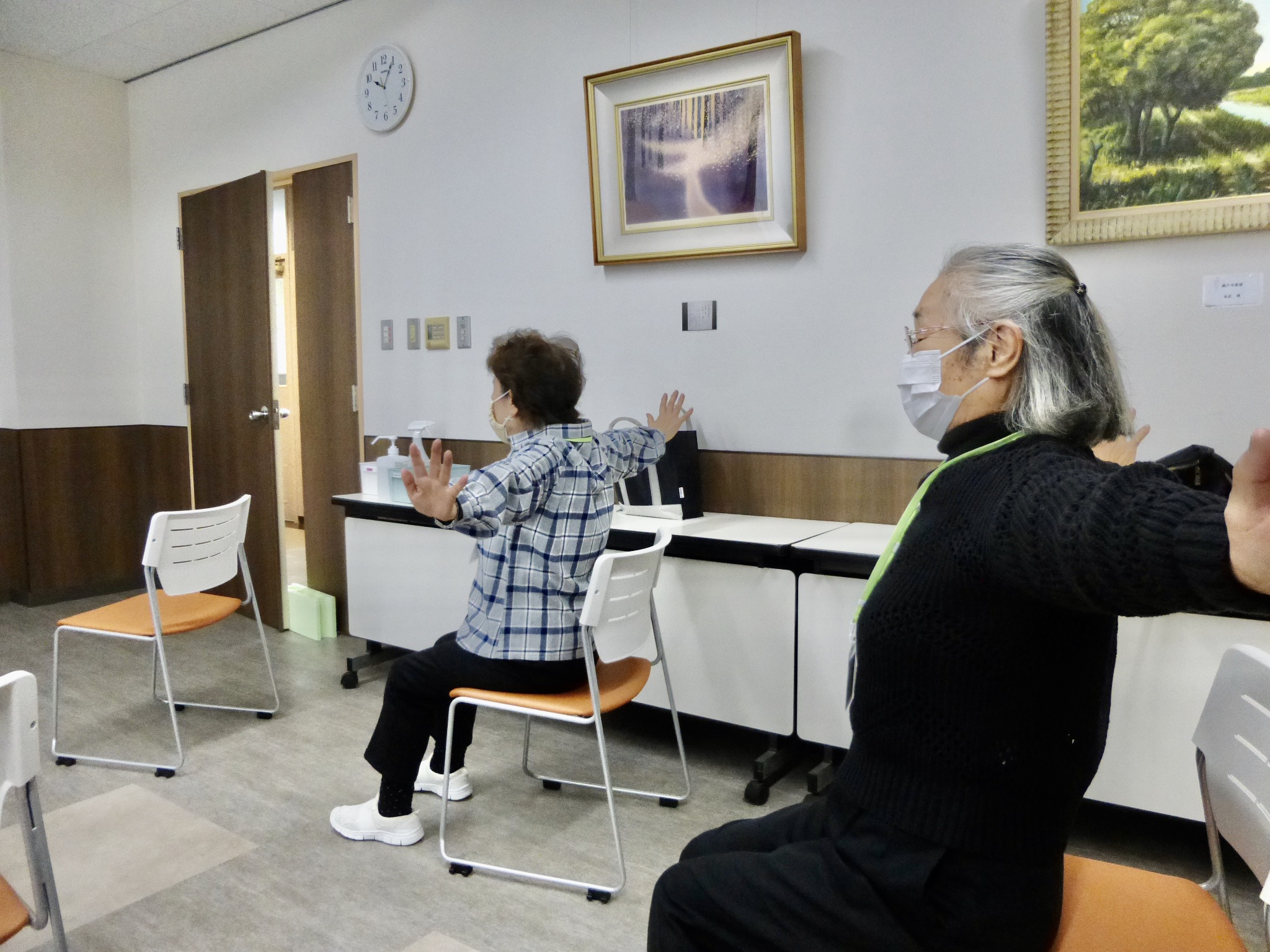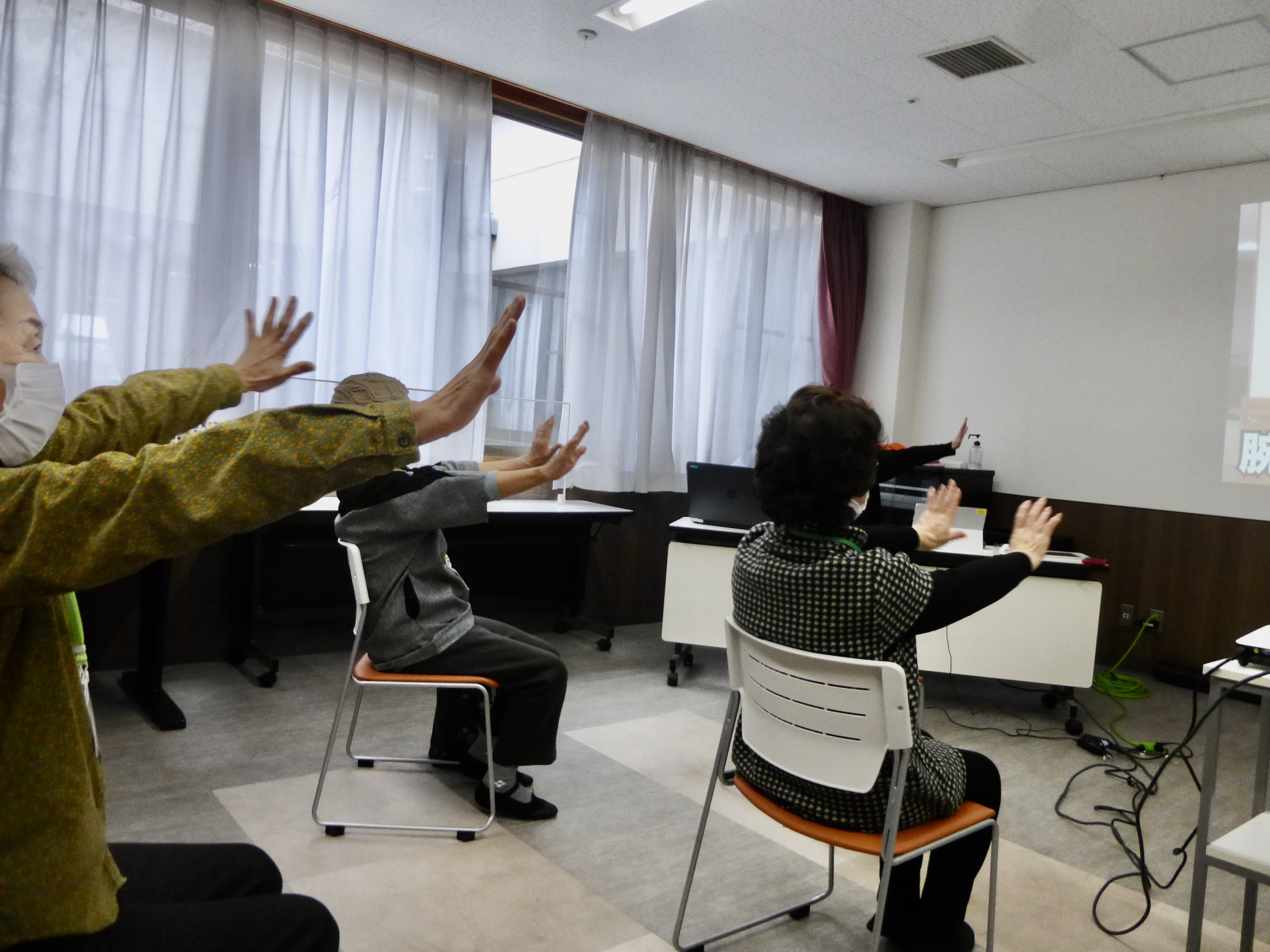 食べる動作で使う上腕や手、口を動かす体操を行い、講座は終了。