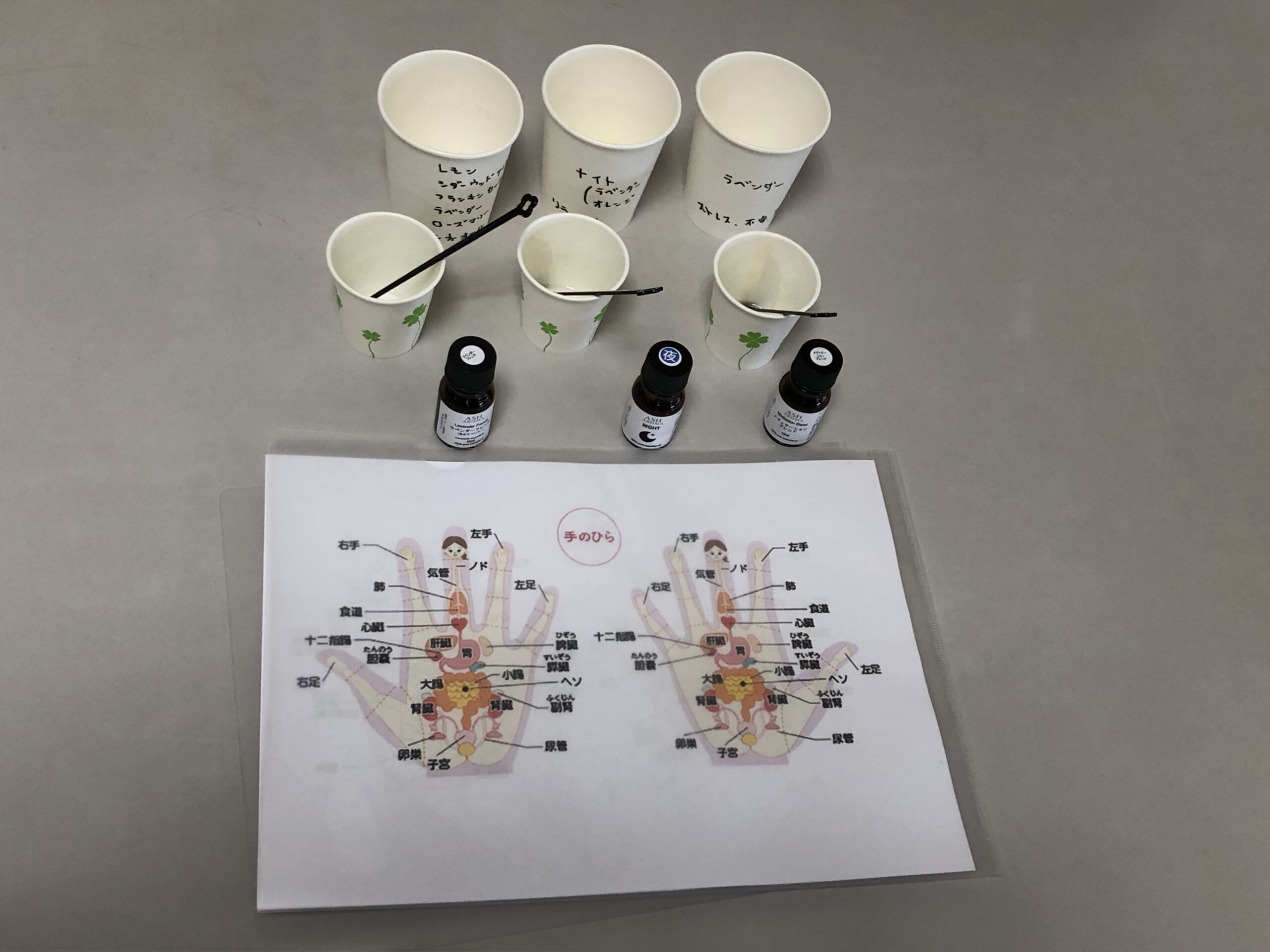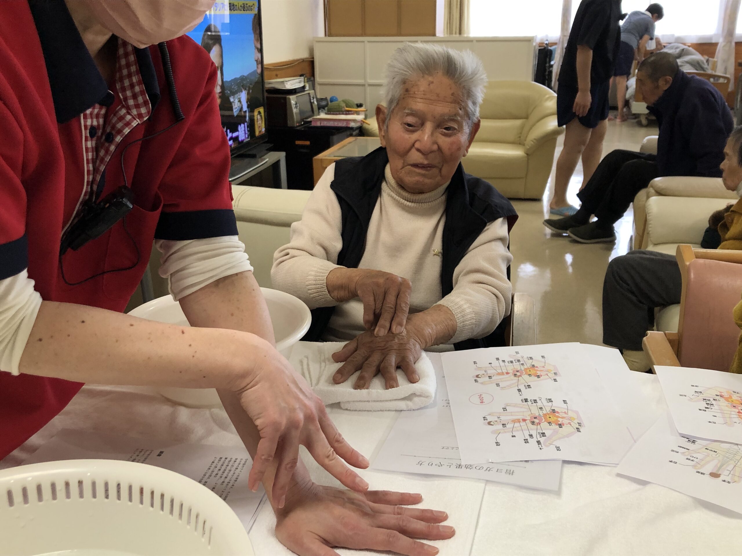 終了後、両手のツボのイラストと説明の用紙を差し上げると