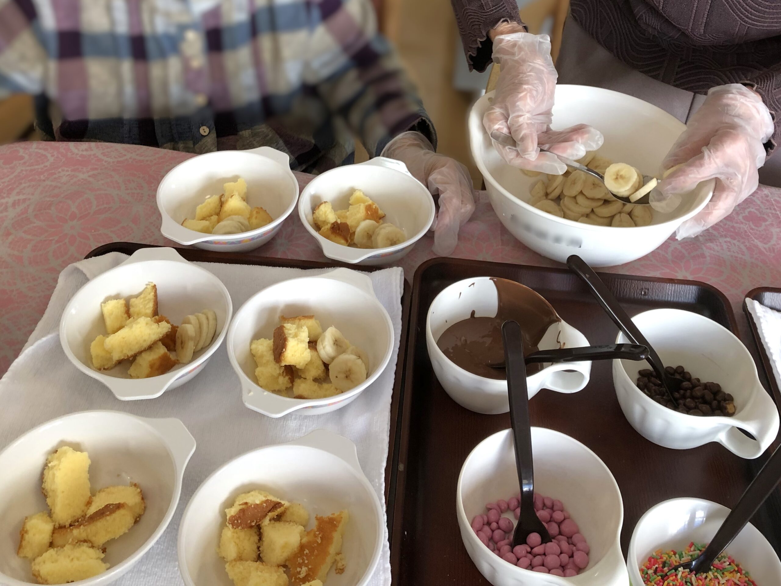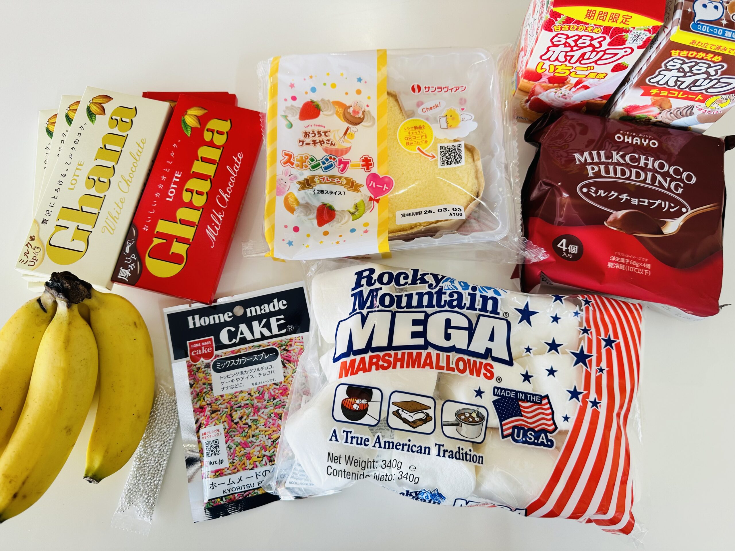 作るお菓子は、マシュマロやバナナなどの具材にカラフルなチョコレートをトッピングするというもの。