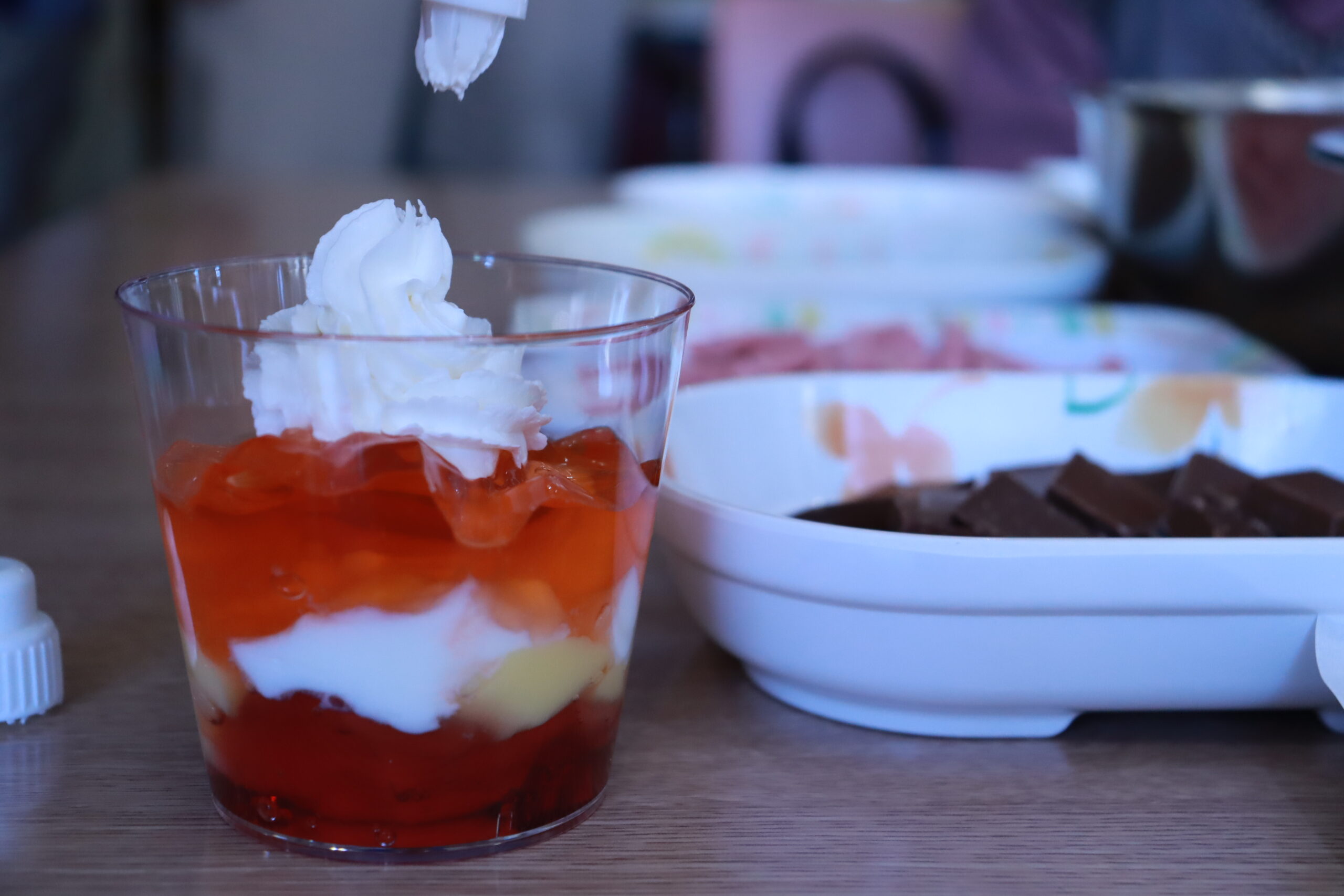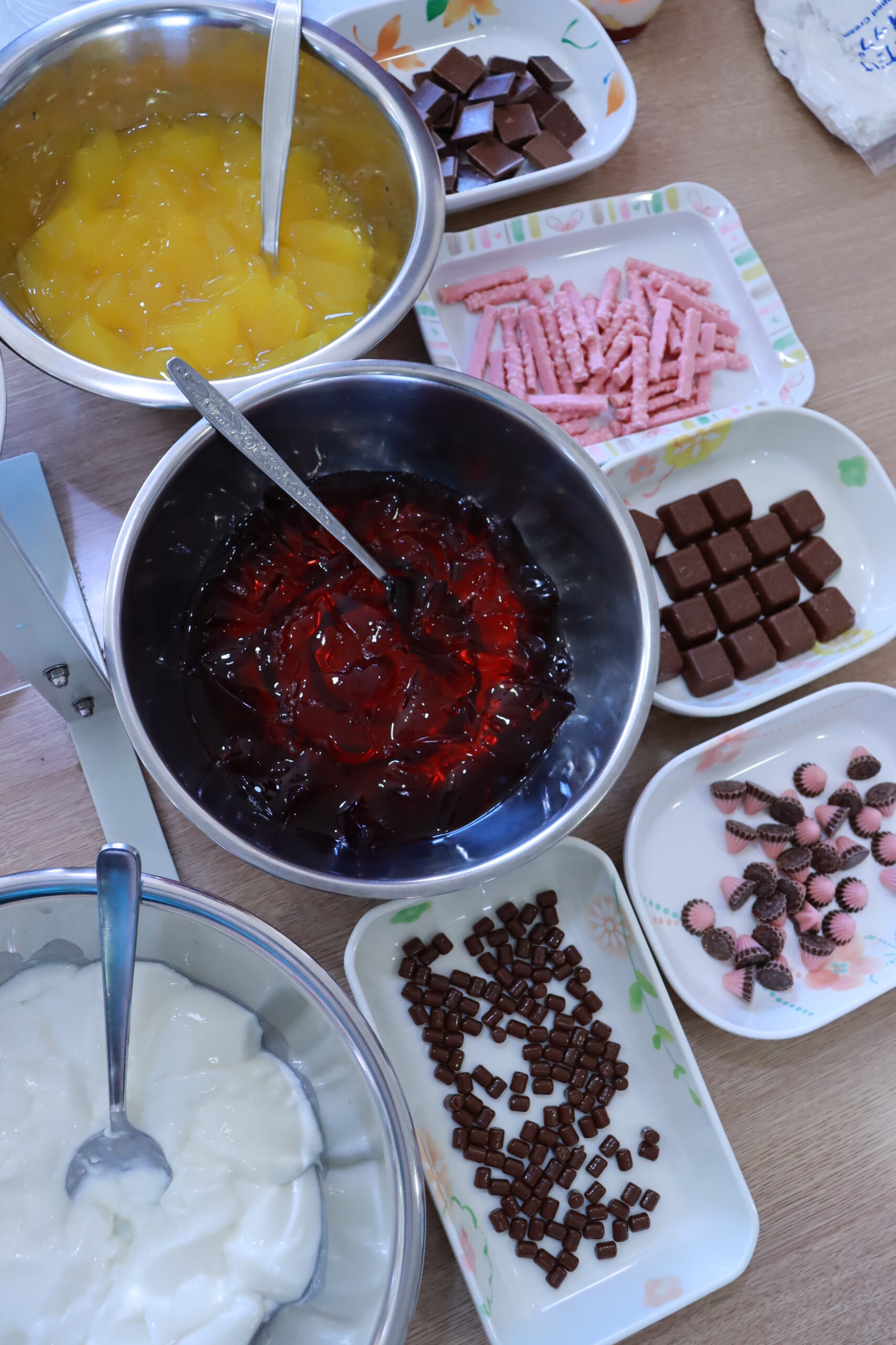 透明なカップに自分で選んだカラフルなゼリーやプリンを入れて、チョコレートをトッピング!