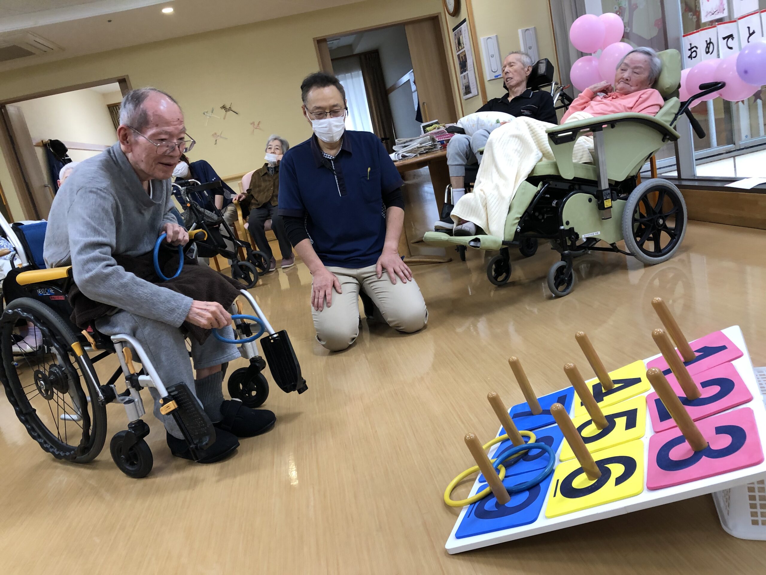 お祝いの後にはレクリエーションとして輪投げ大会、リハビリ体操をして体を動かしました。