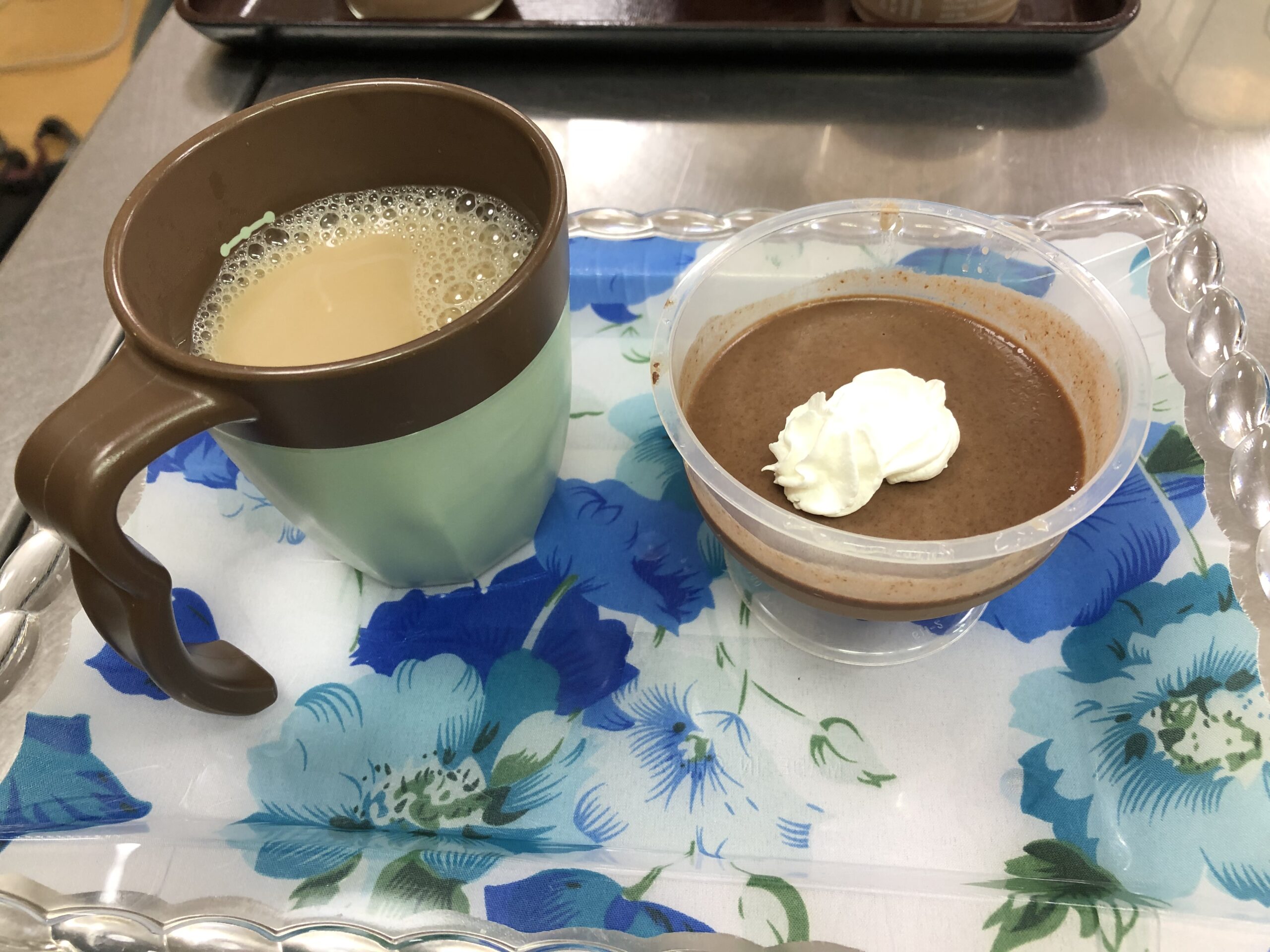 おやつは皆さんが食べやすく、好評なチョコプリン。