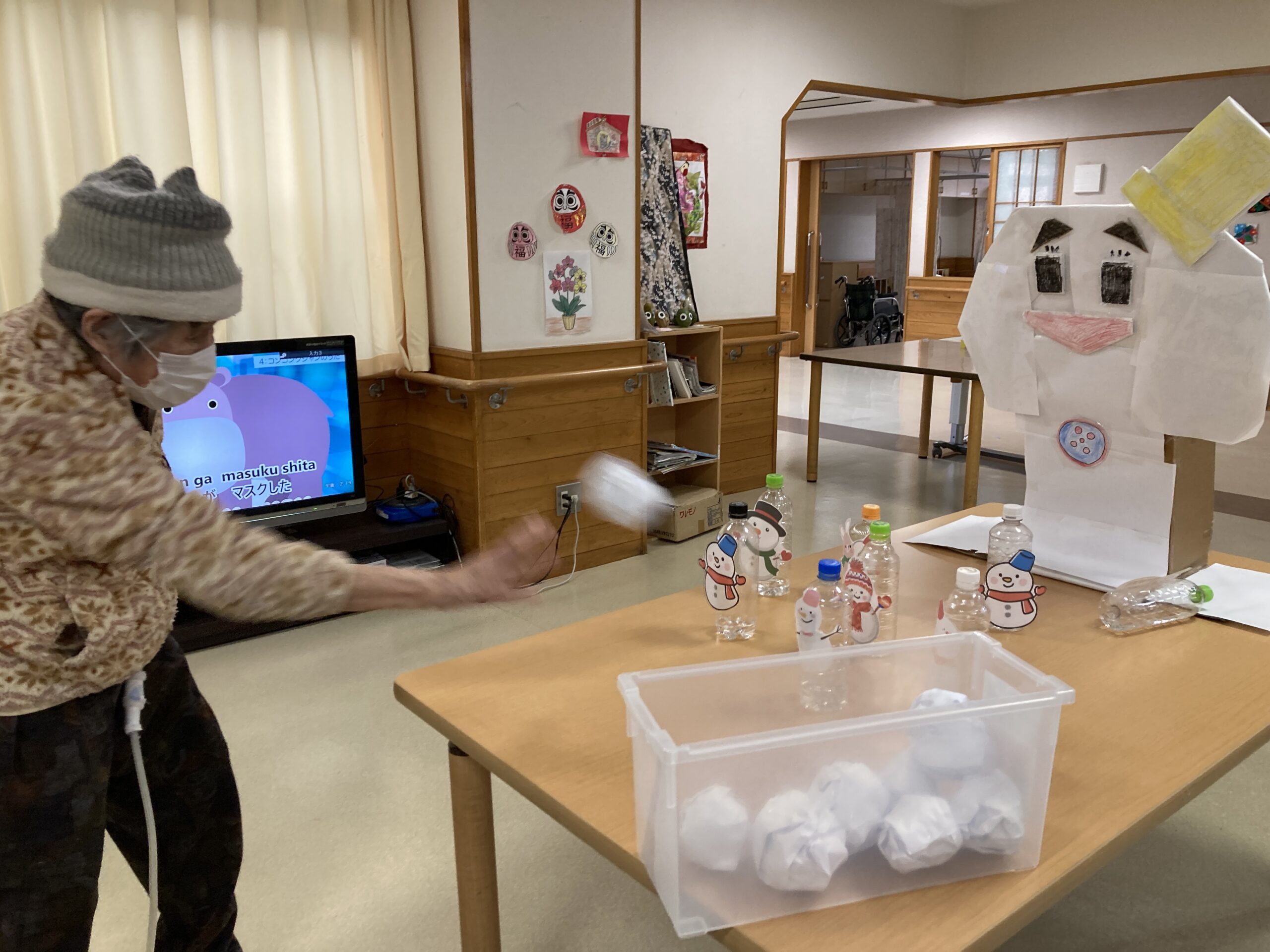 雪玉に見立てた紙玉や大小の雪だるまの的を並べていると、
