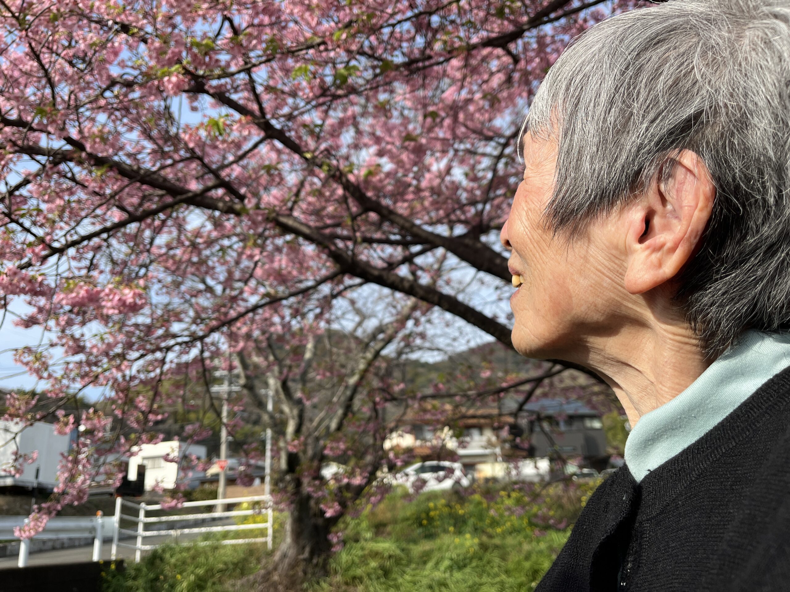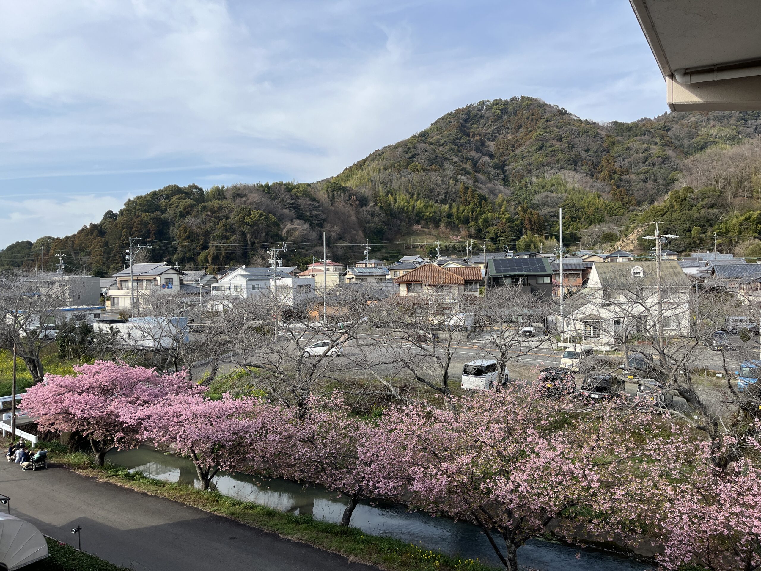 手前は河津桜、奥の並木がソメイヨシノです。