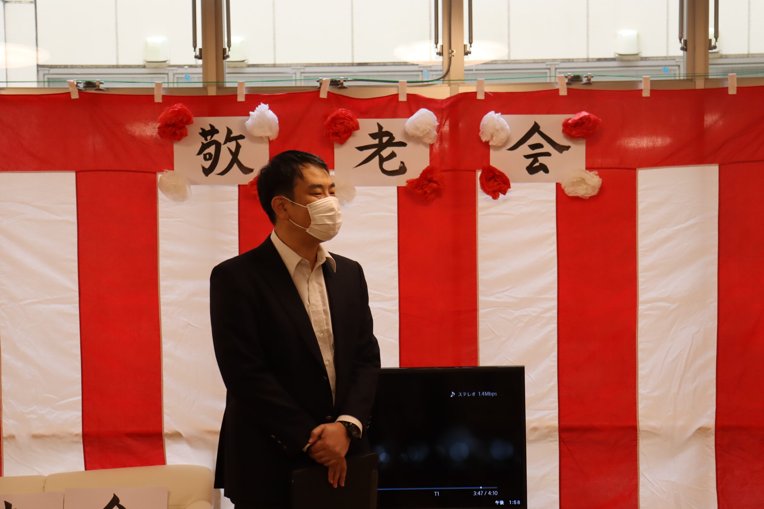 施設長が長寿にまつわるクイズを出したうえであいさつし、リラックスした雰囲気での開会になりました。