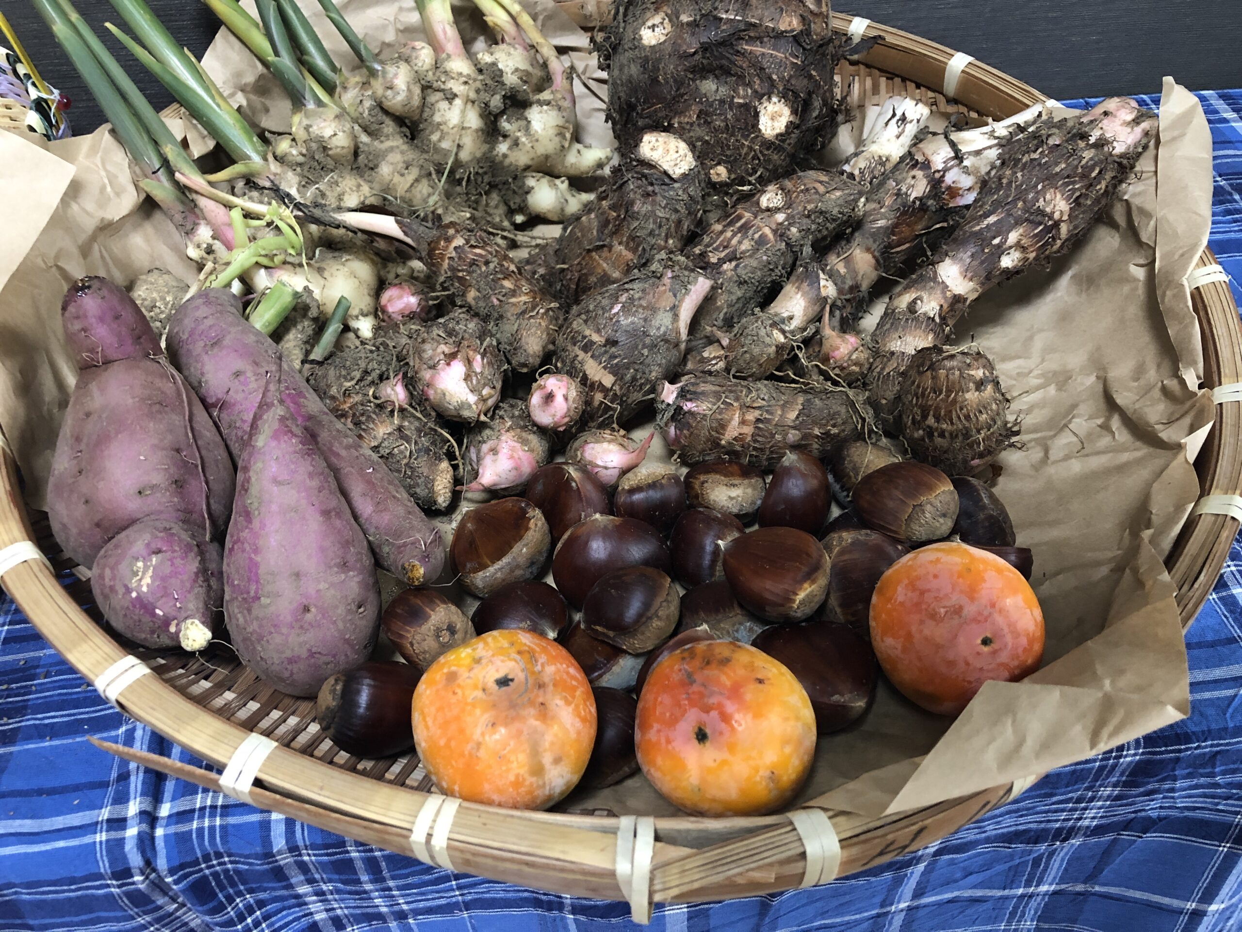 9月は秋ナス あかね芋 石川小芋 栗 ししとう オクラ ピーマン しょうがを収穫しました。