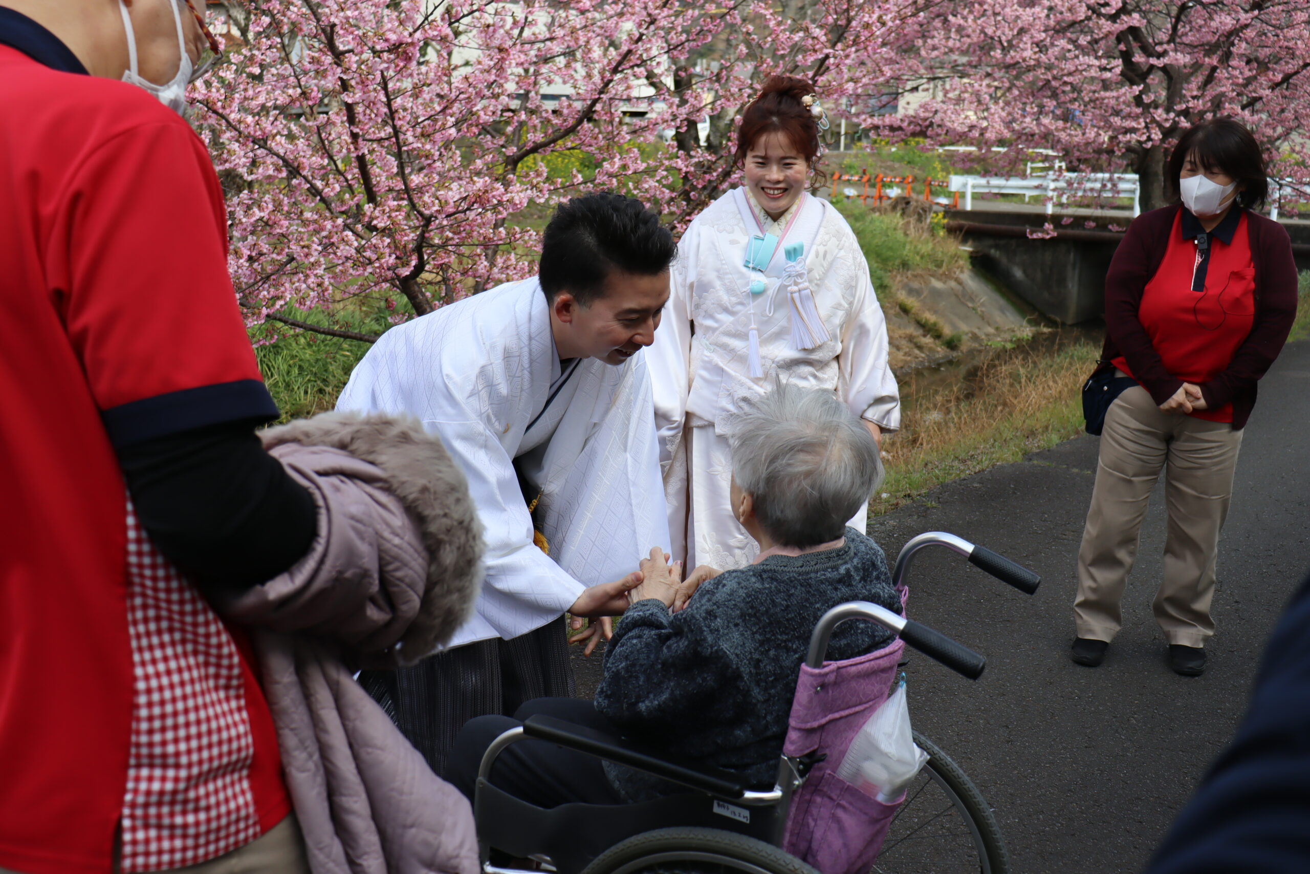 久しぶりの外出、久しぶりのご家族との談笑に季節や近況のお話にも背景の桜と同じように花が咲きます。