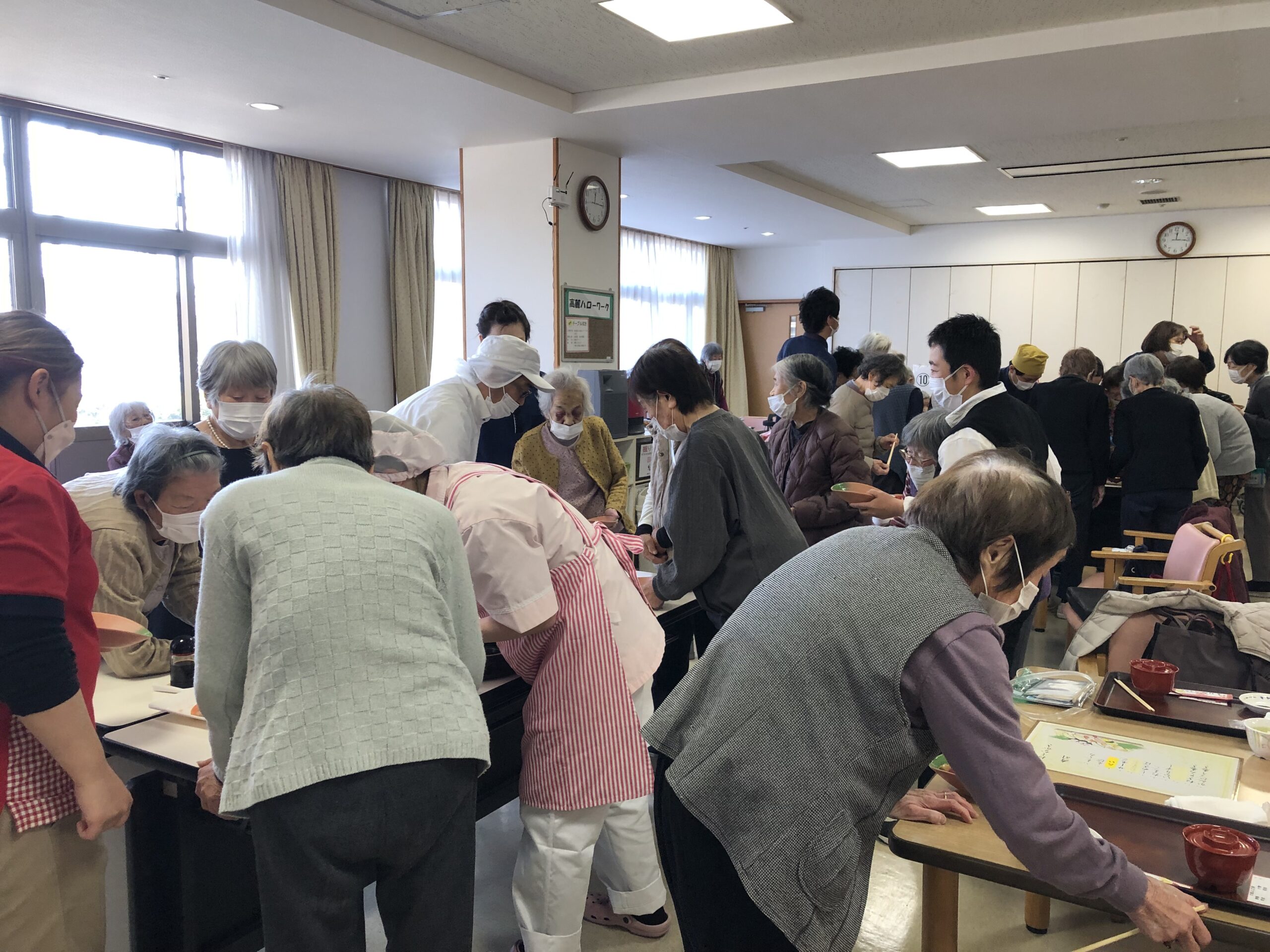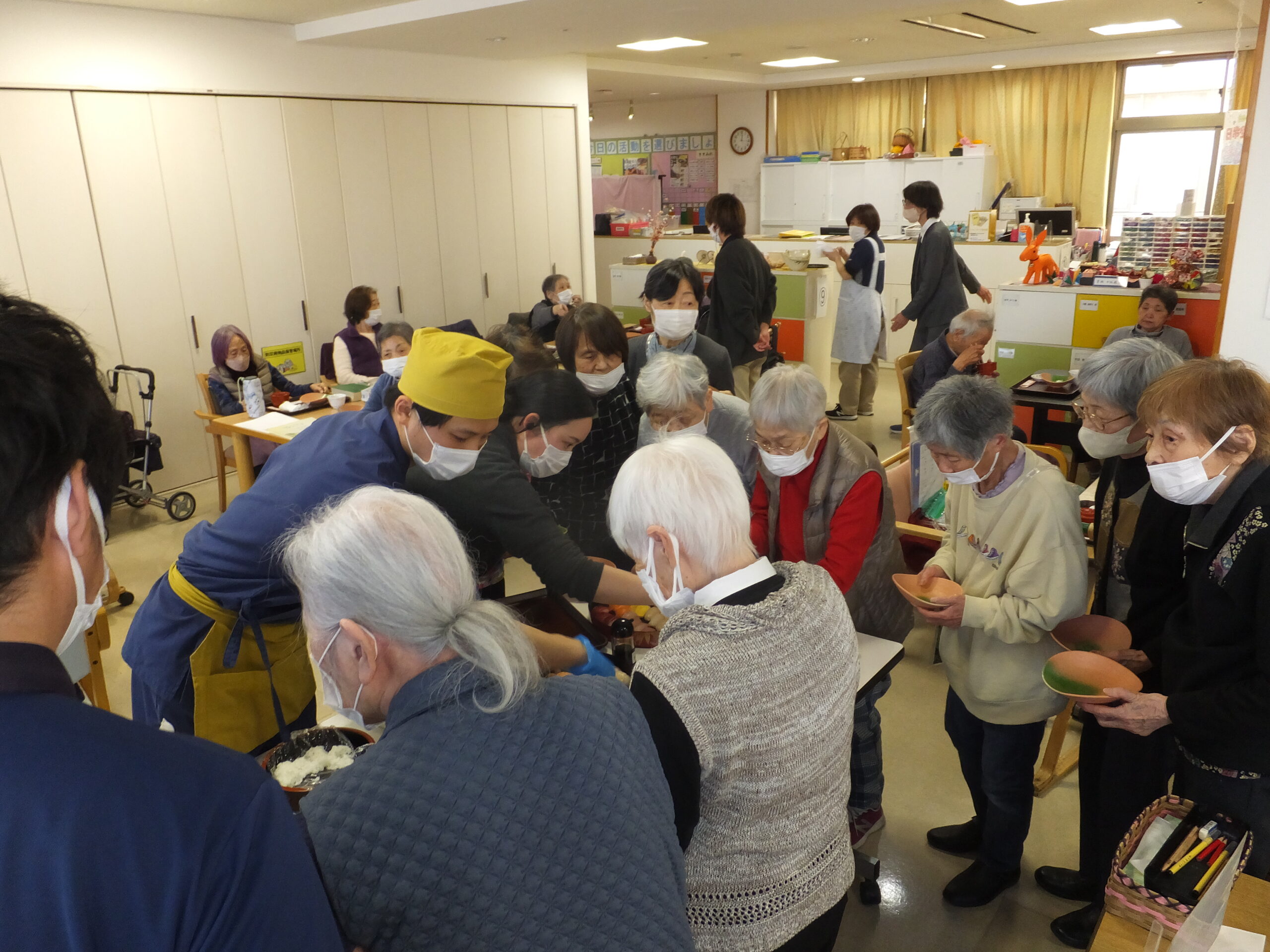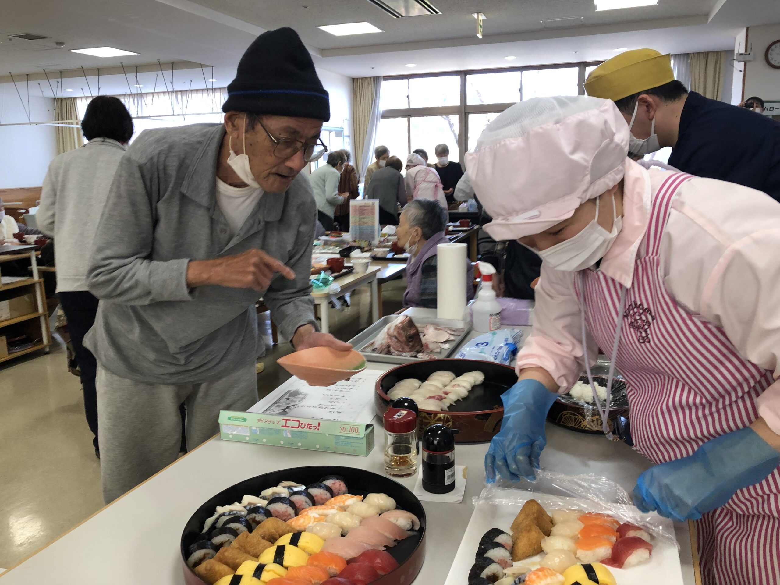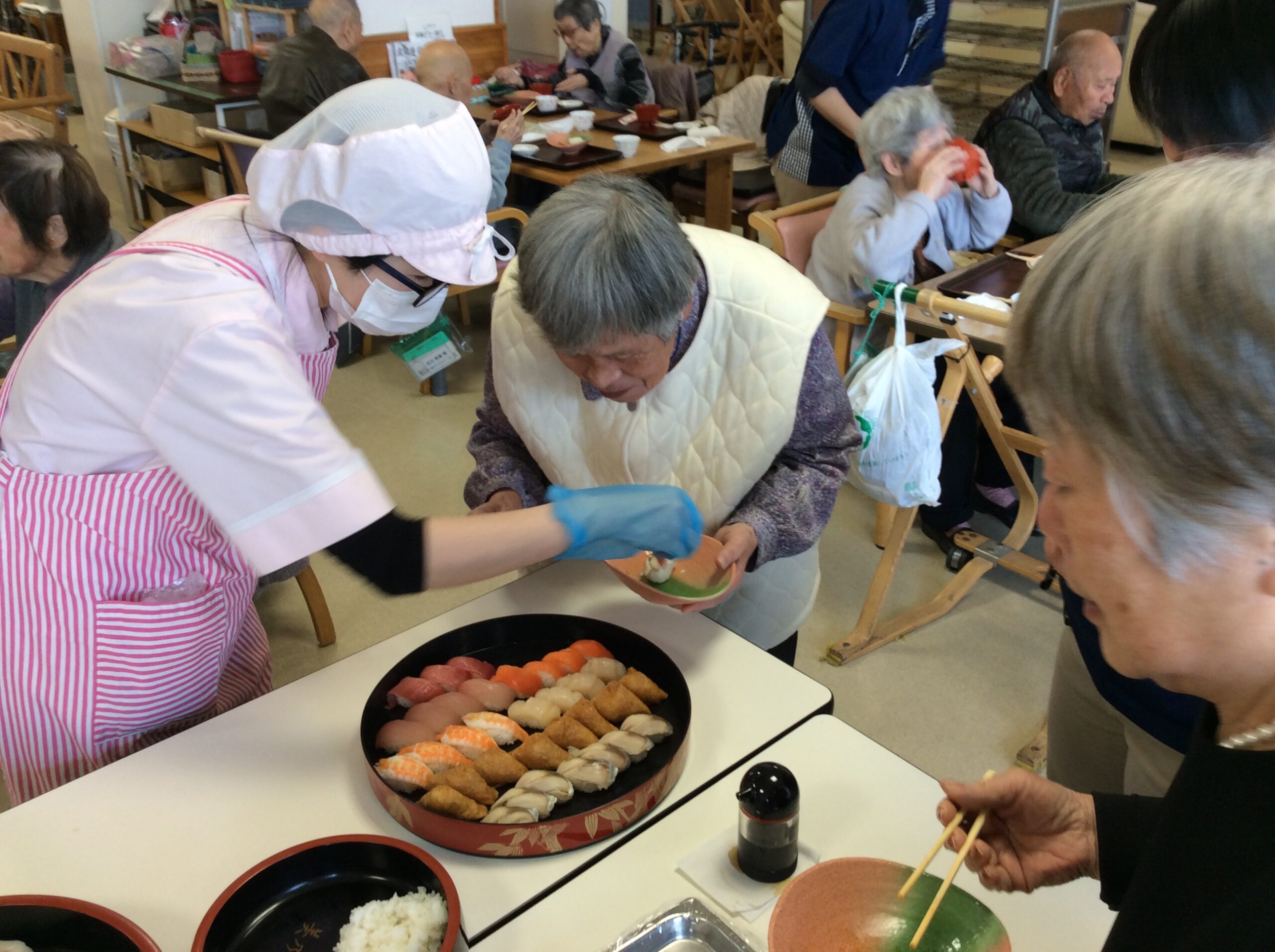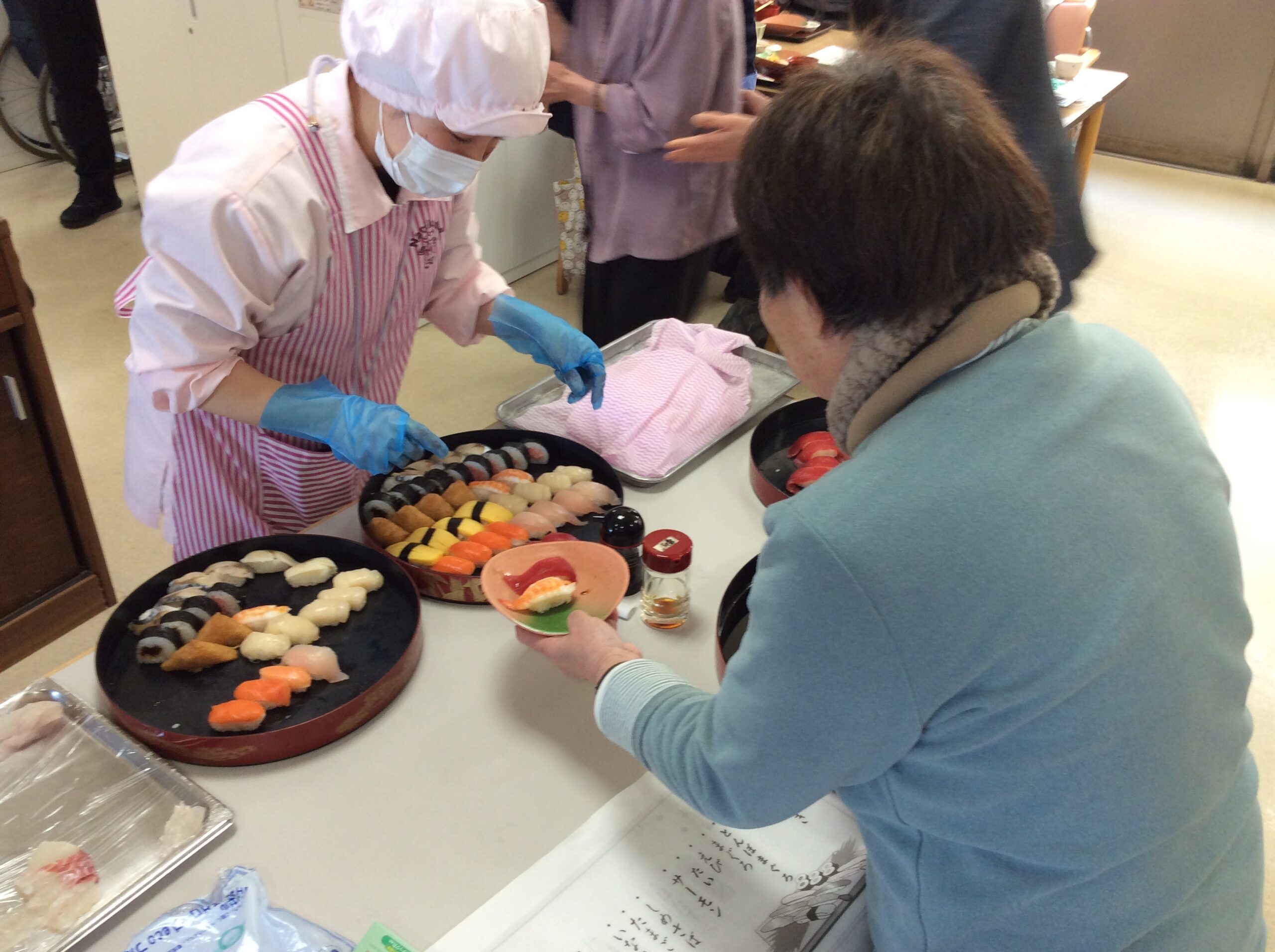 1年デイサービスでの活動を頑張っていただいた皆様に楽しんでいただくべく、人気の高い「寿司バイキング」企画を実施しました。