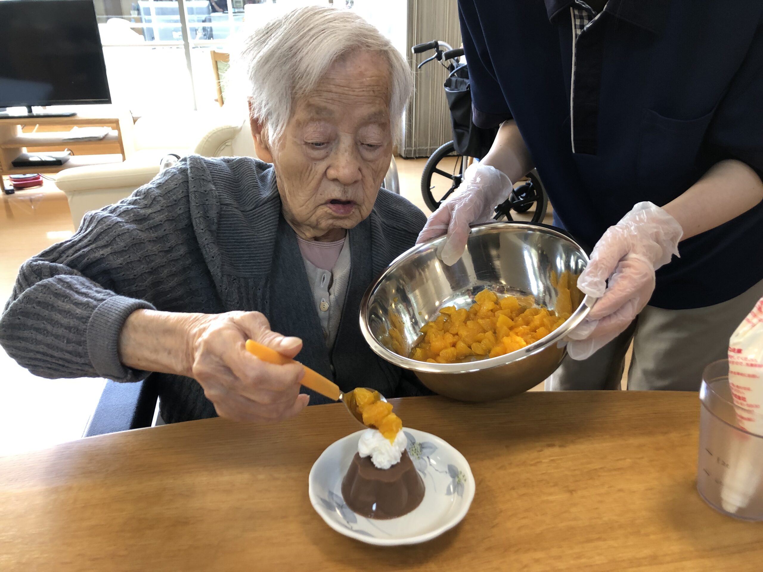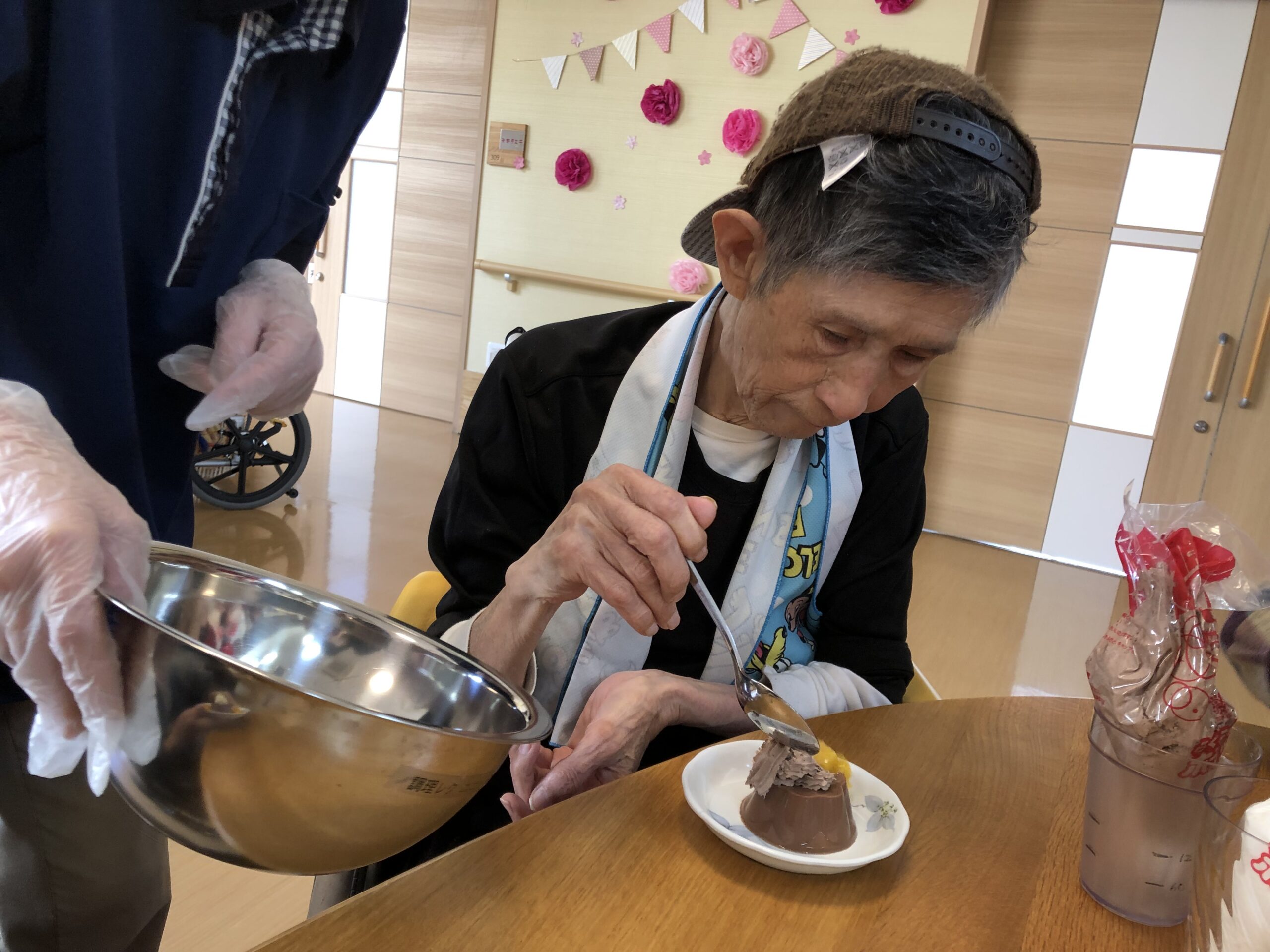 普段あまり口にされないチョコレートを久しぶりに味わっていただきたいと思い、皆さんが食べられるババロア作りを行いました。
