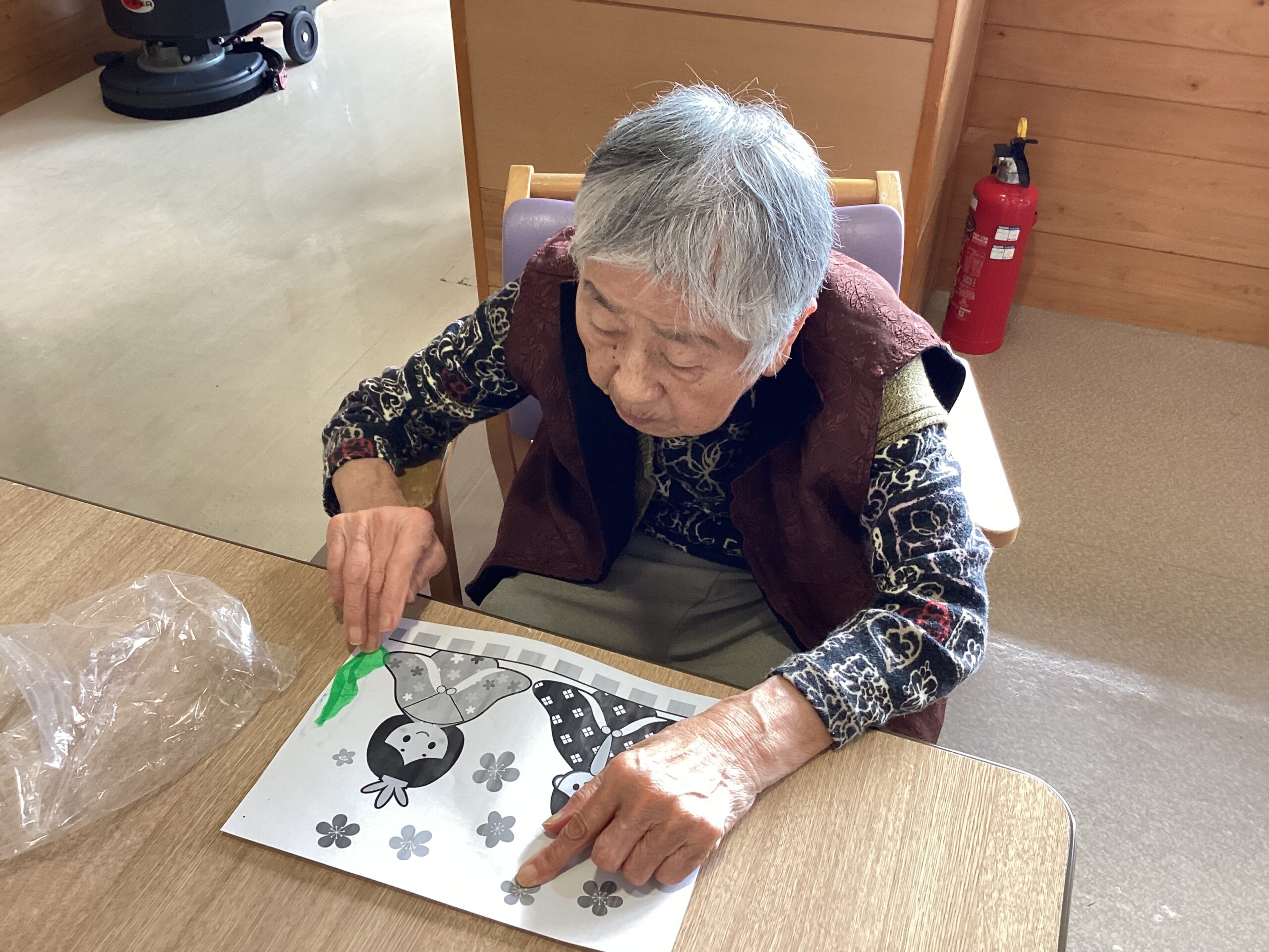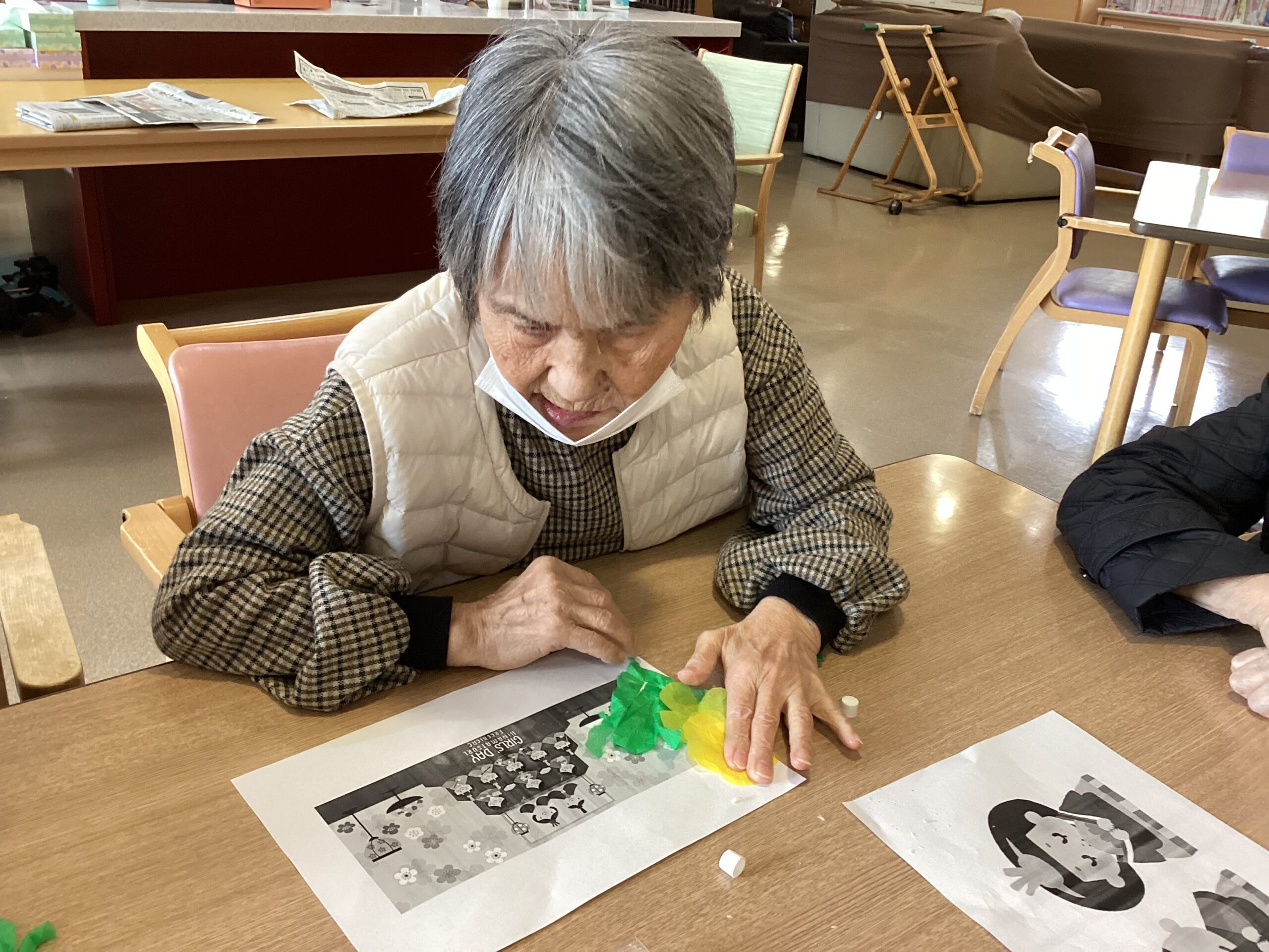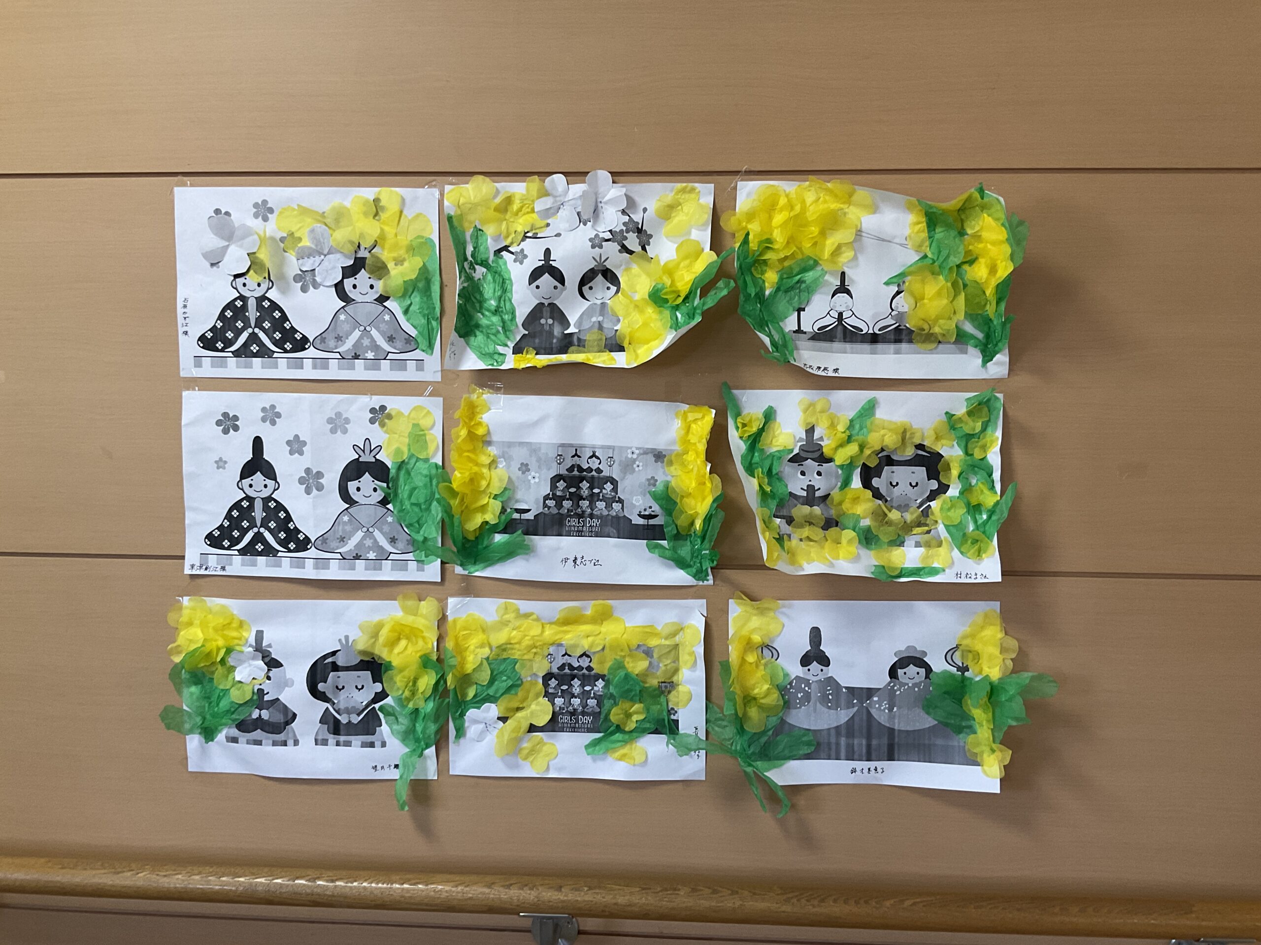 3月といえばのひな祭りのイラストが描かれた用紙を配布し、思い思いに菜の花をモチーフに貼り絵をしていただきました。