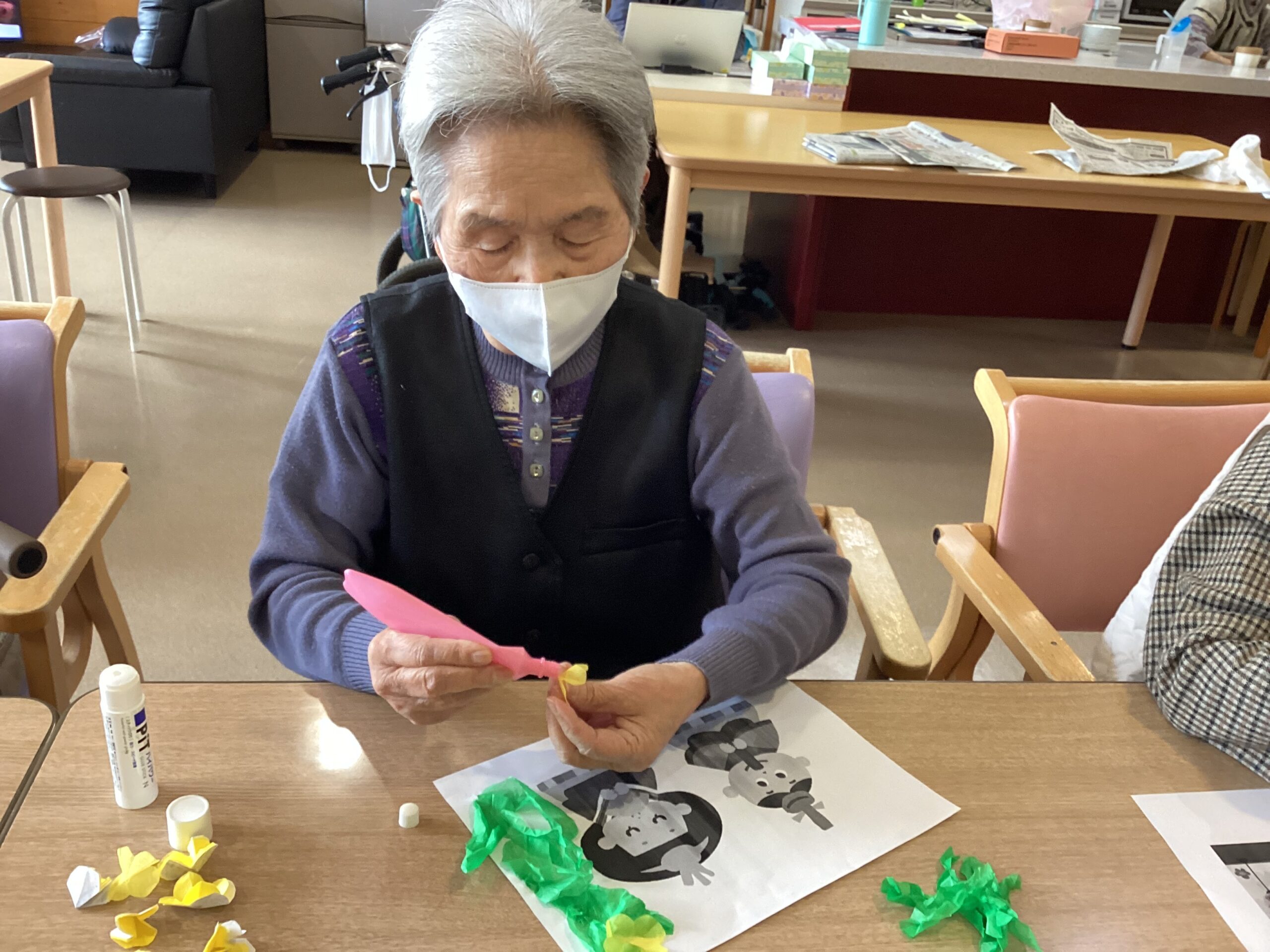 3月の季節を感じていただくため、菜の花の貼り絵レクリエーションを行いました。