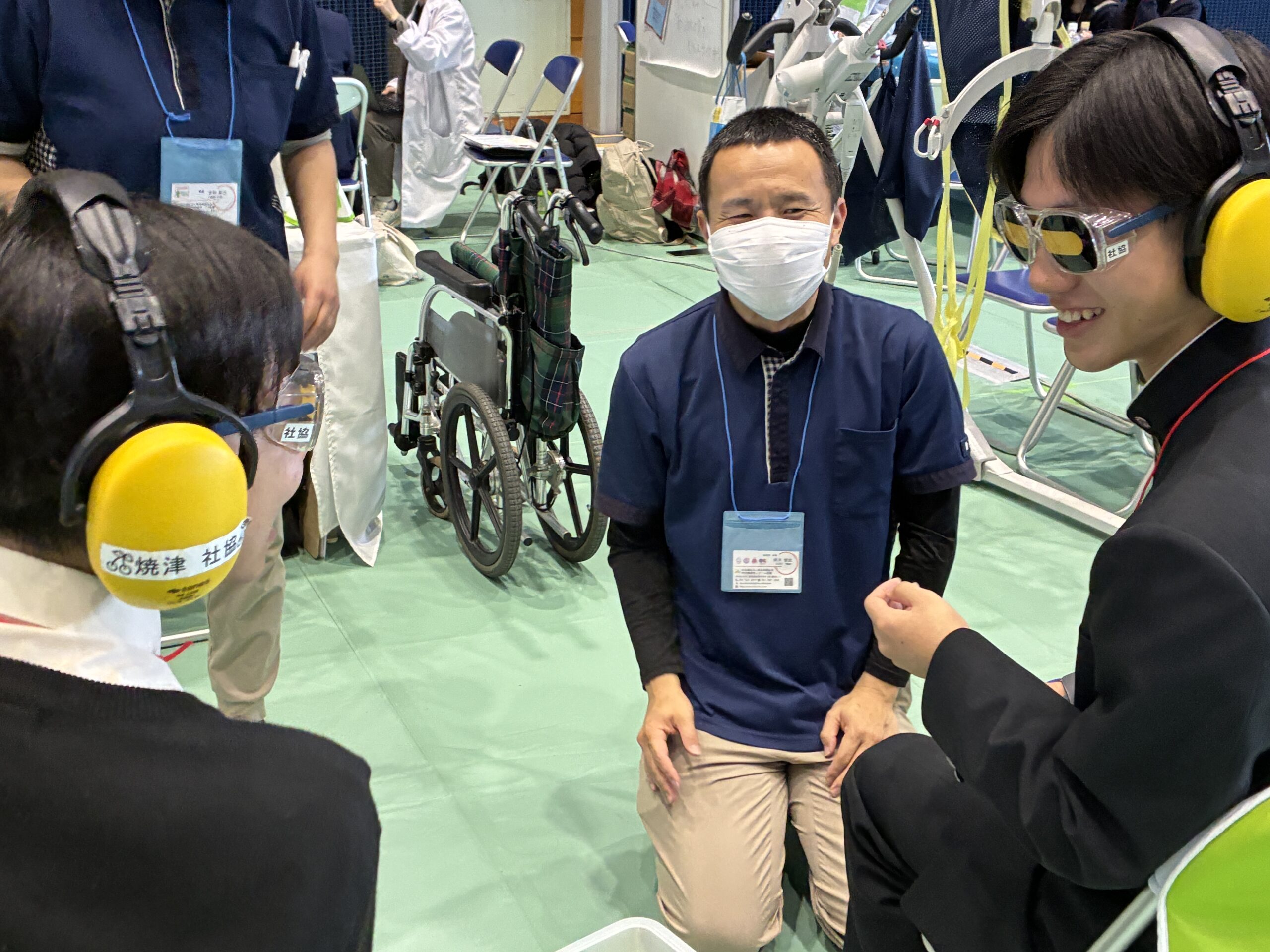 体験はまず、介護される側の高齢者の疑似体験。